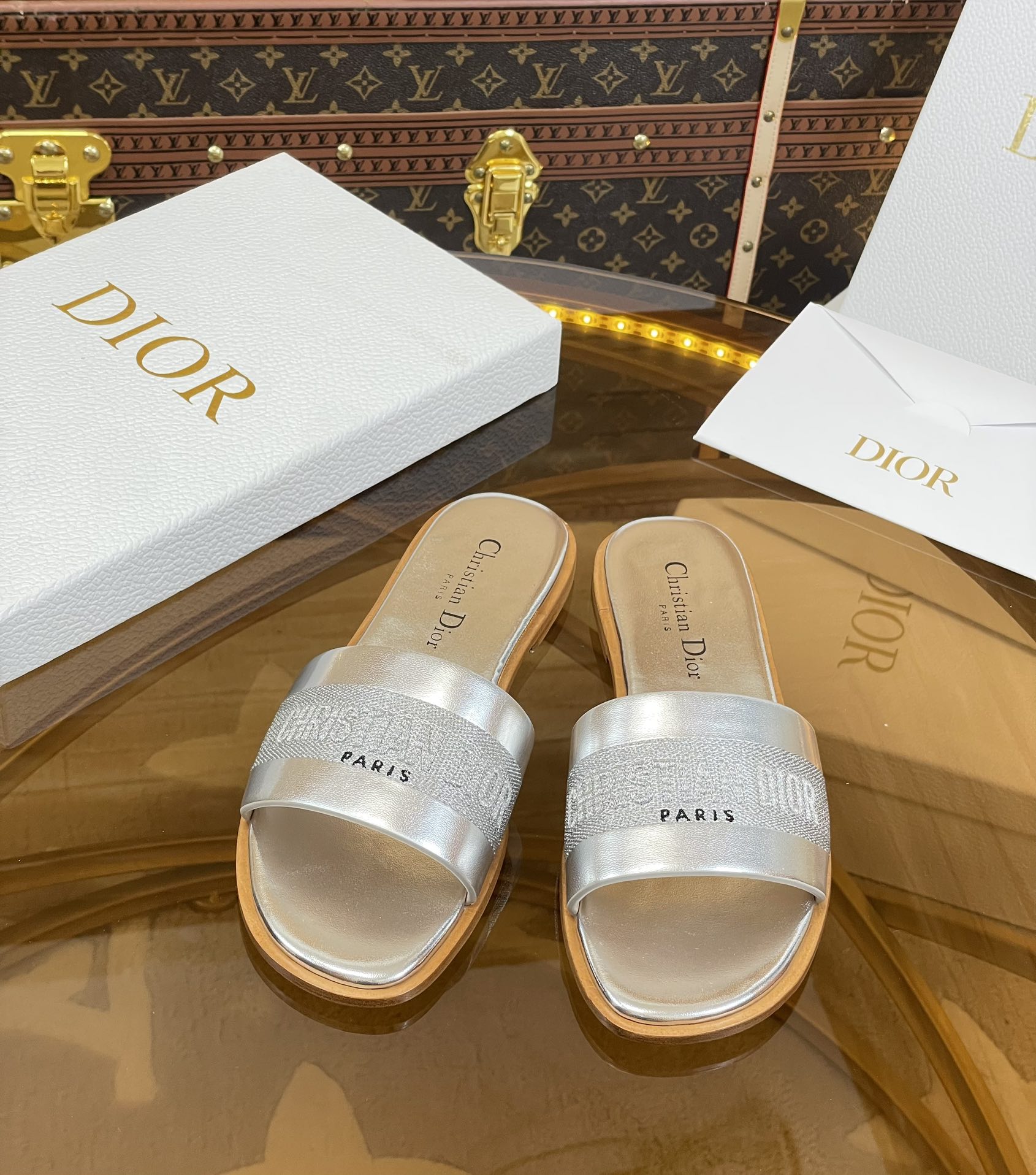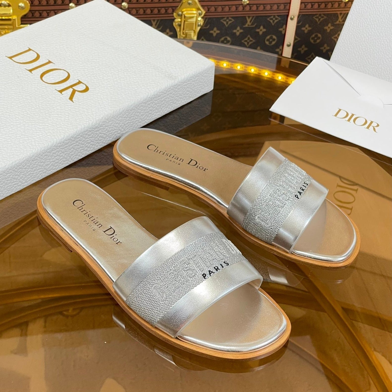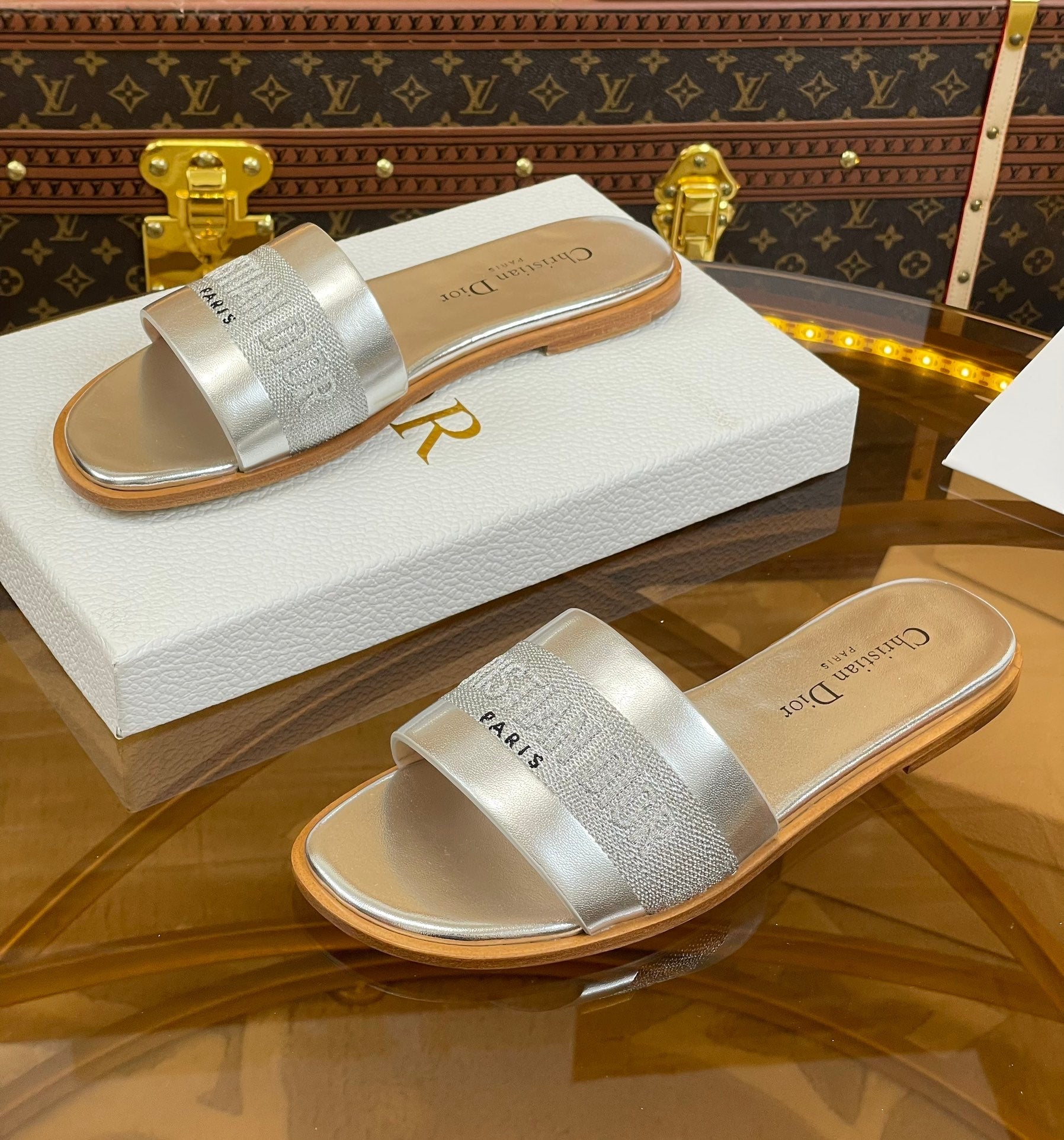 cd slide silver metalic calfskin embroidered cotton