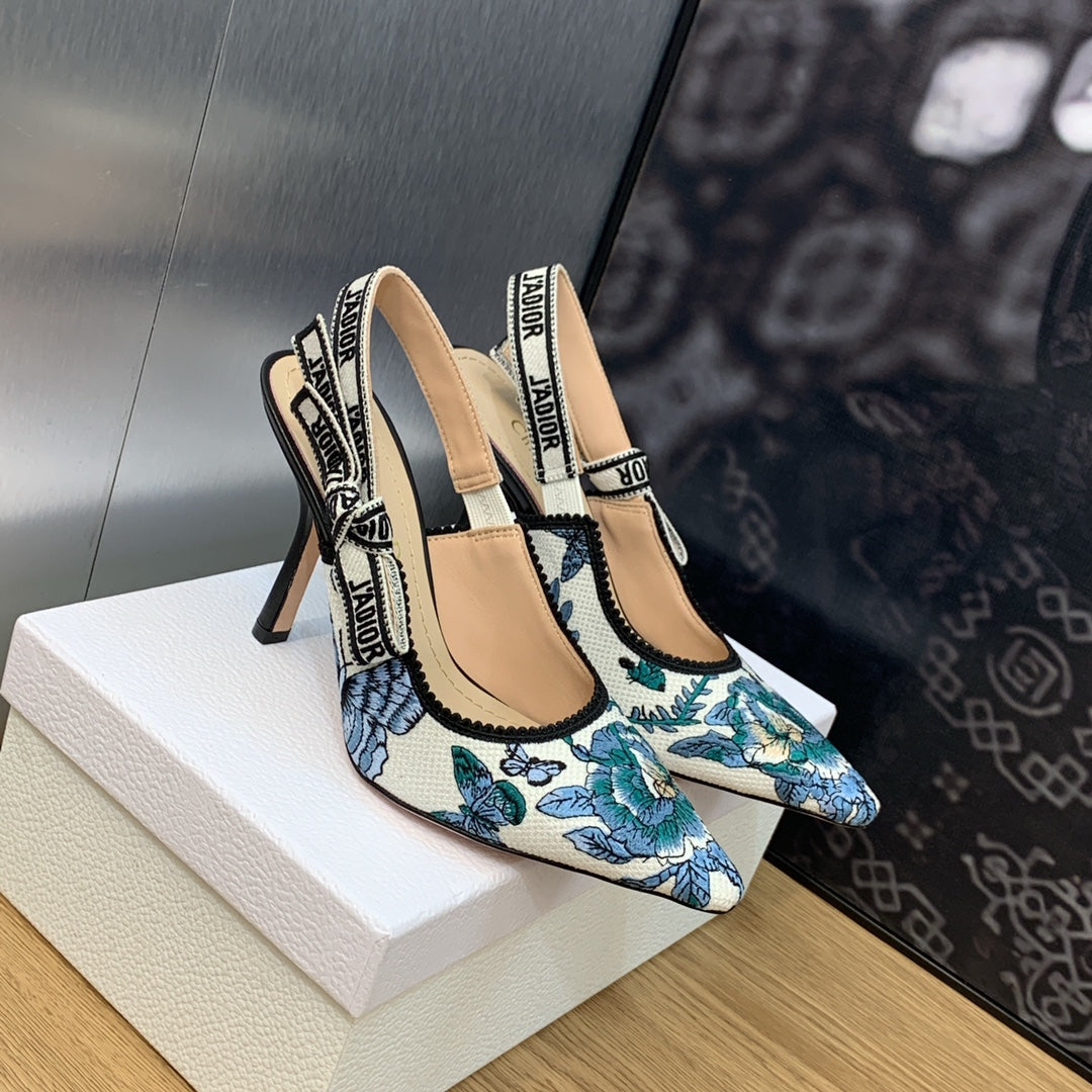 JAdior Slingback Pump 95 Pastel Midnight Blue Multicolor Embroidered Cotton with Toile de Jouy Mexico Motif