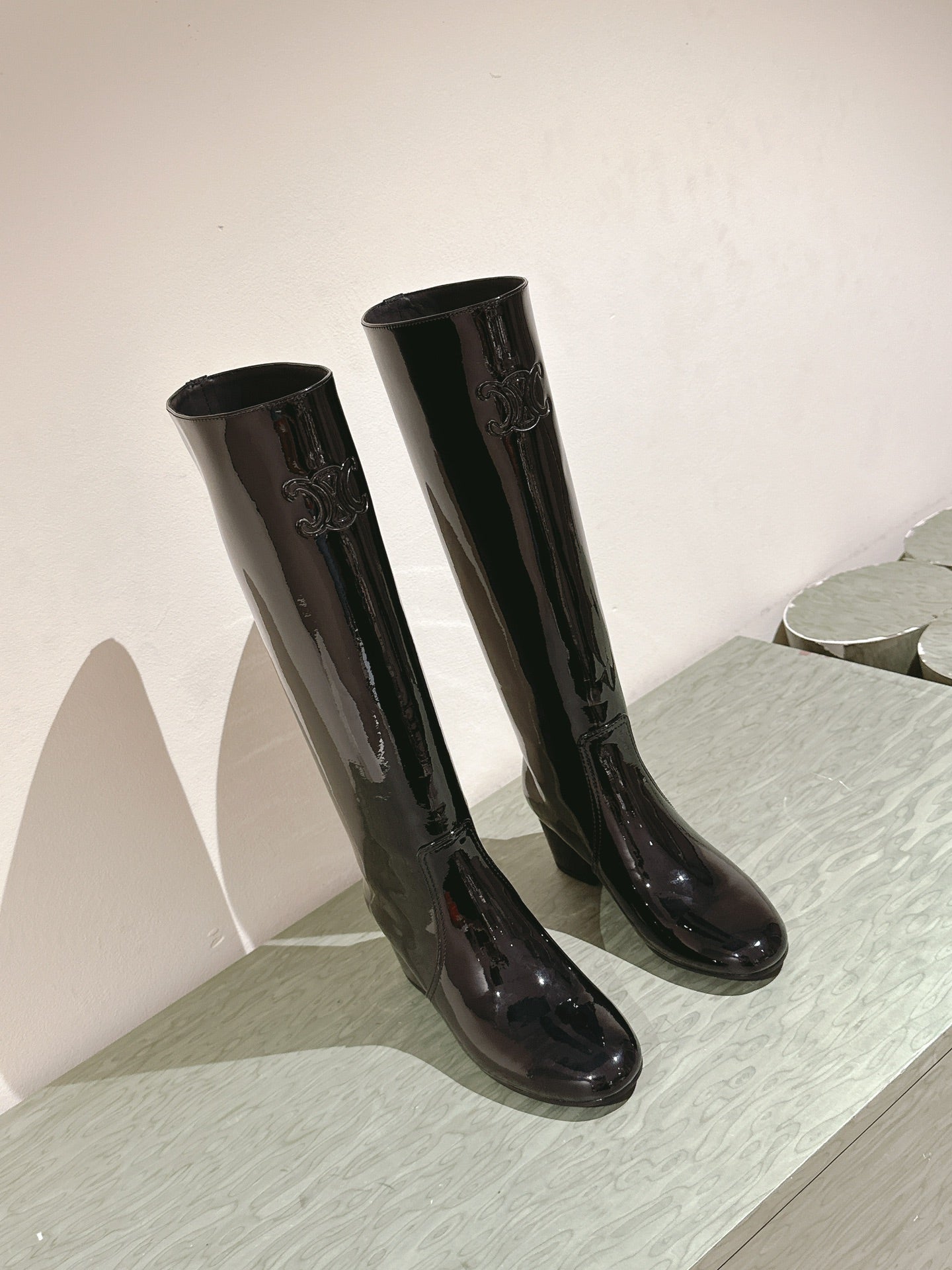 CELINE Les Bottes Triomphe Zipped Long Boot Black Patent Calfskin 452696