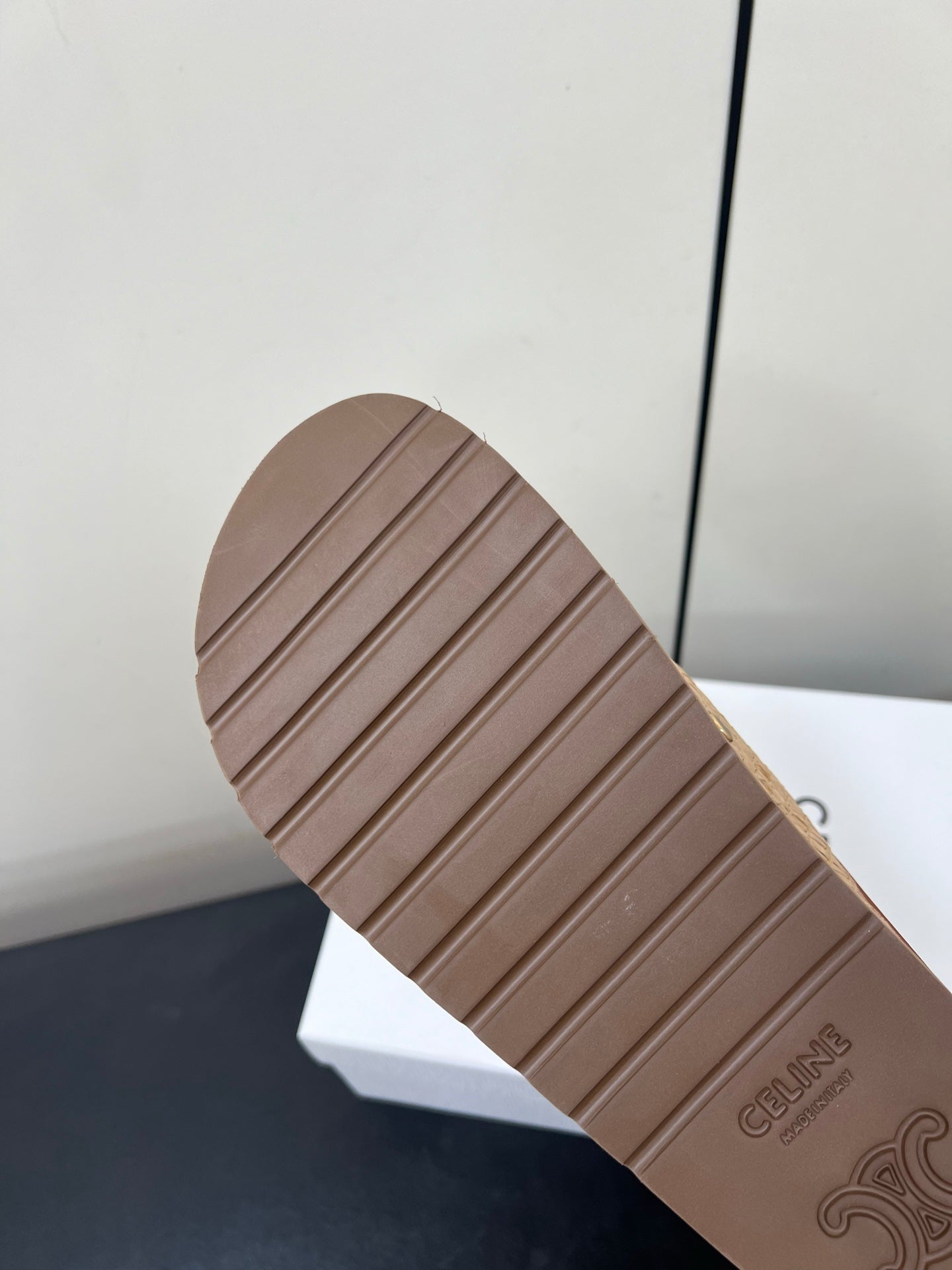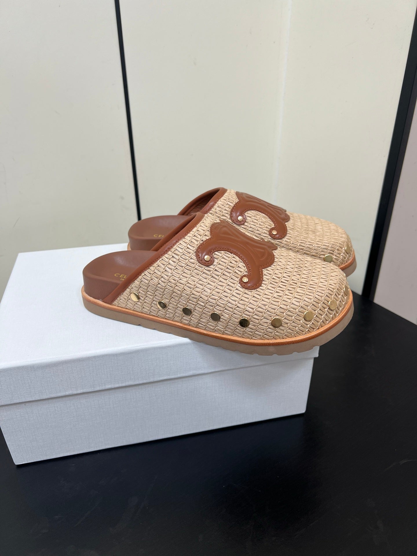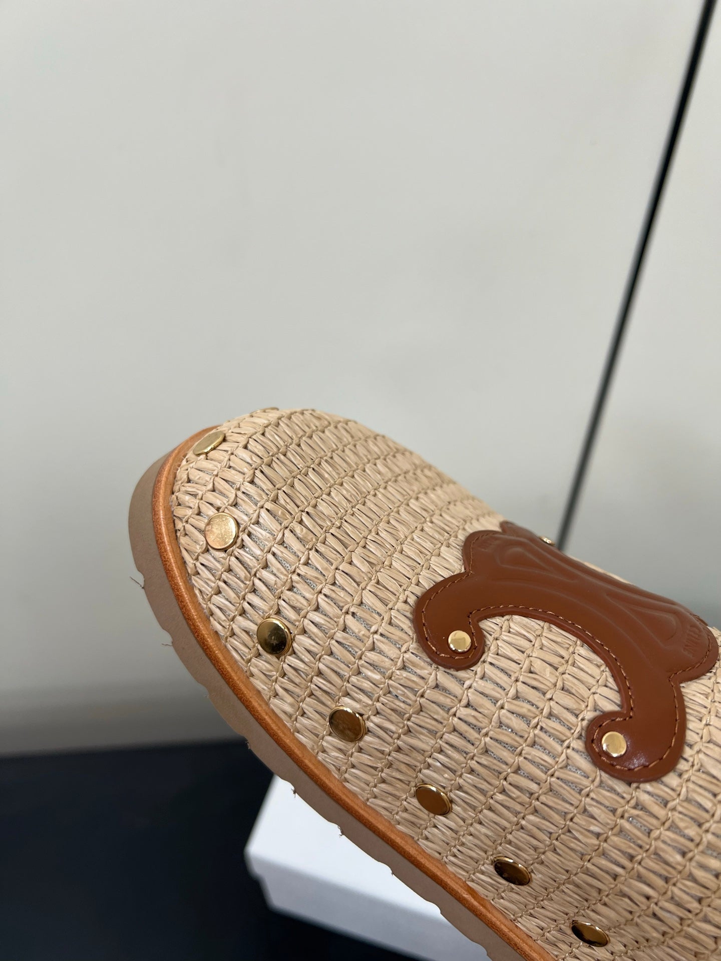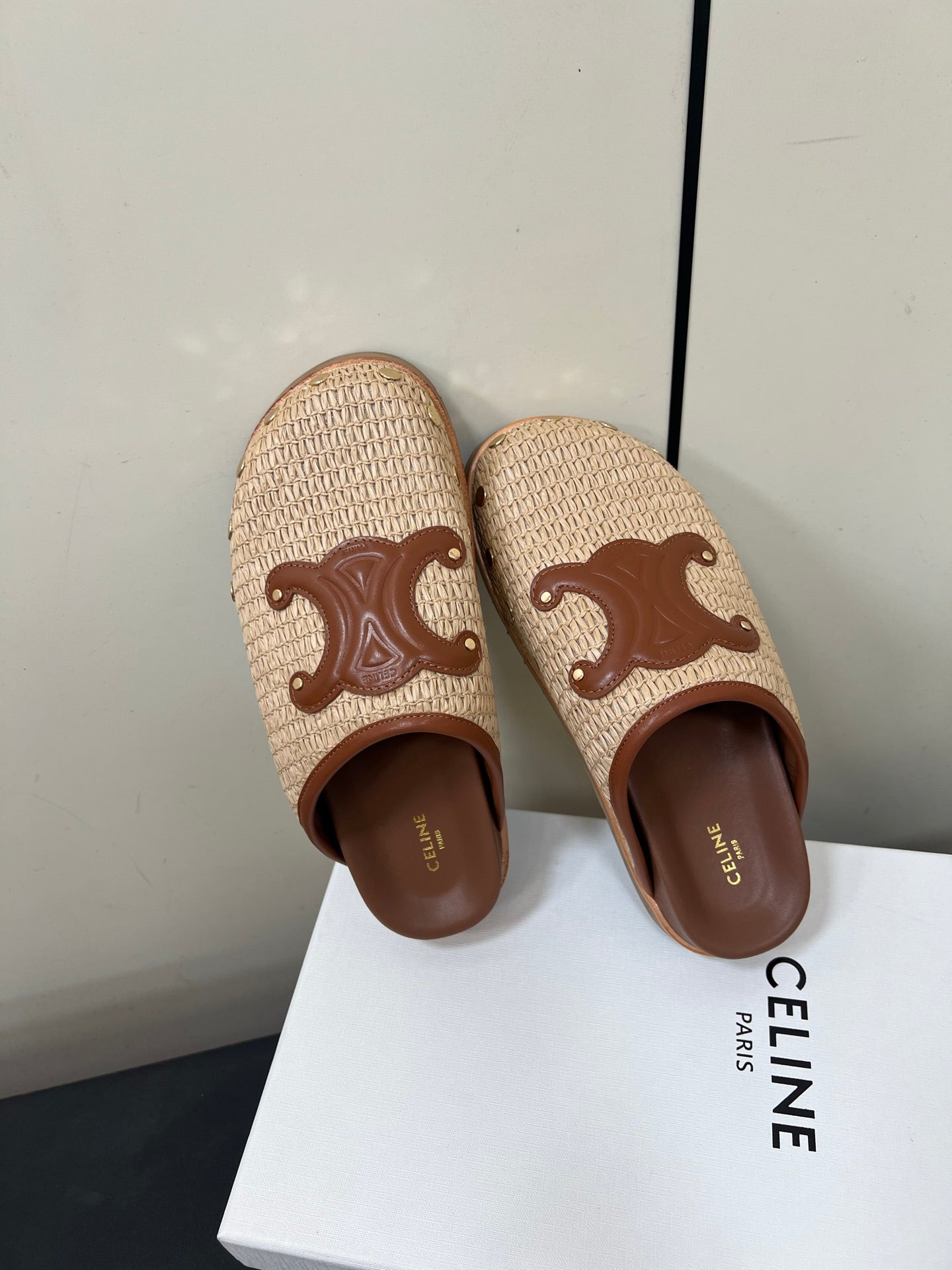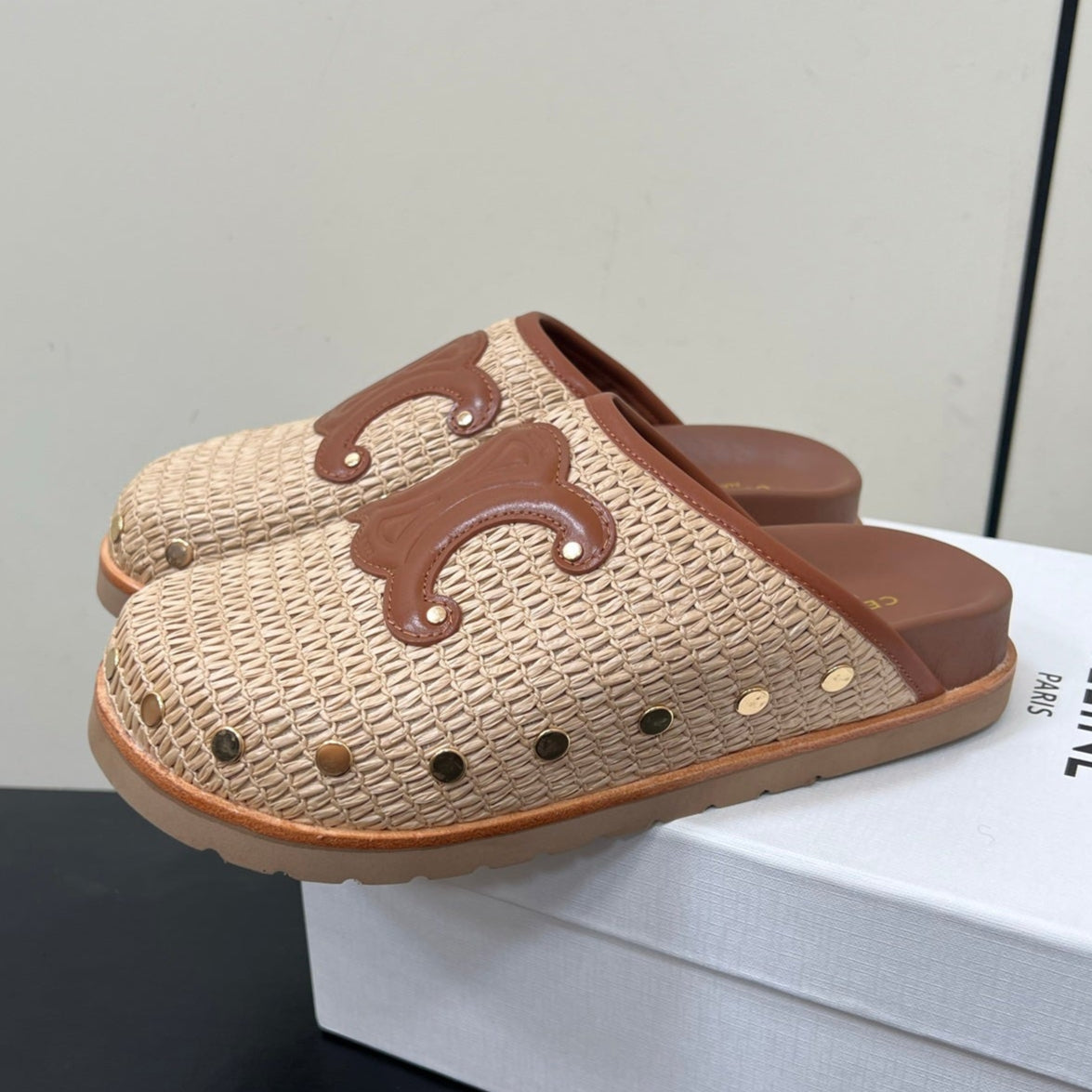 Celine 25 Straw Rivet Birkenstock Slippers Beige Brown Raffia woven Sheepskin