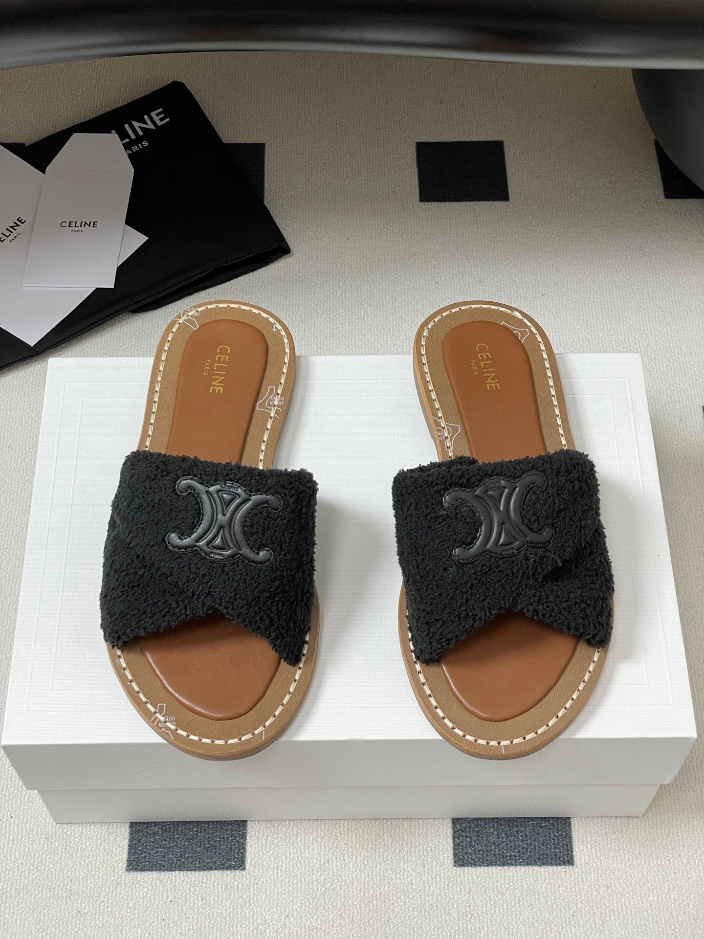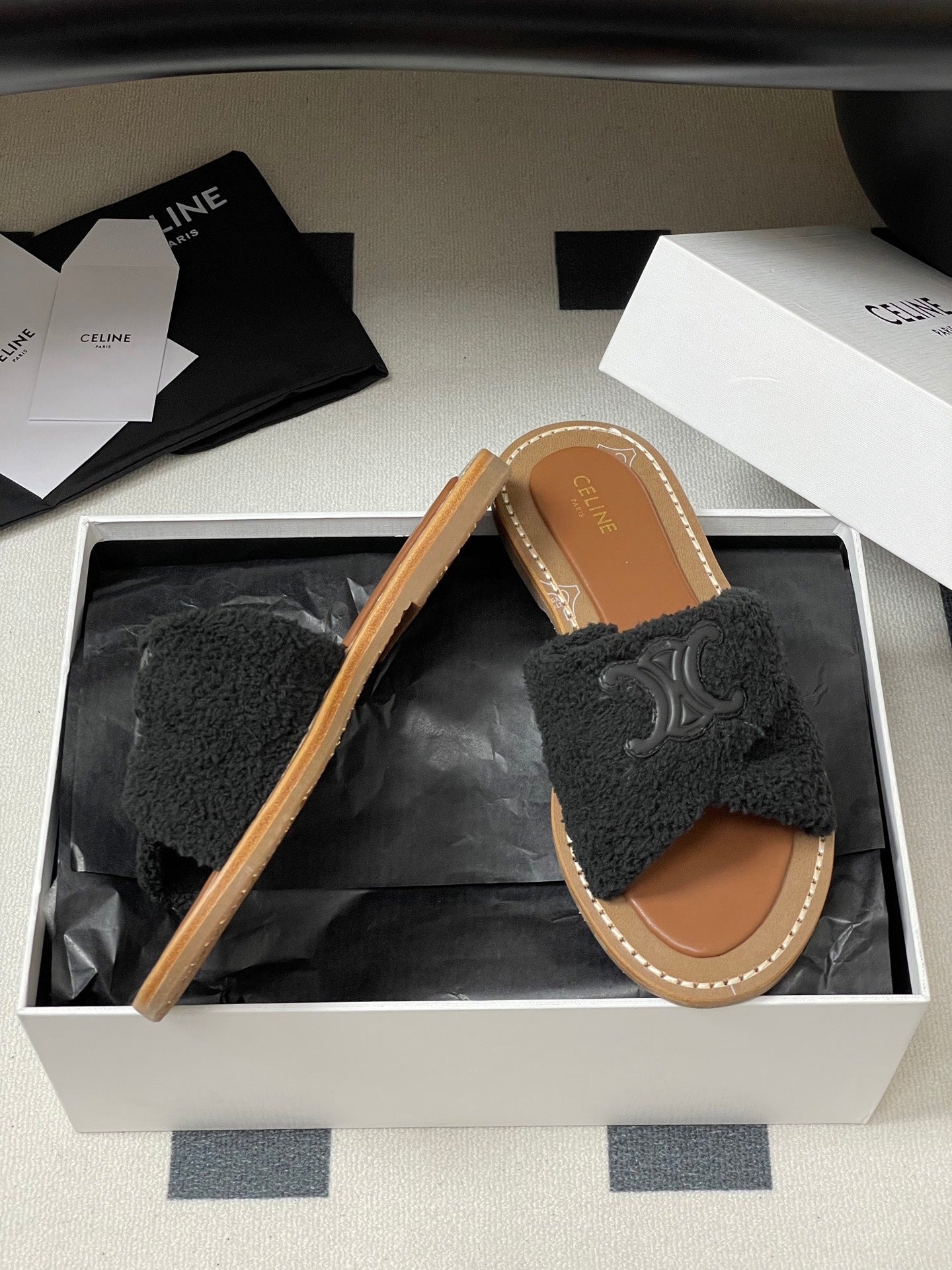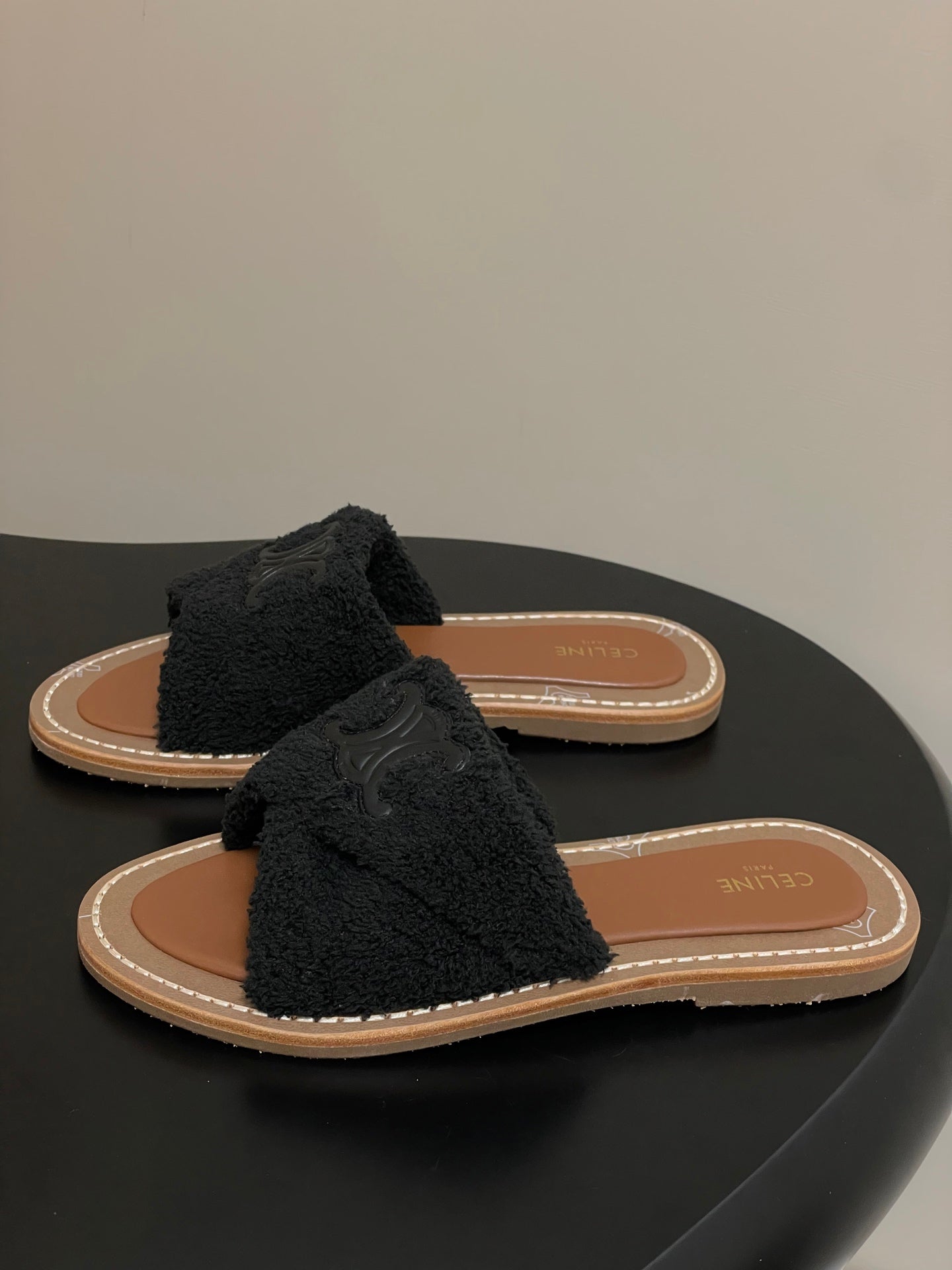 CL 25s Lympia Twisted Sandal Black Brown Sheepskin Plush Cloth 416658