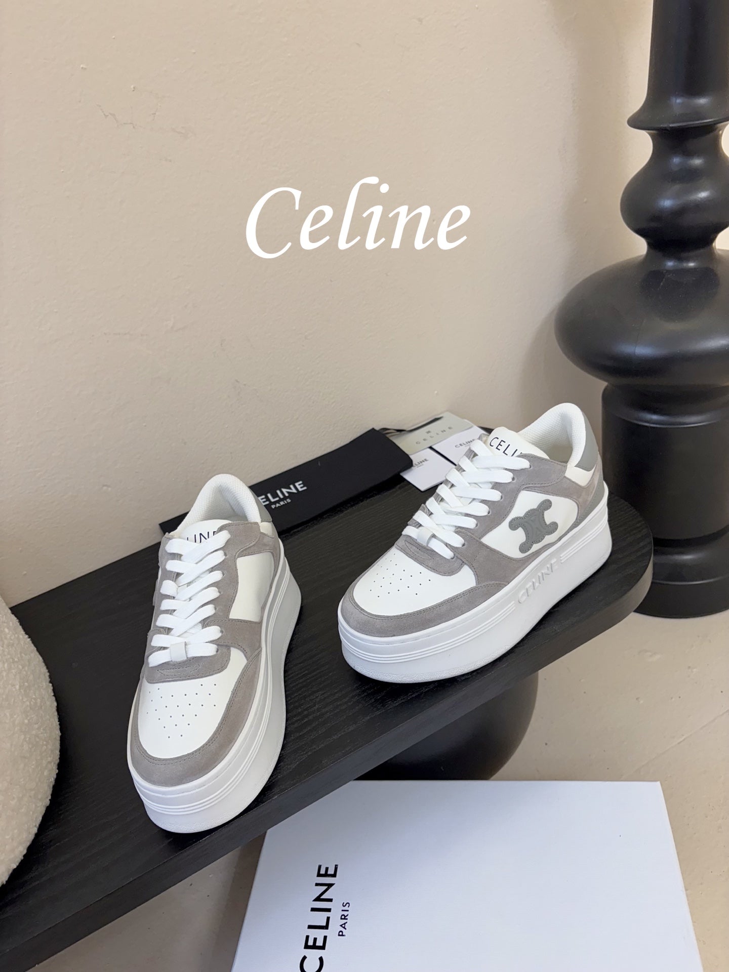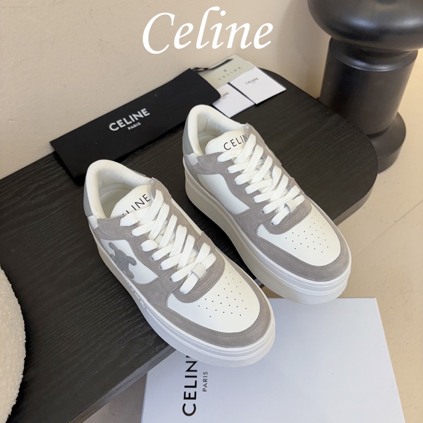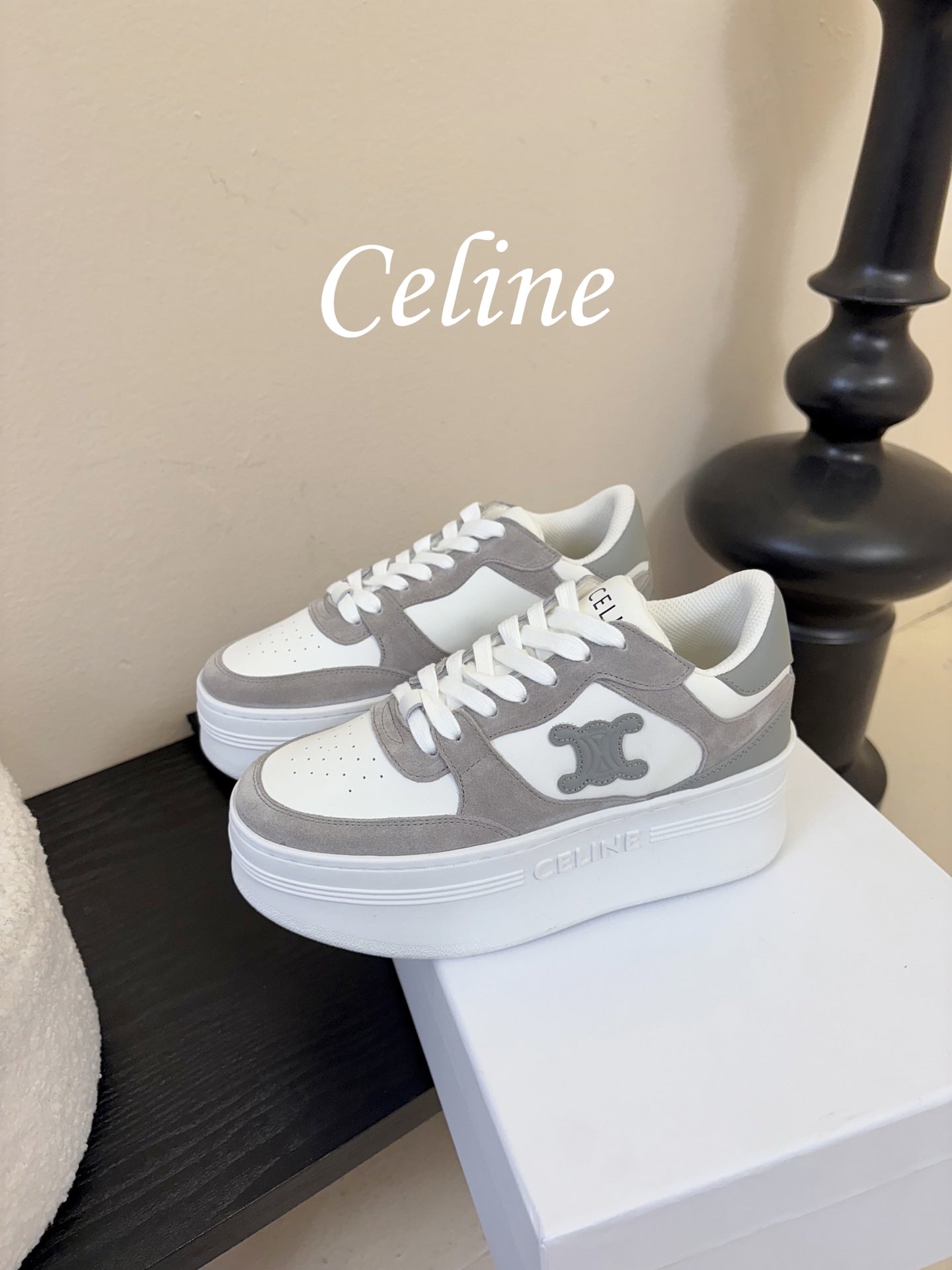 Celine Block Wedge Sneaker White Grey Suede Calfskin 606414