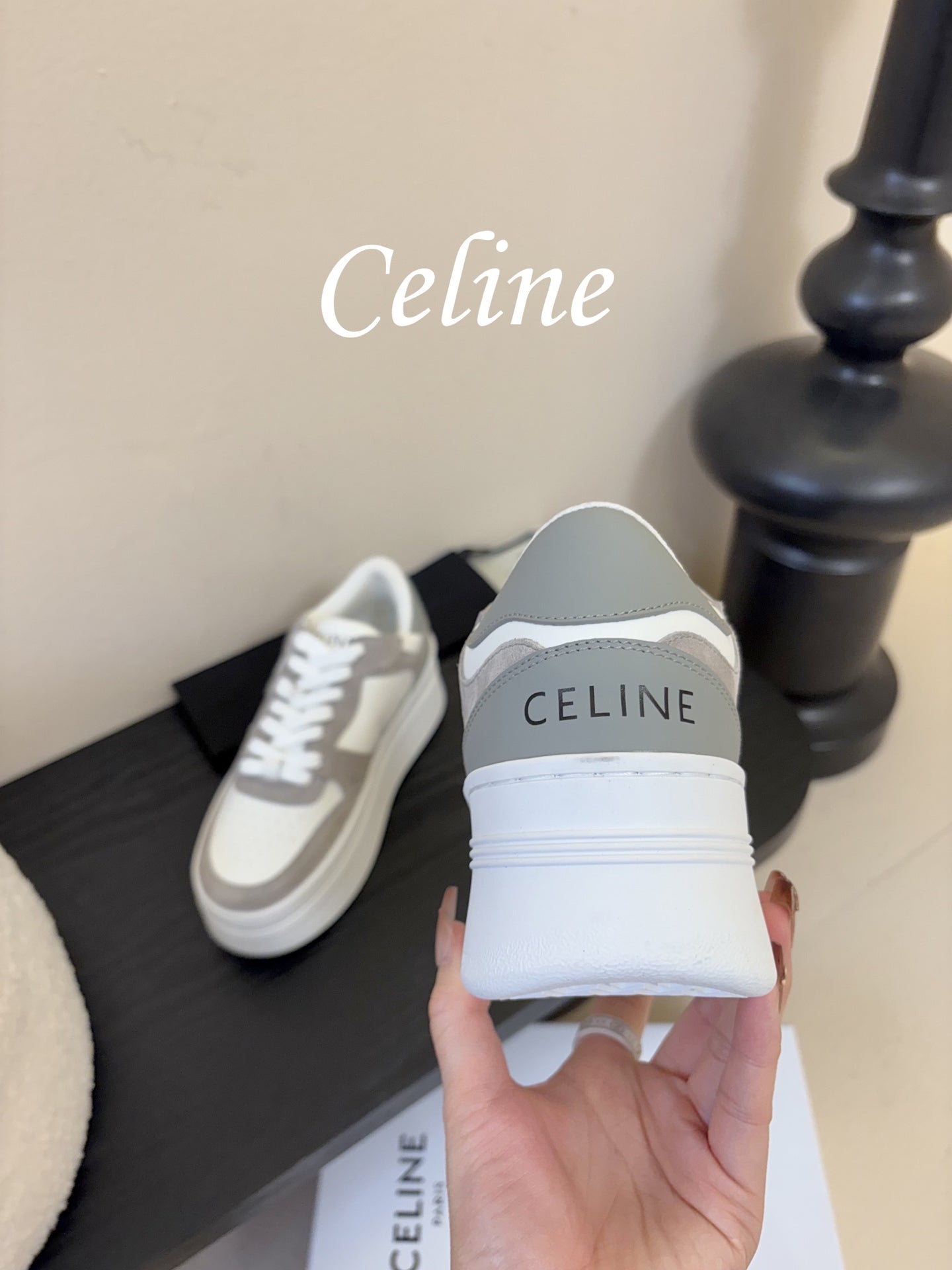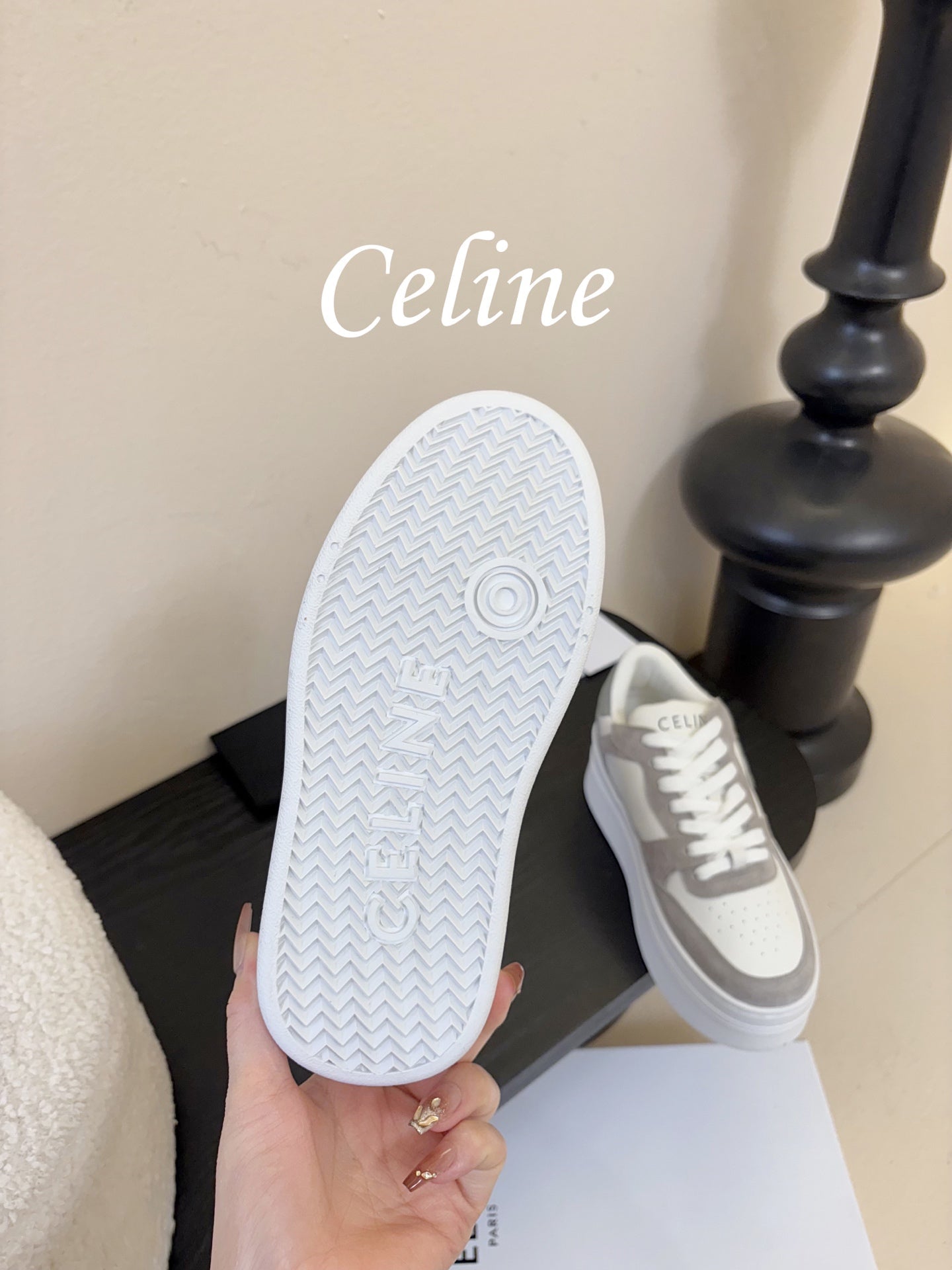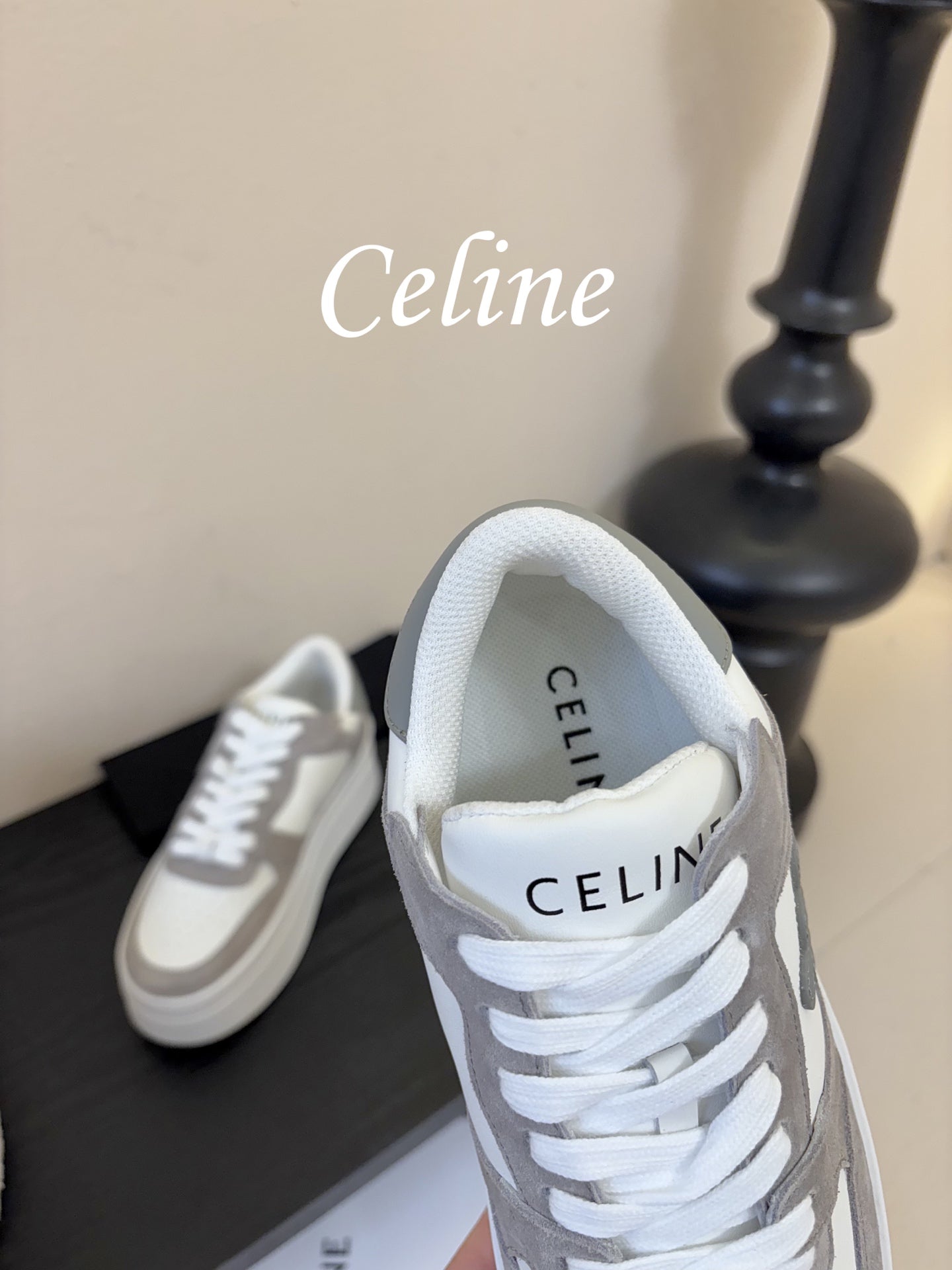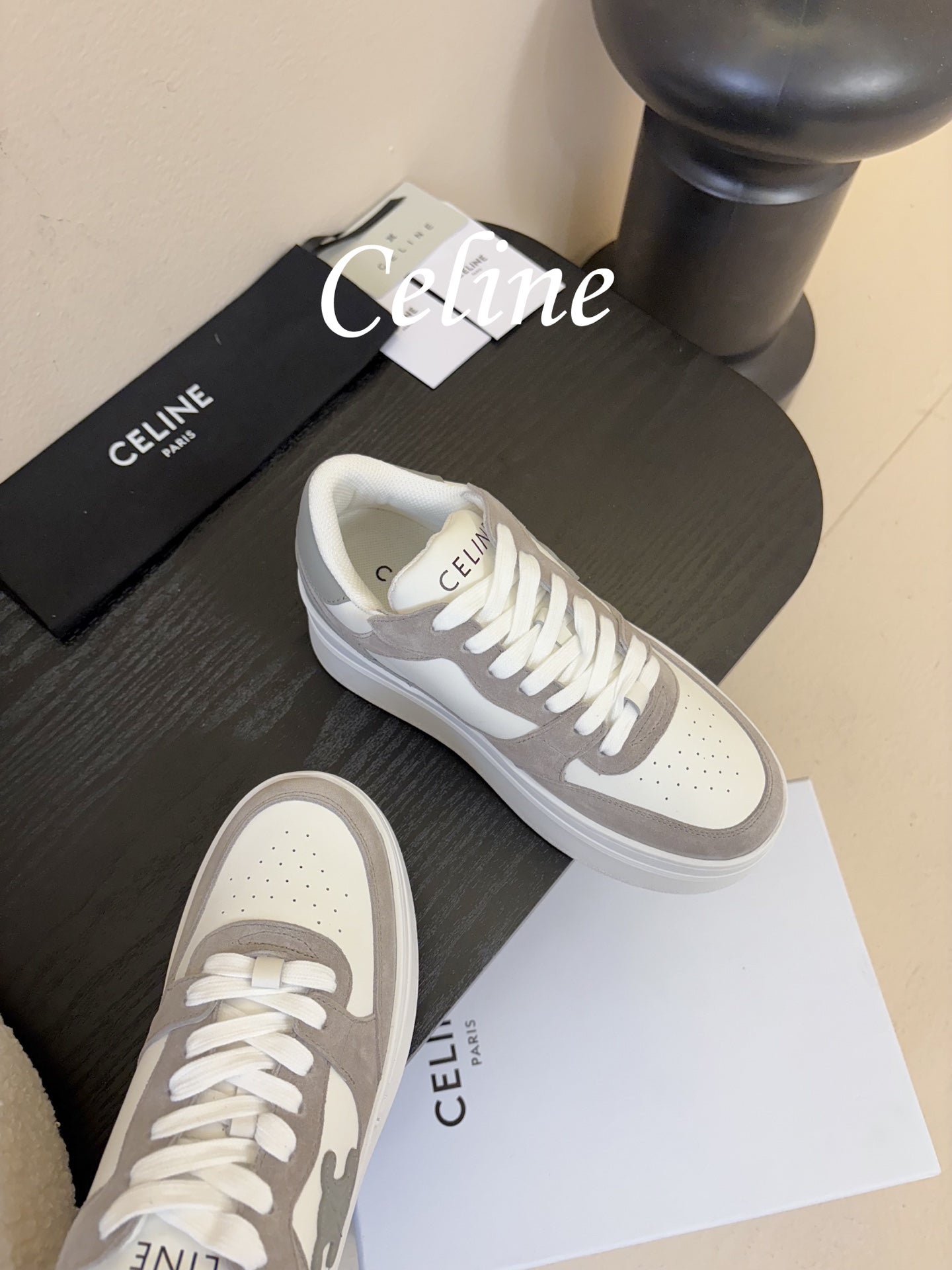Celine Block Wedge Sneaker White Grey Suede Calfskin 606414