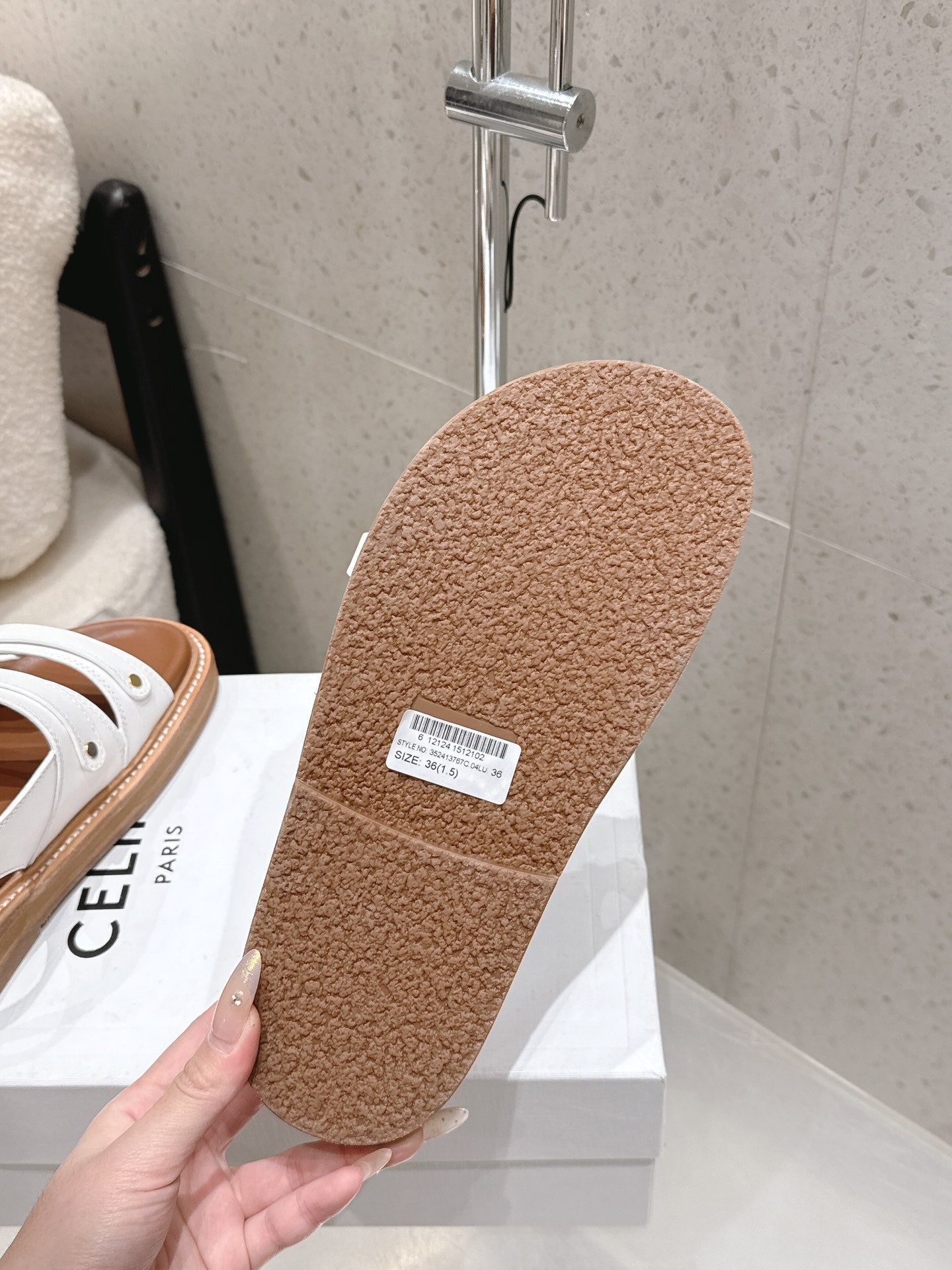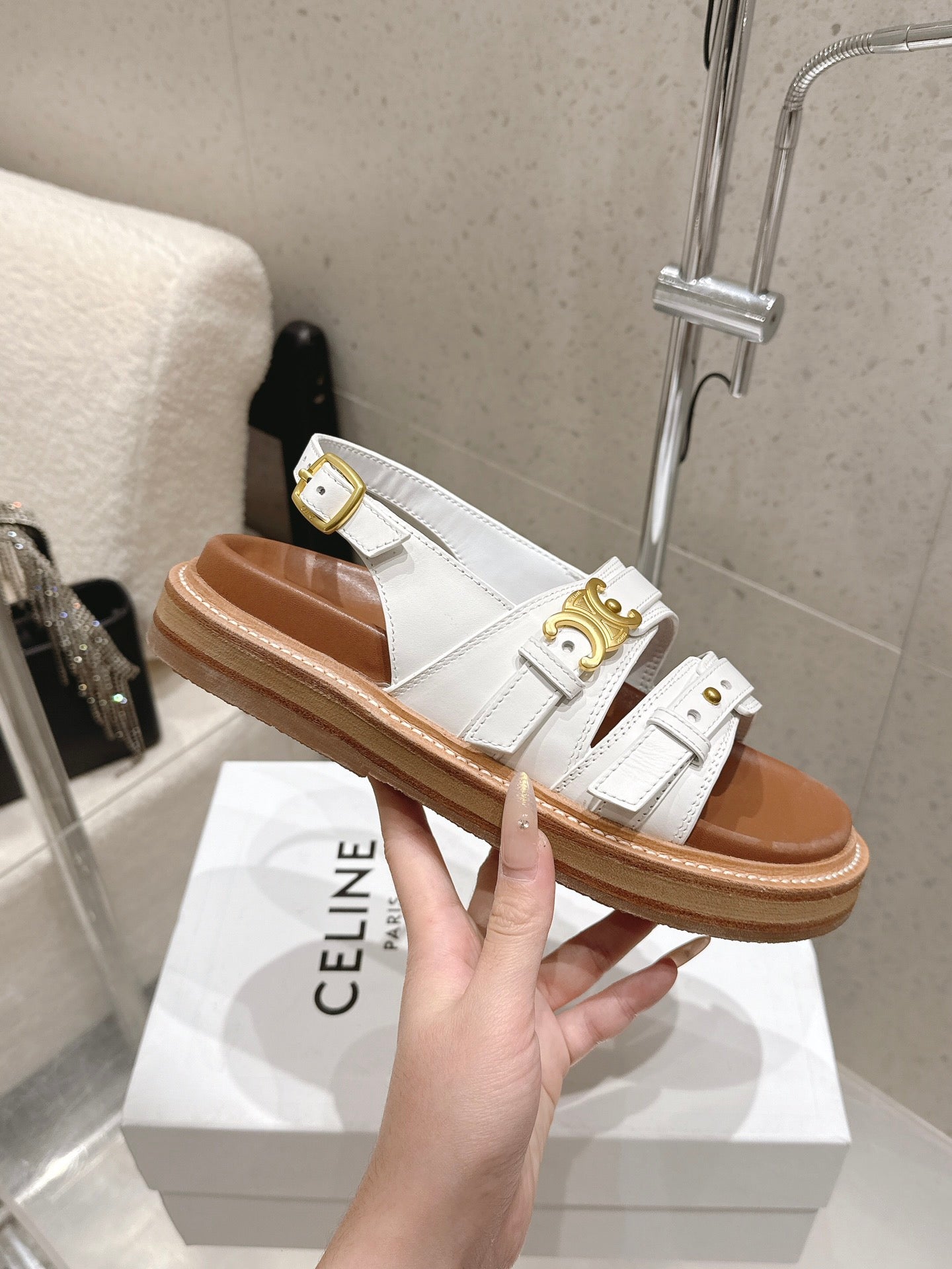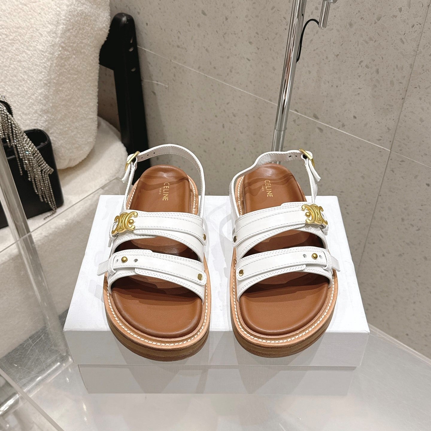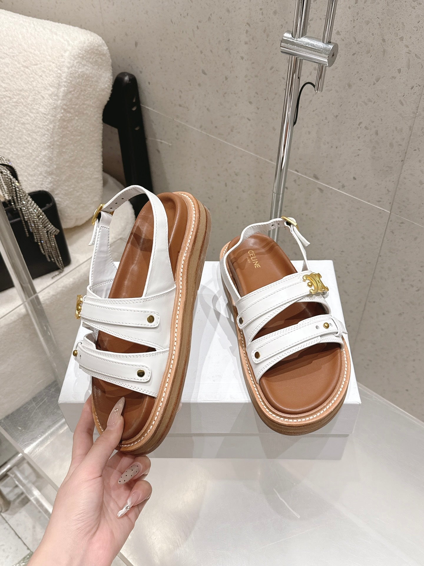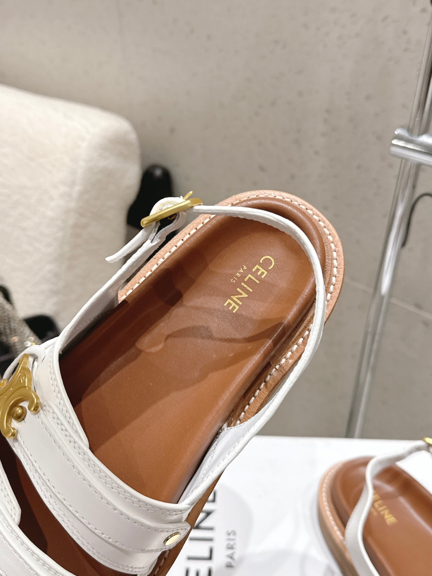 Celine Tippi Triomphe Sandals White Brown Calfskin 610941