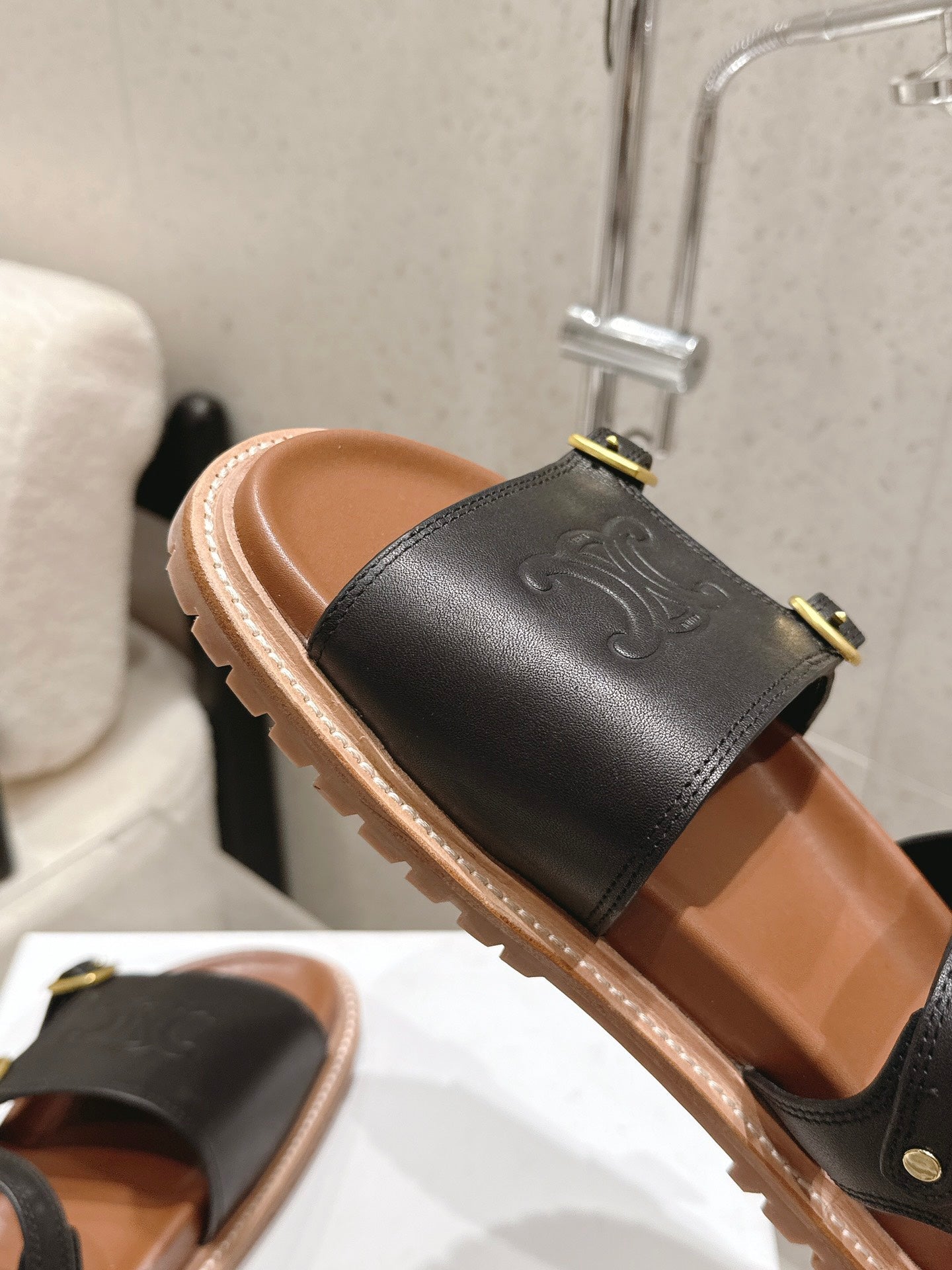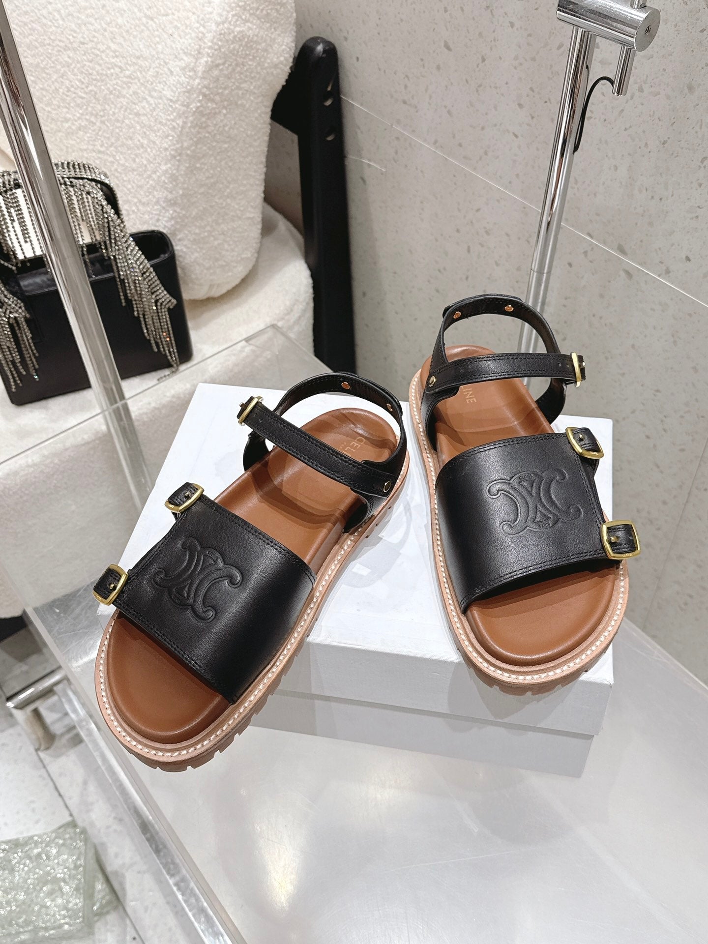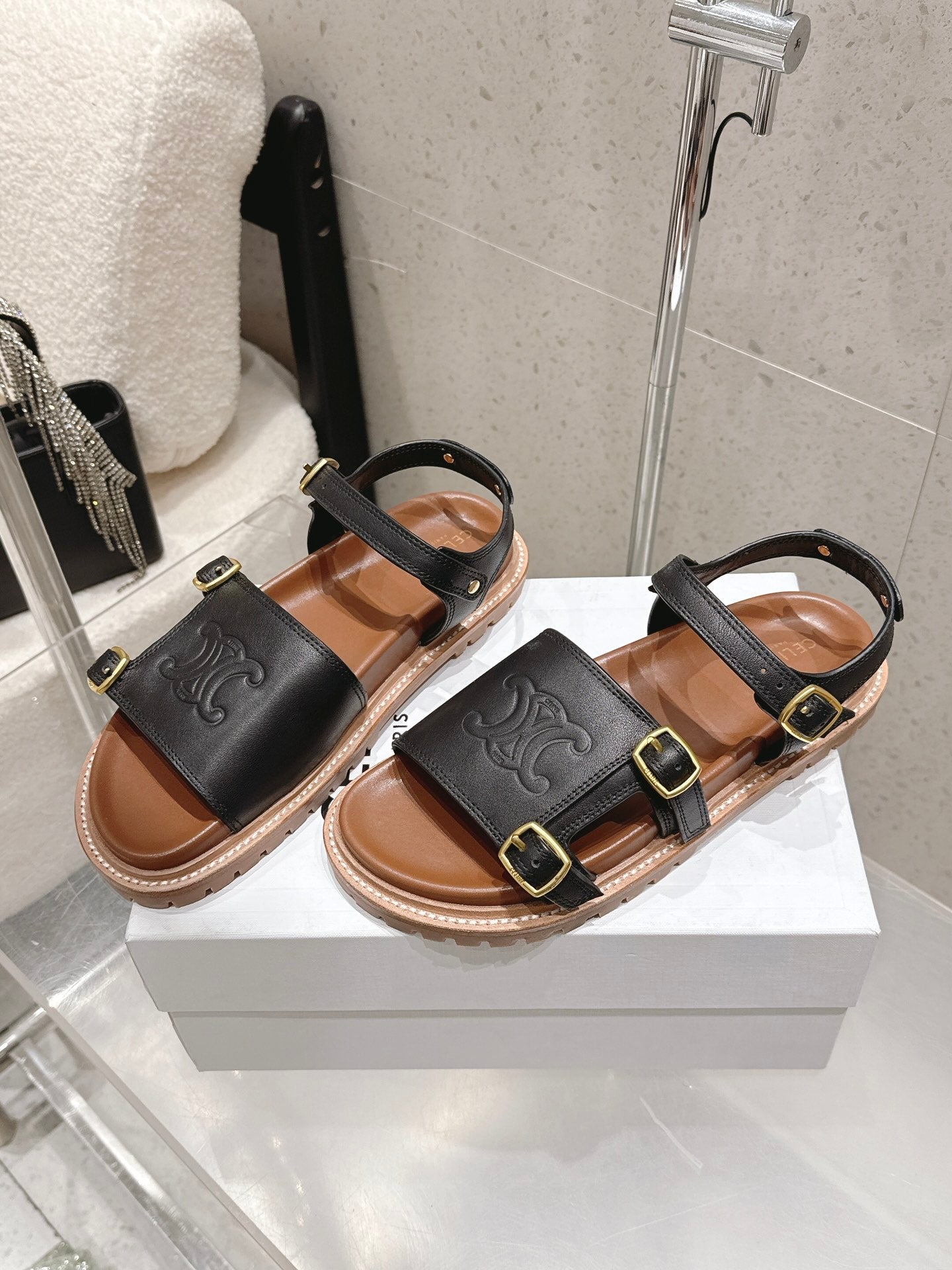Celine Triomphe Sandals Black Brown Leather 610942