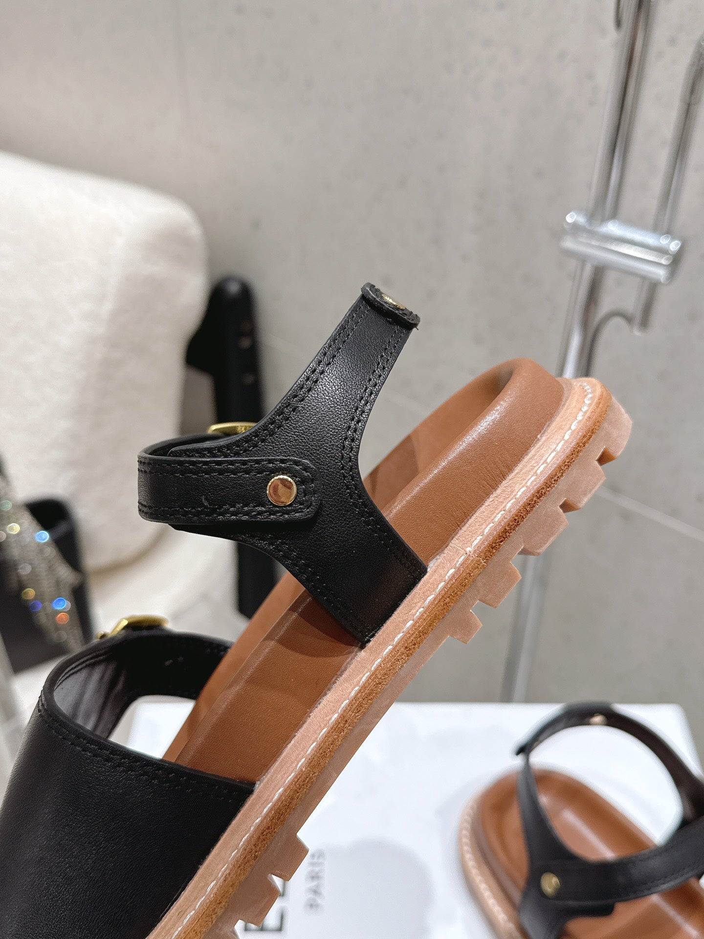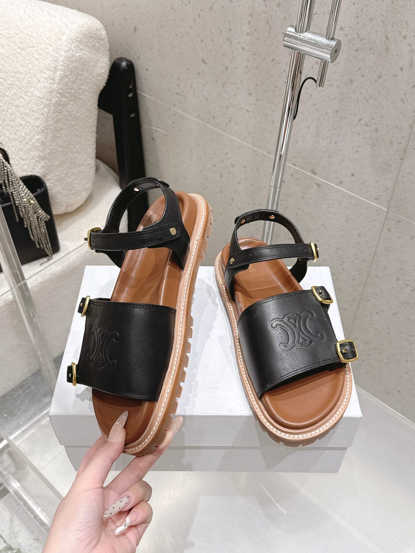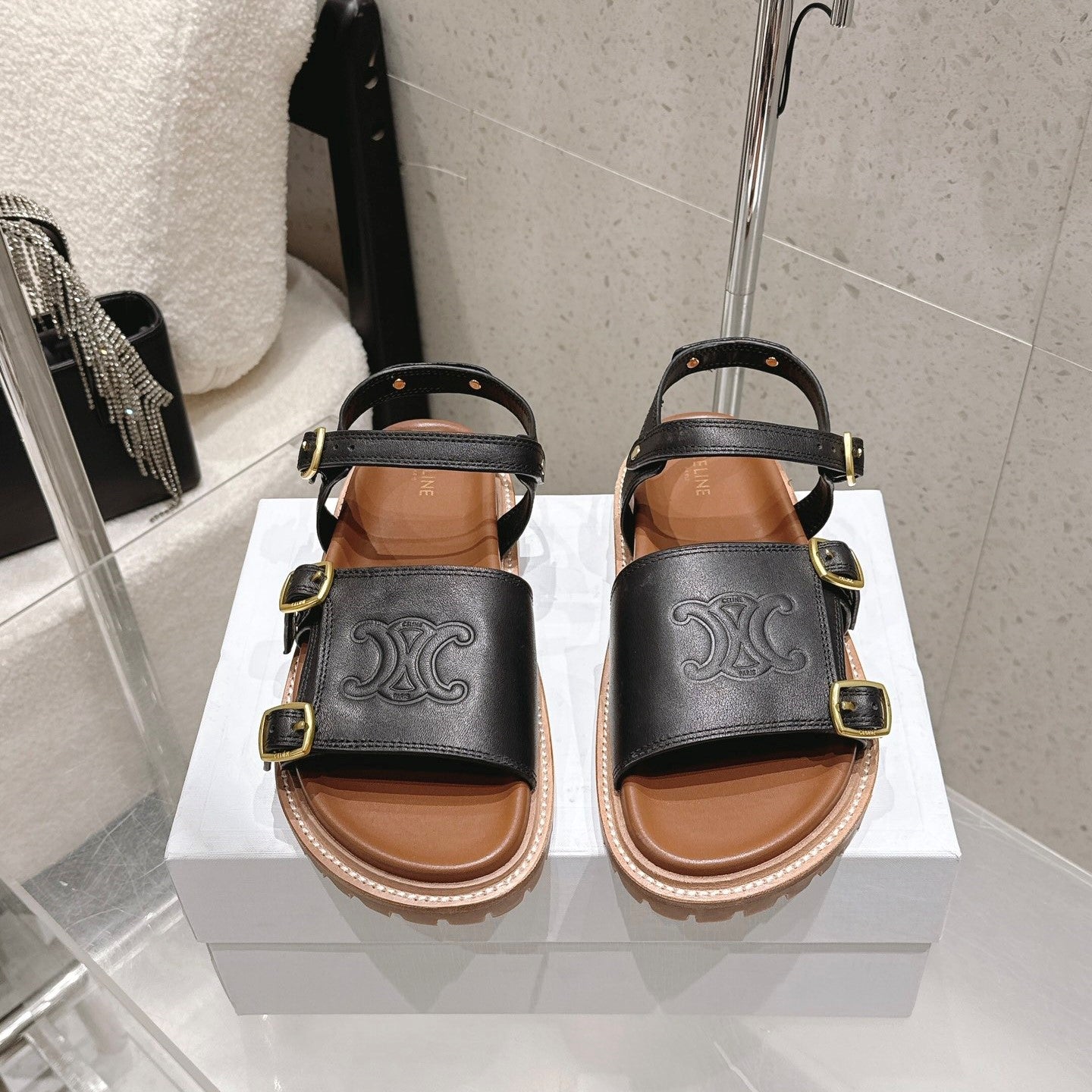 Celine Triomphe Sandals Black Brown Leather 610942