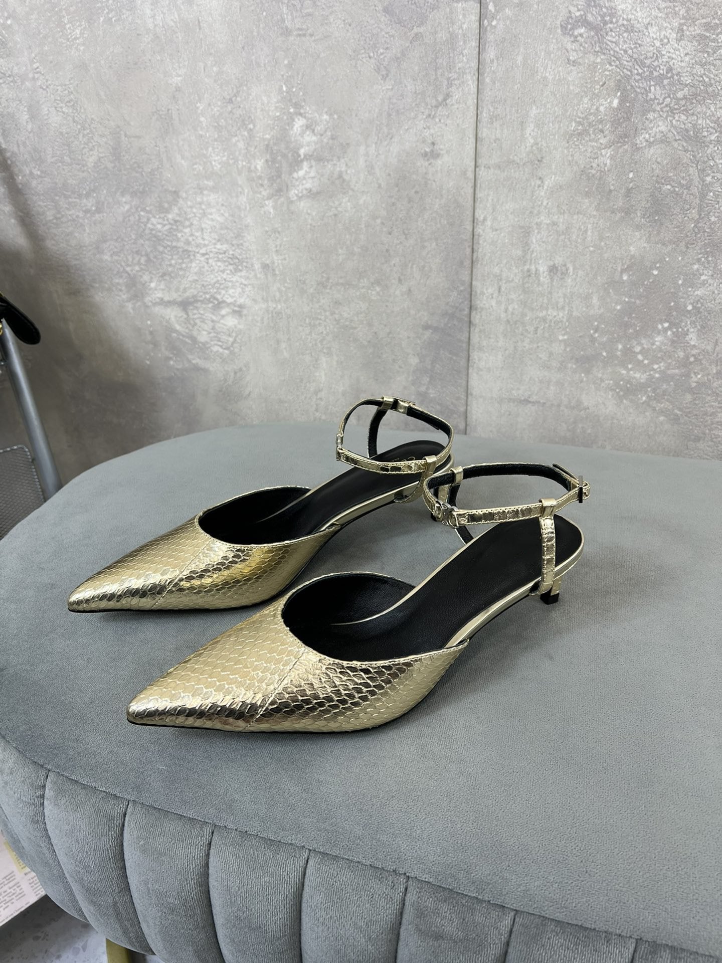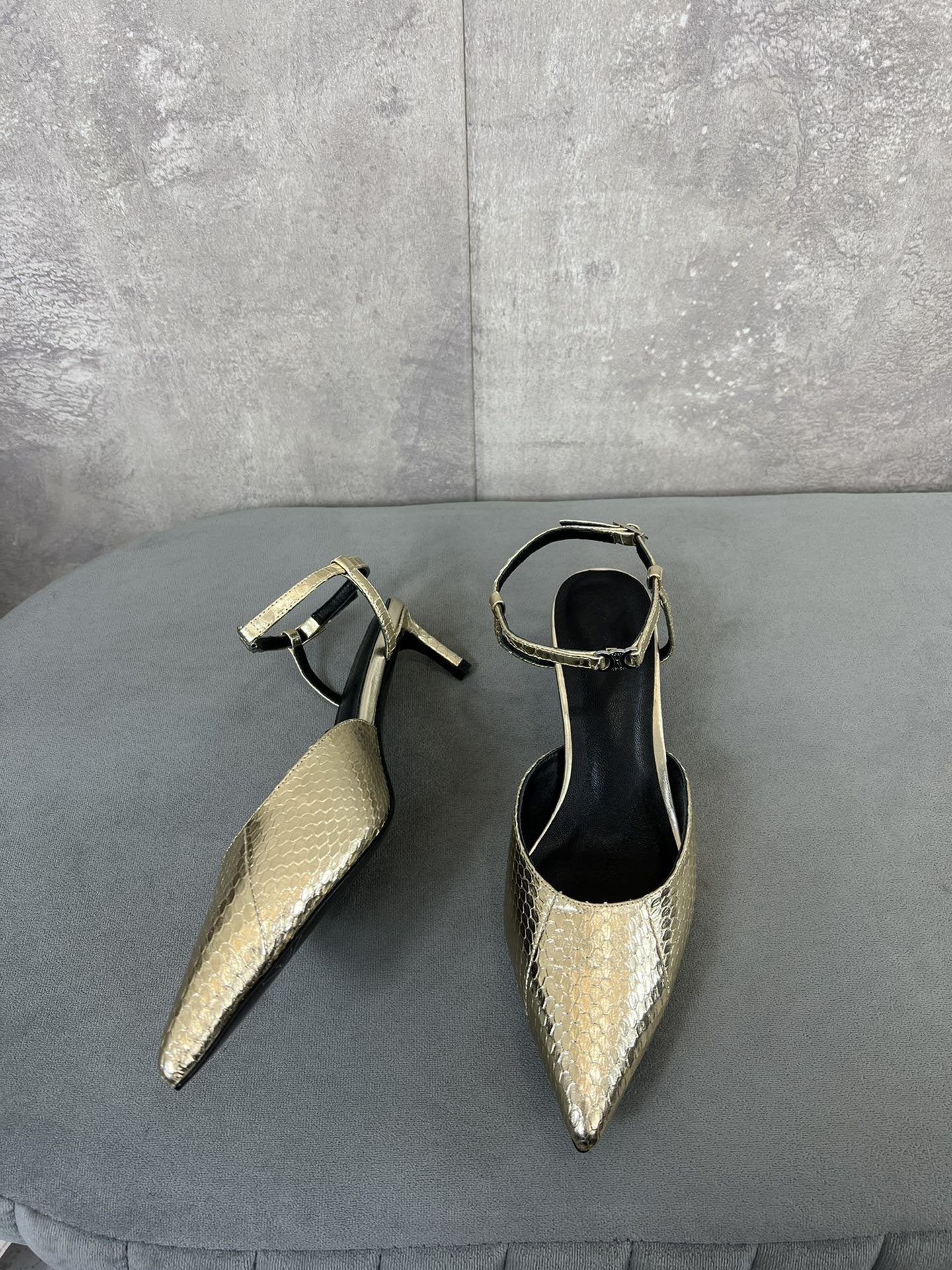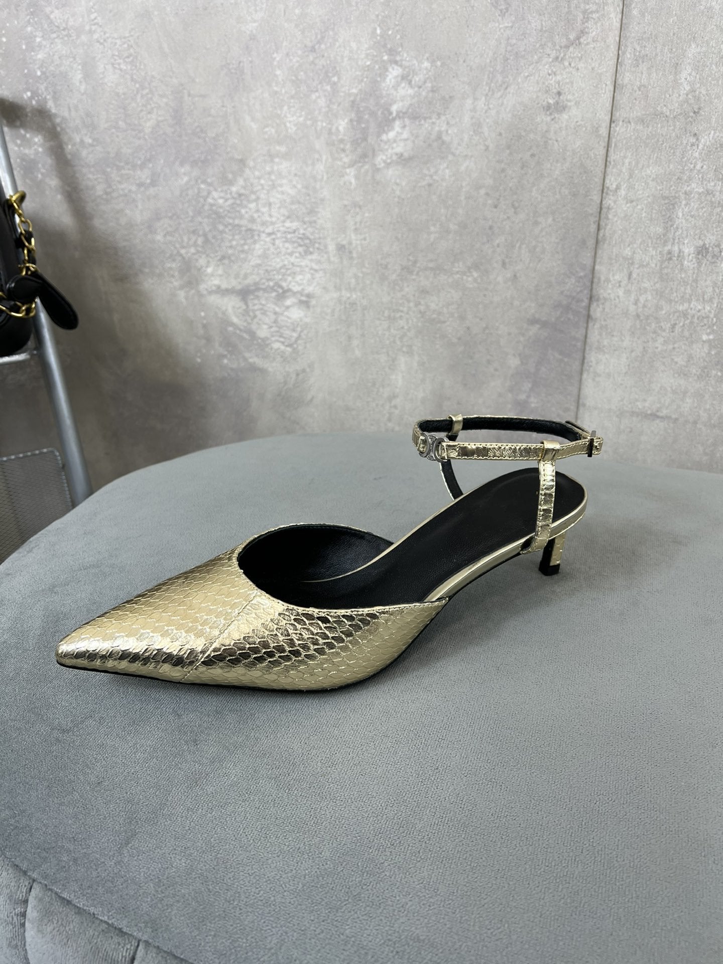 cl kitten with strap 45 gold lizard stamped metalized calfskin