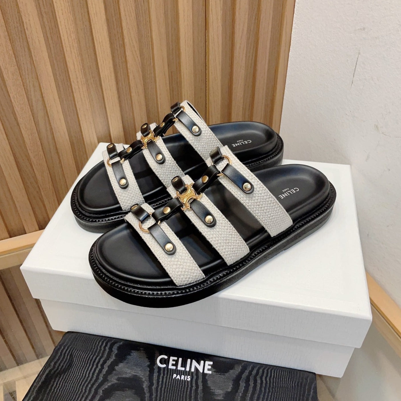 TIPPI SLIDE IN CANVAS & CALFSKIN NATURAL WHITE / BLACK