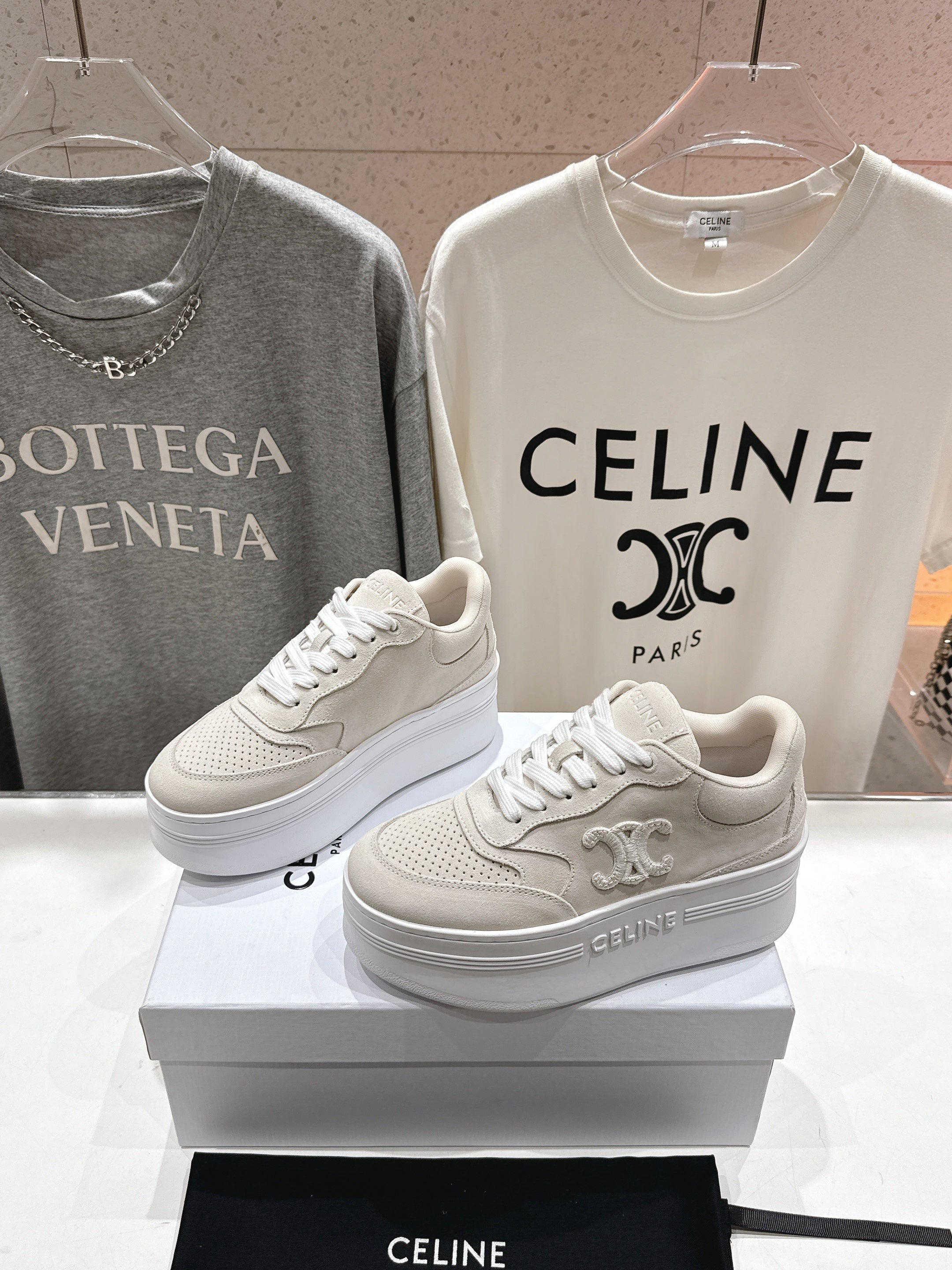 Celine Block Wedge Sneaker White Grey Suede Calfskin 606414