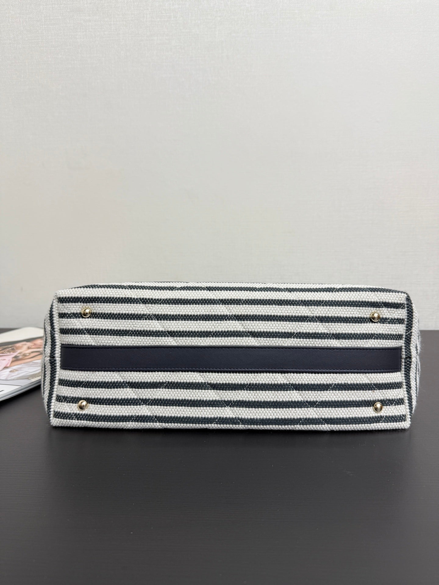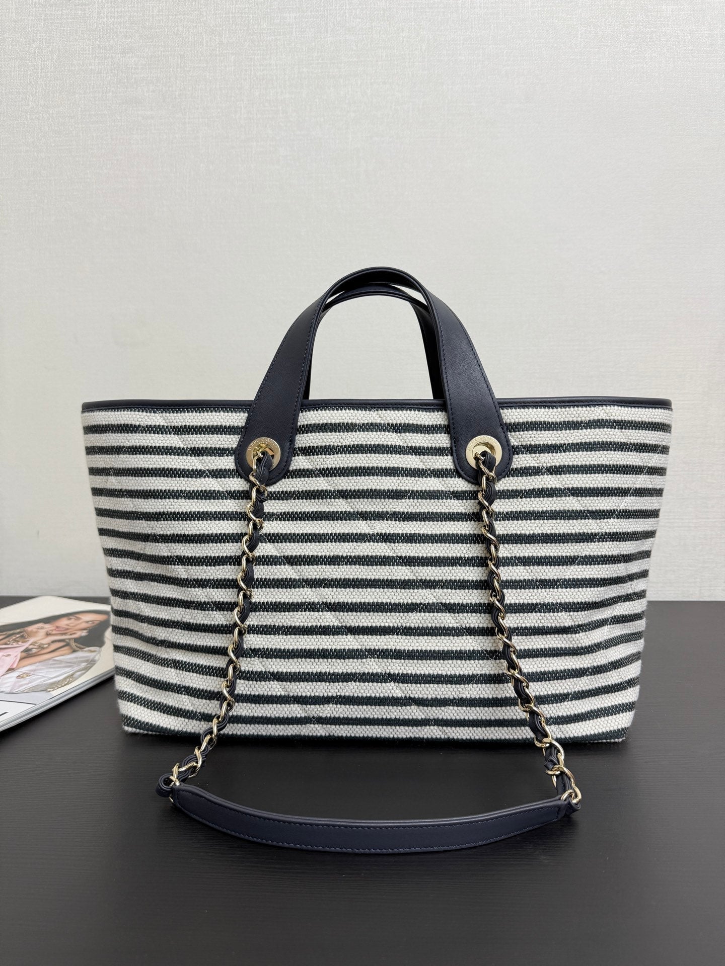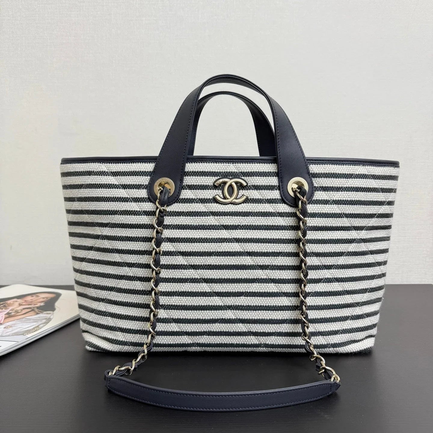 Chanel 26 Woven Beach Bag 46 White Navy Blue Canvas Leather