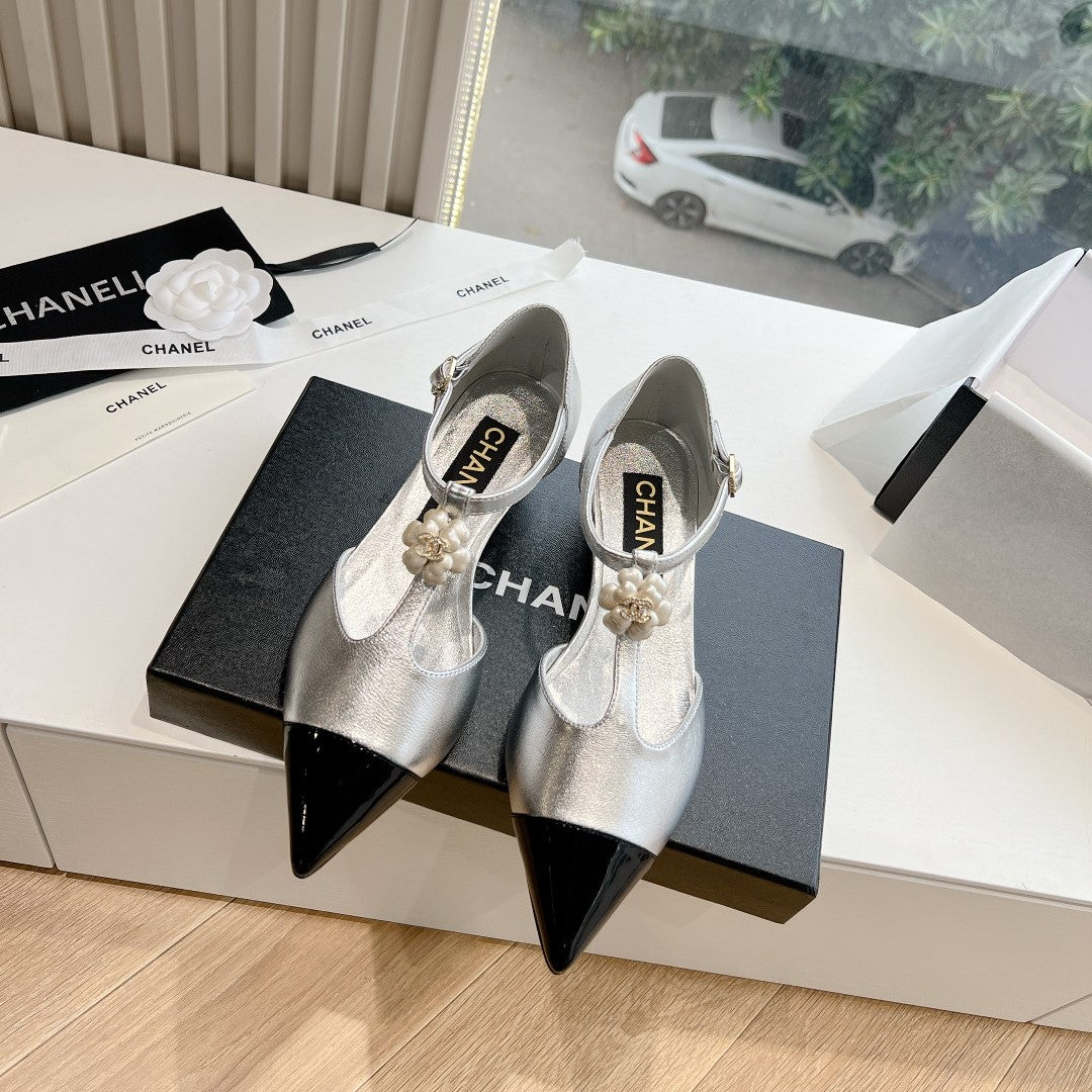 CC 25s Camellia T Strap Slingback 50mm Black Sliver Calfskin&Sheepskin 413324