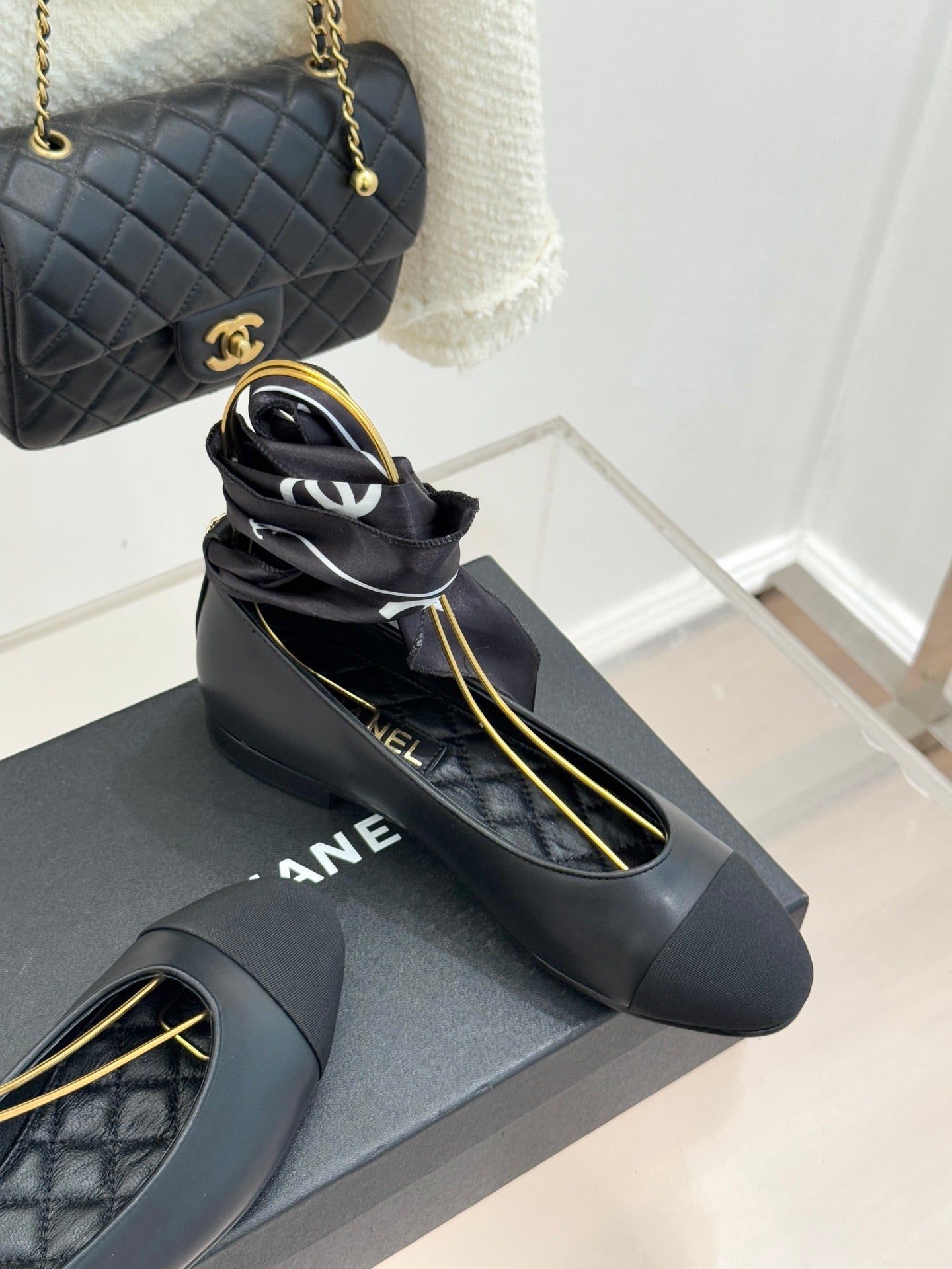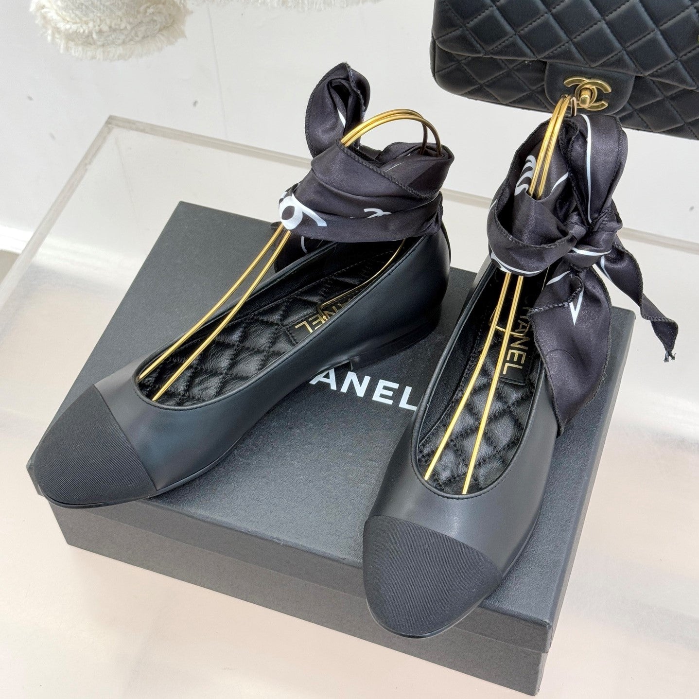 CC 26C Double C Ribbon Flat Shoes Black Cafskin Fabric 557535