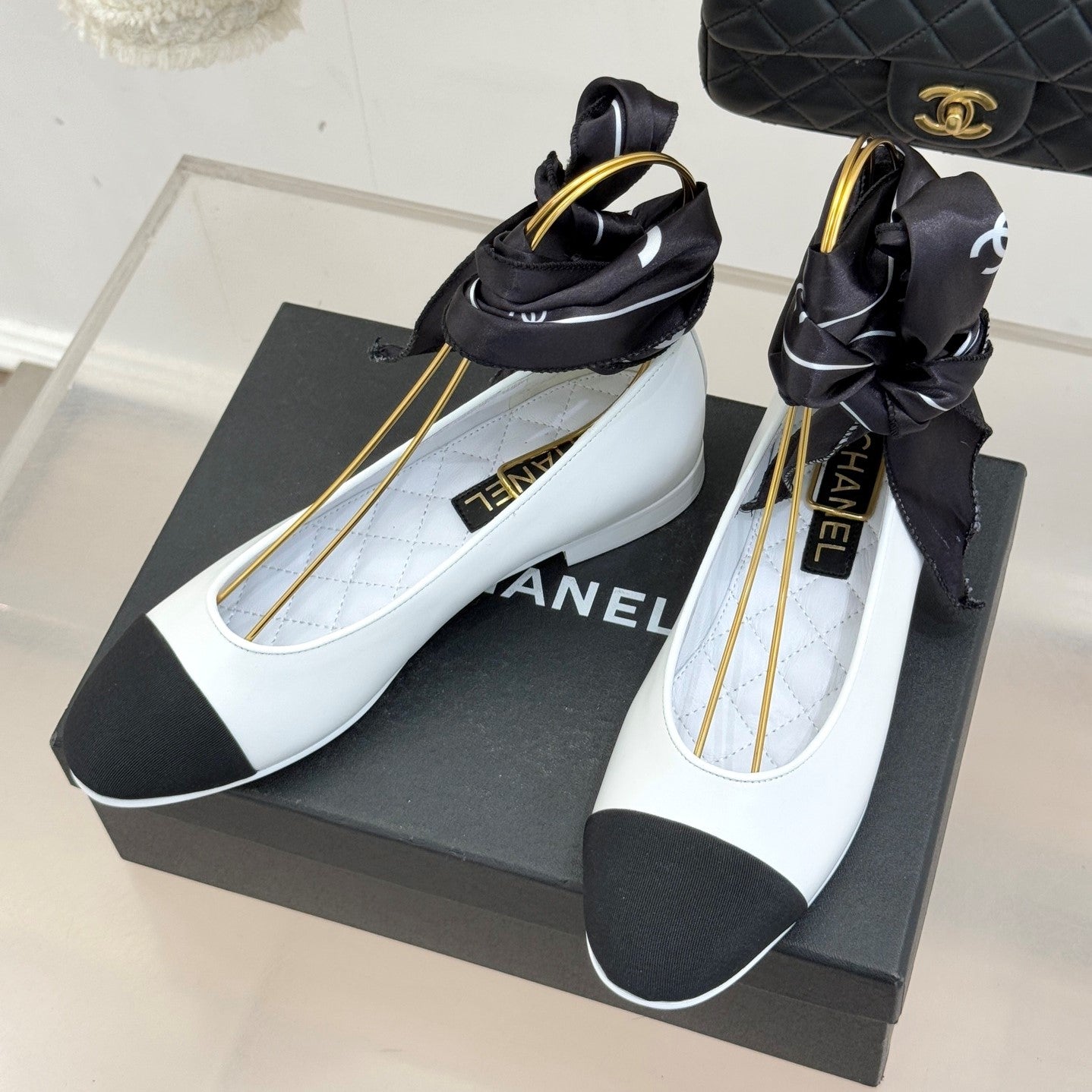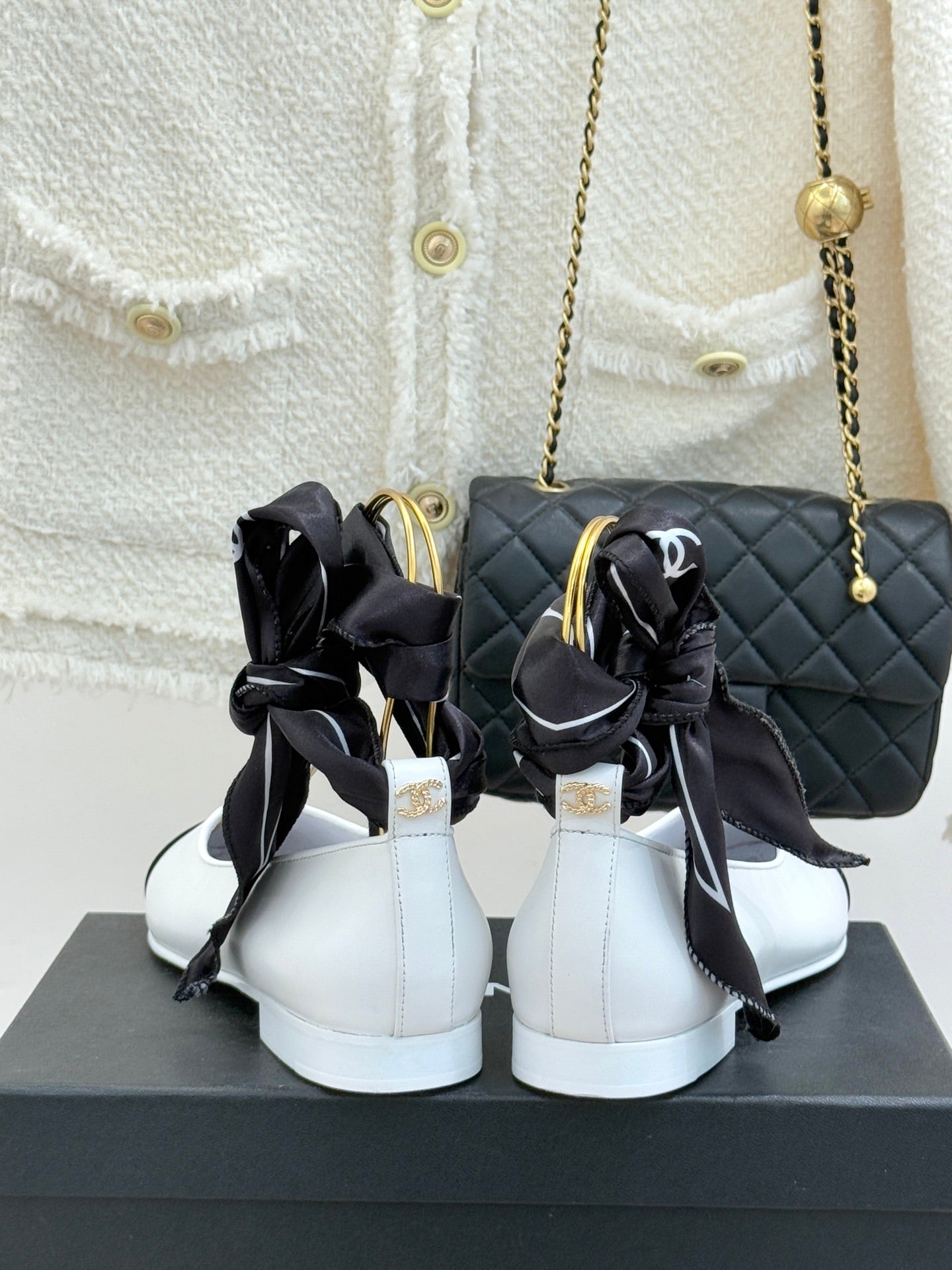 CC 26C Double C Ribbon Flat Shoes Black White Cafskin Fabric 557537