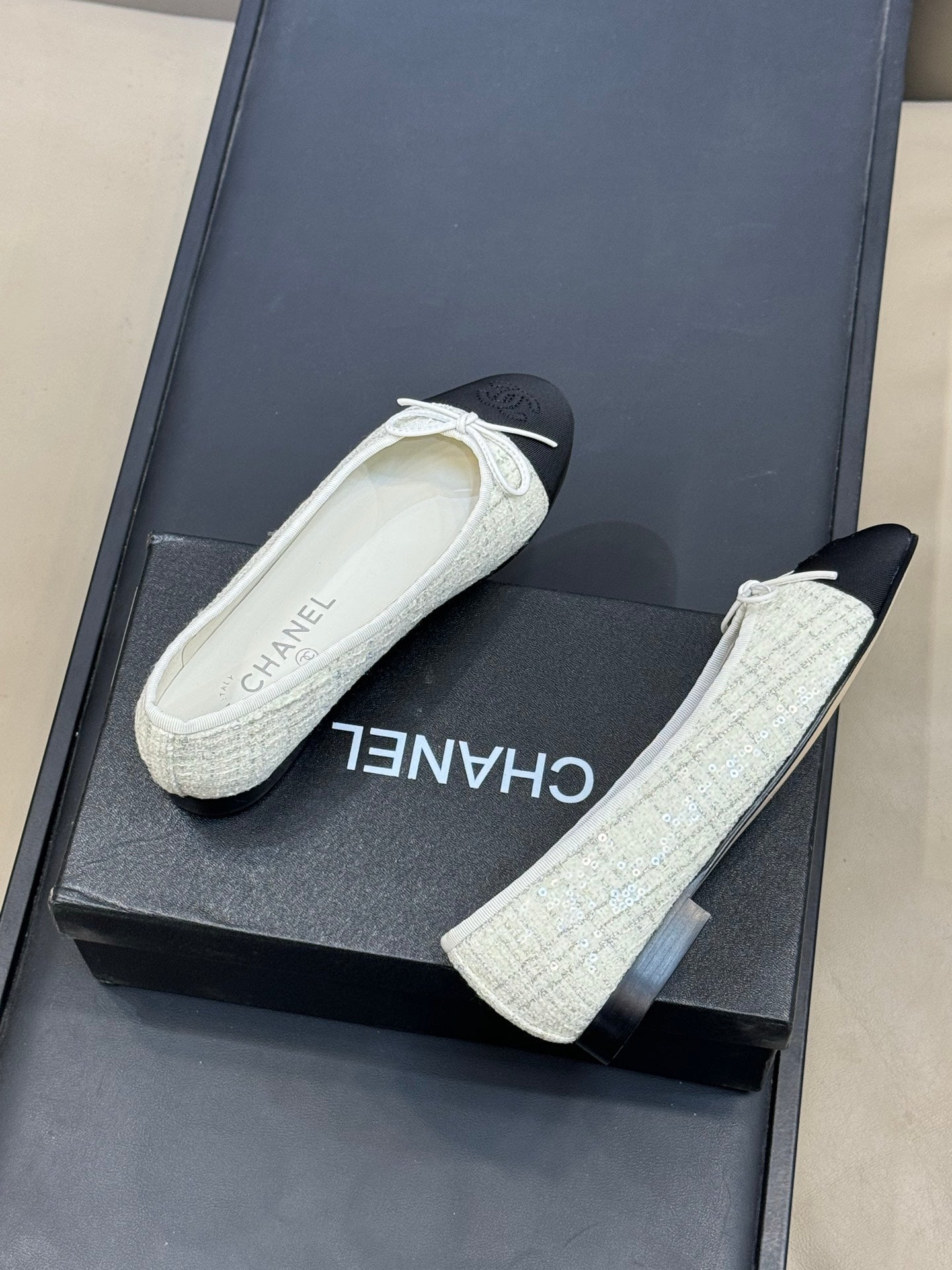 CC 26ss Ballet Flats Black White Tweed Fabric 623152