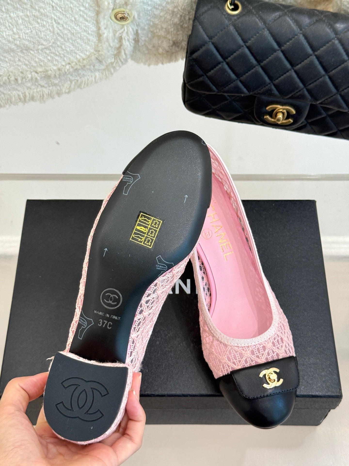 Chanel 25 Ballet Flat 50mm Pink Black Woven Lambskin 473052