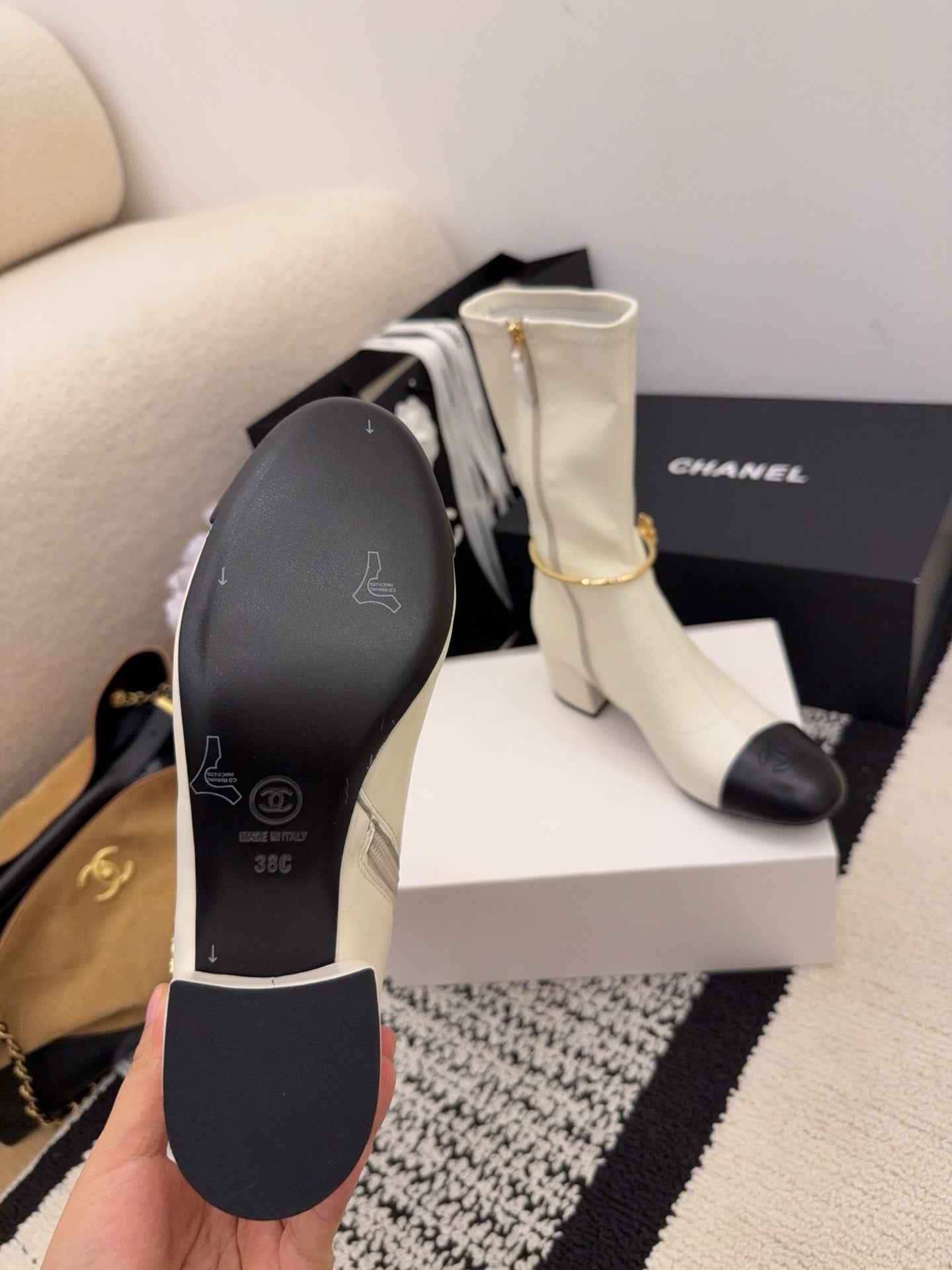 CC 26 Short Boot With Gold-tone Ankle Chain Cream Black Lambskin 588820