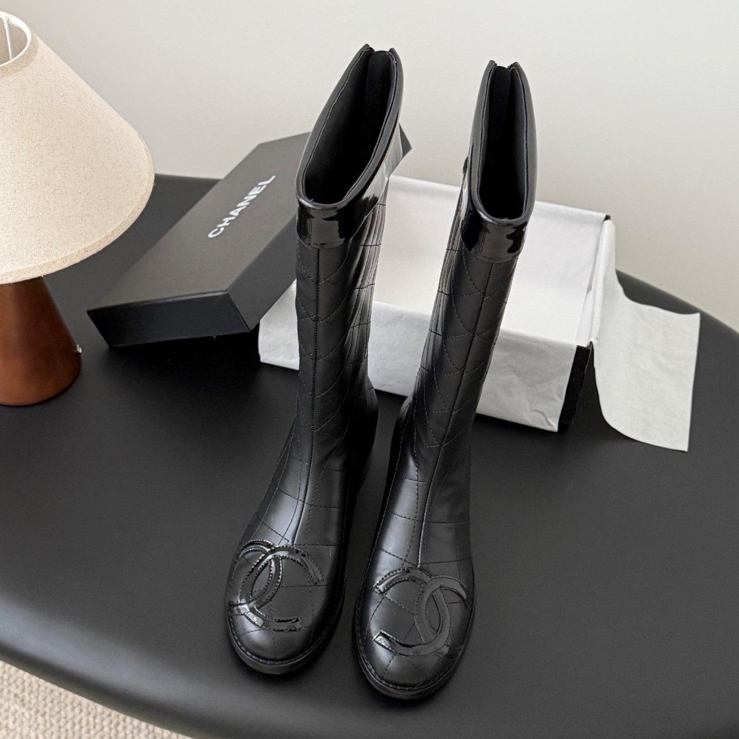 CC Cambon Mid-Calf Boots Black Cowhide Patent Leather 540765