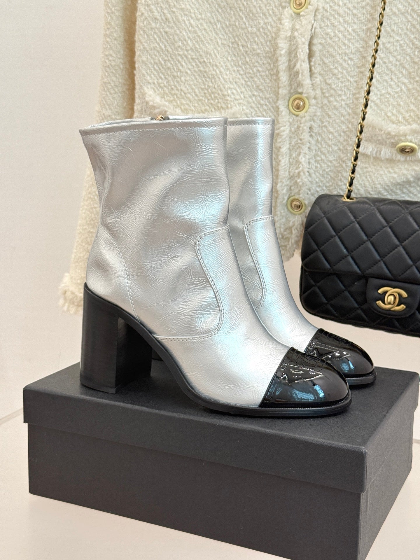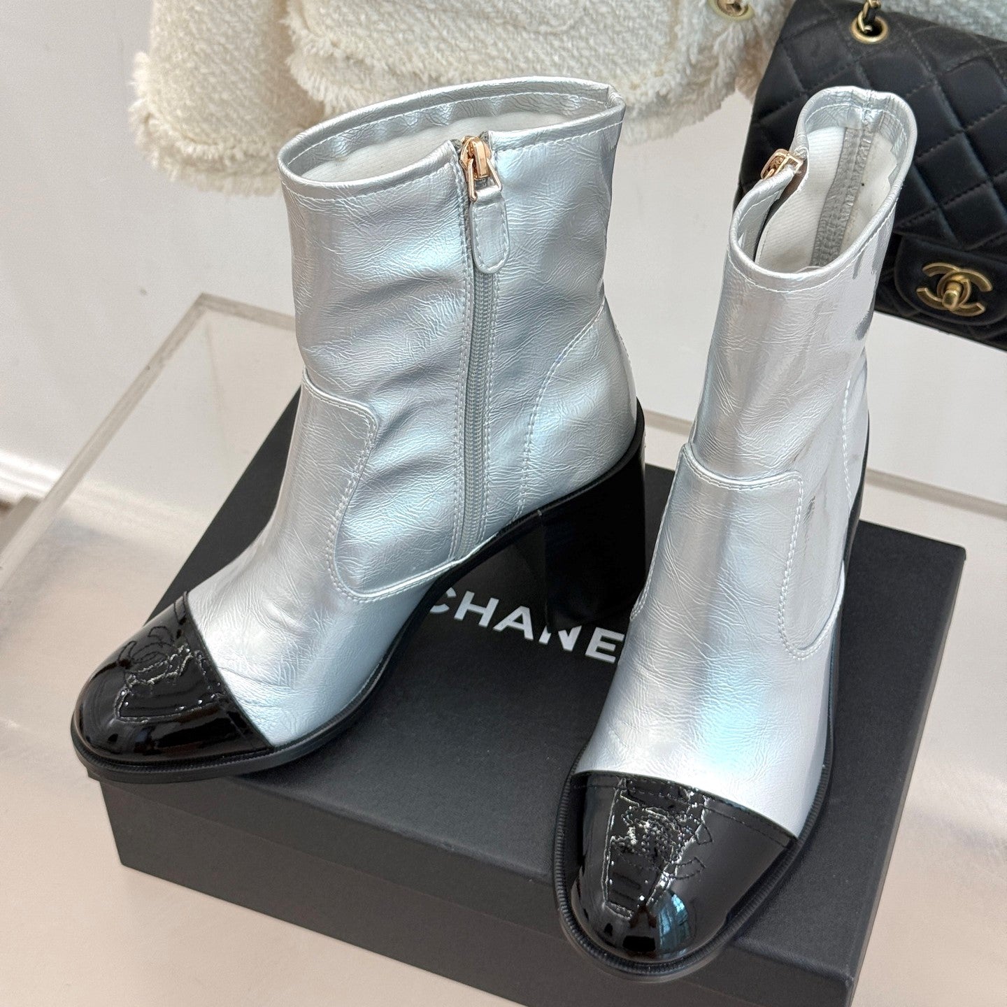 CC Classic Short Boots Block Heel 90mm Sliver Metalic Calfskin 465389
