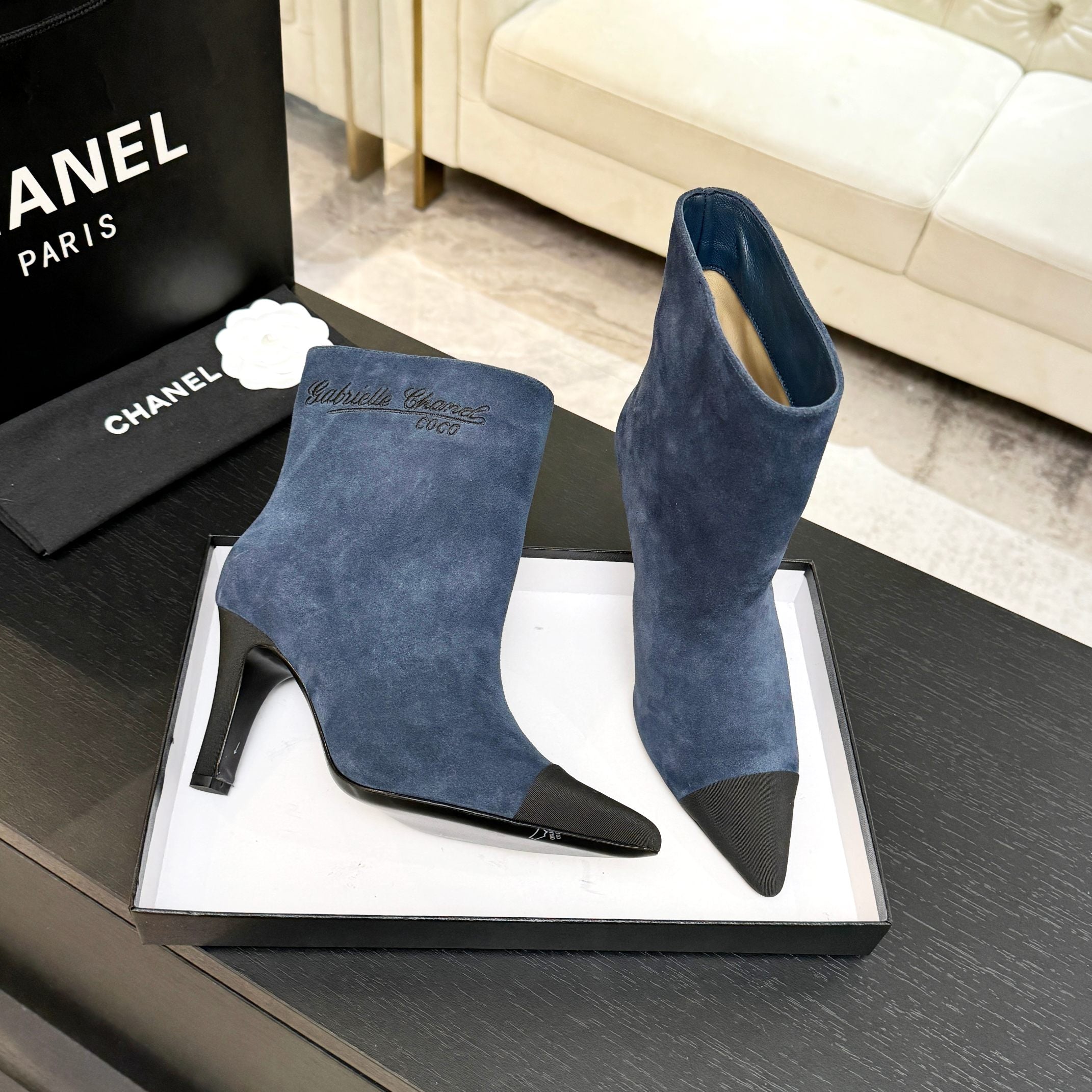 CC Gabrielle Chanel Ankle Boots 8.5cm Dark Blue Suede Black Fabric