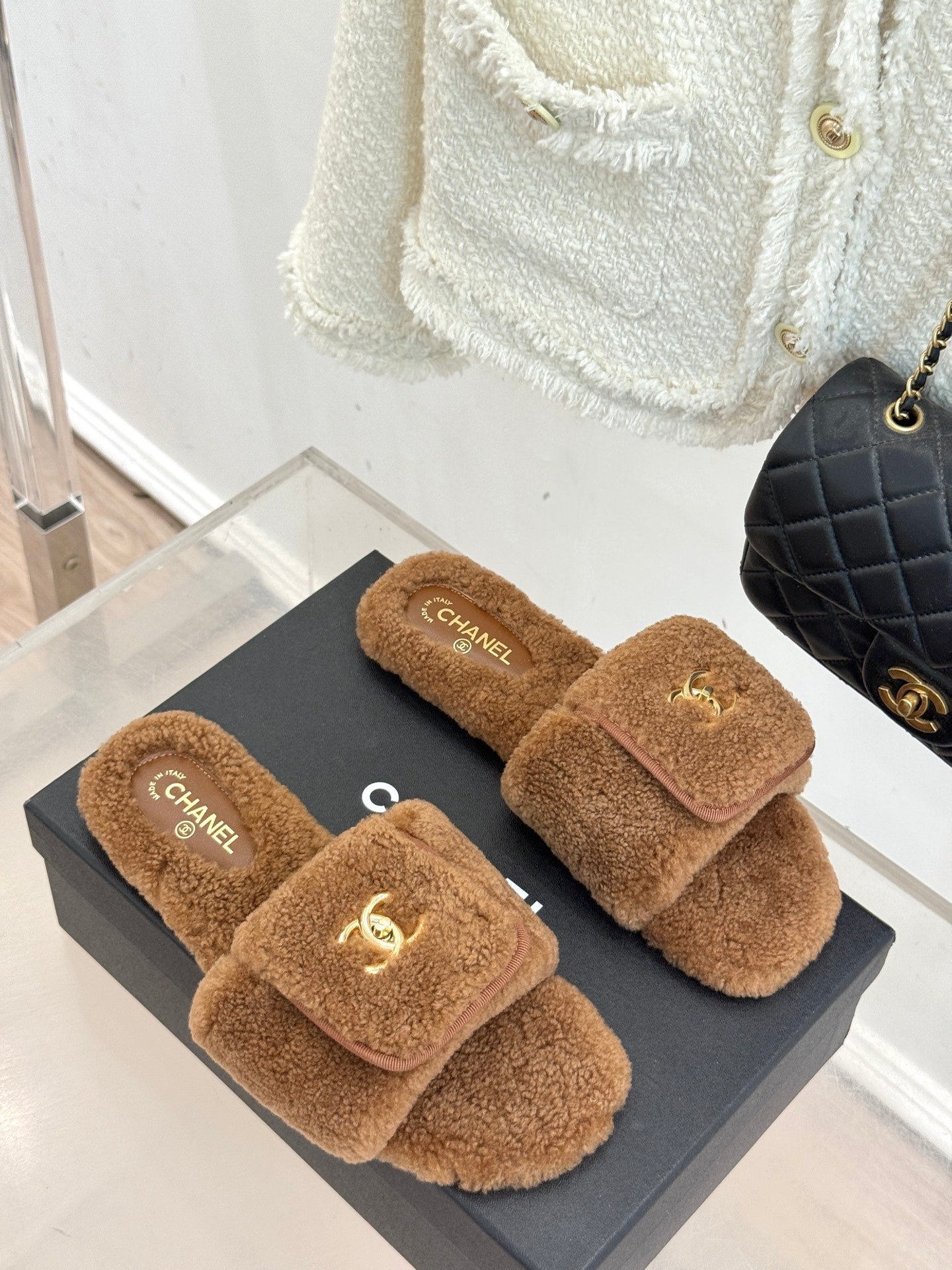 Chanel 25 Buckle Flip-up Thick-soled Slippers Brown Wool 465381