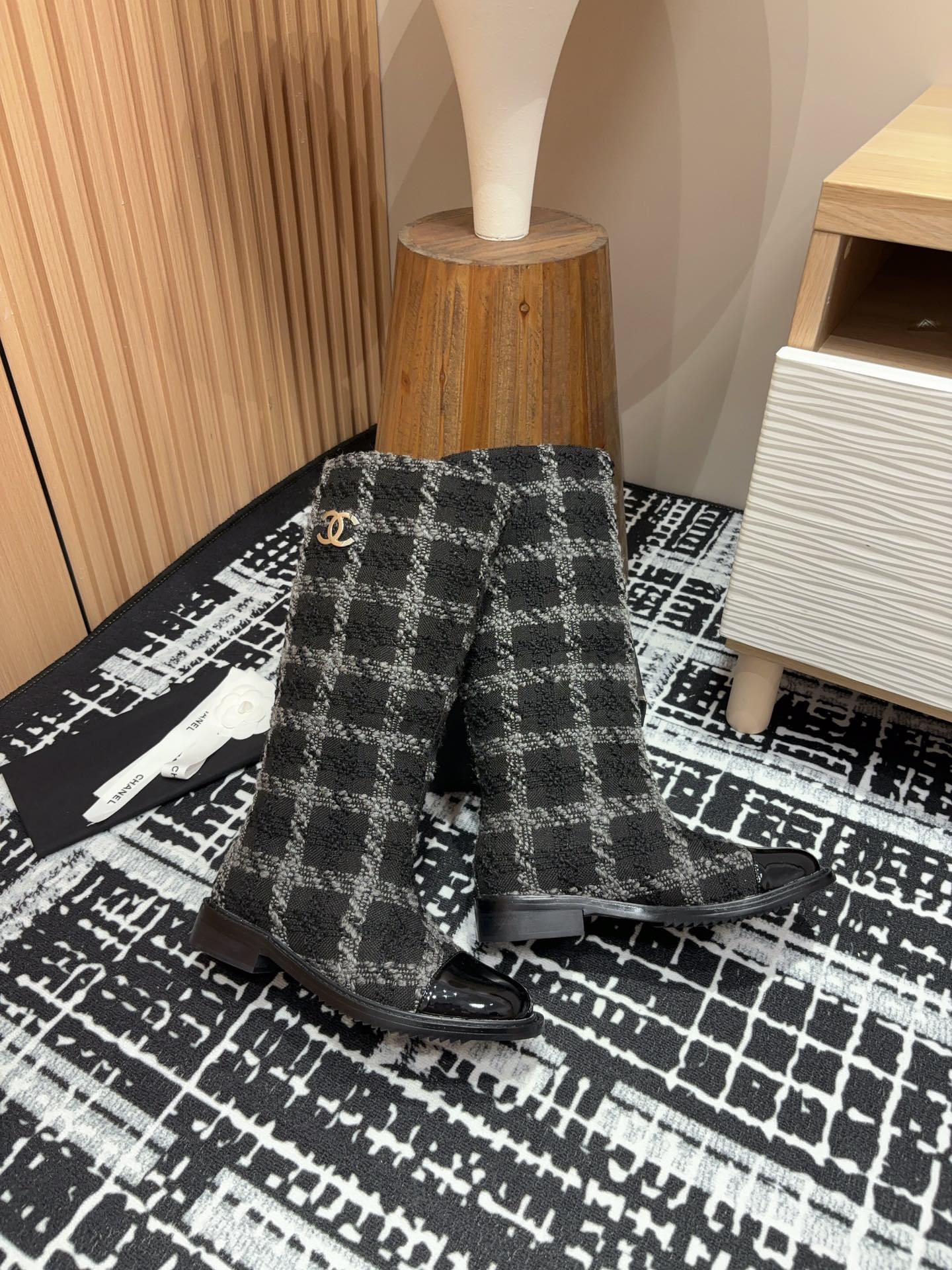 CC High Boots In Black Mix White Wool Tweed And Lambskin