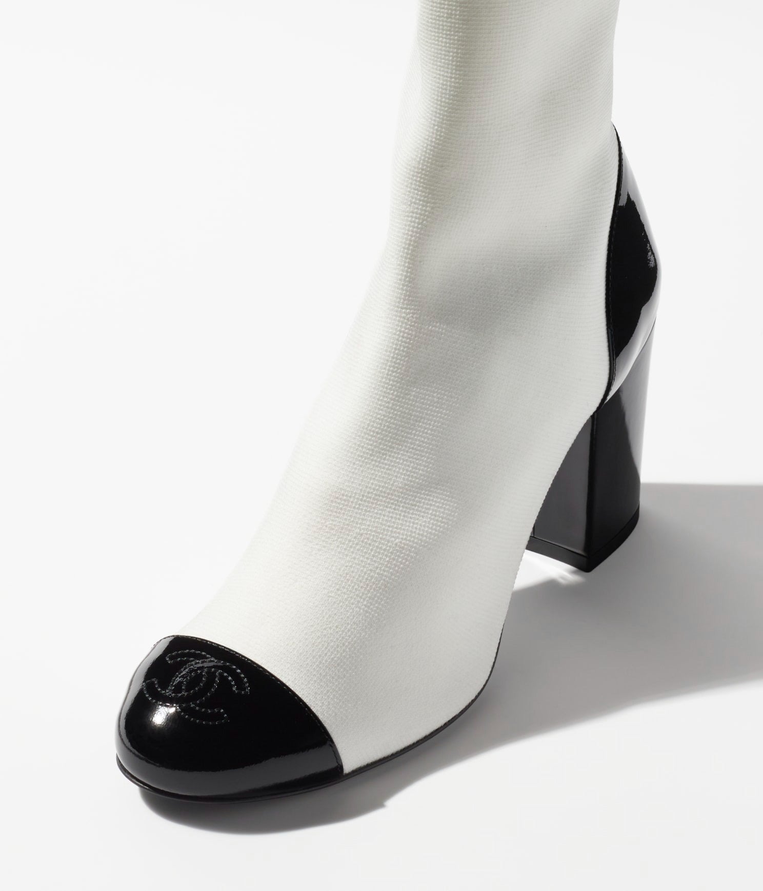 CC LOW CUT BOOTS IN WHITE STRETCH LAMBSKIN AND GROSGRAIN WITH PEARL CHAIN