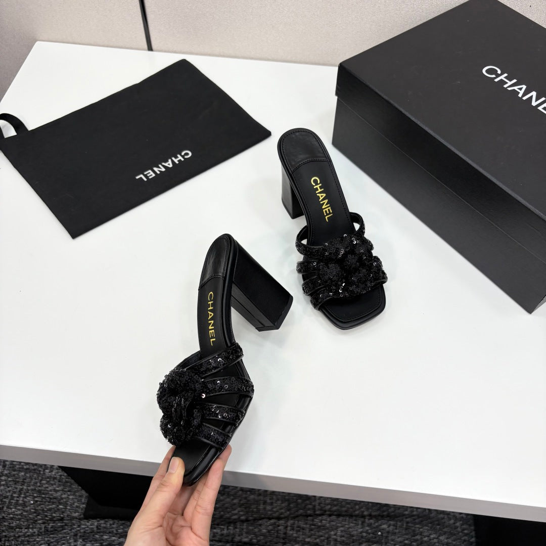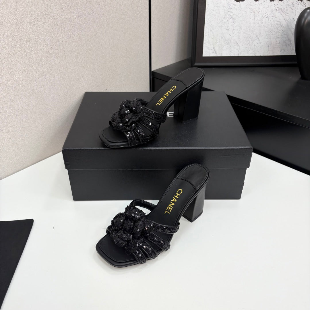 CC 25 Camellia Open Heel Mule Sandals 90mm Black Coarse Glitter Fabric And Sheepskin 368846