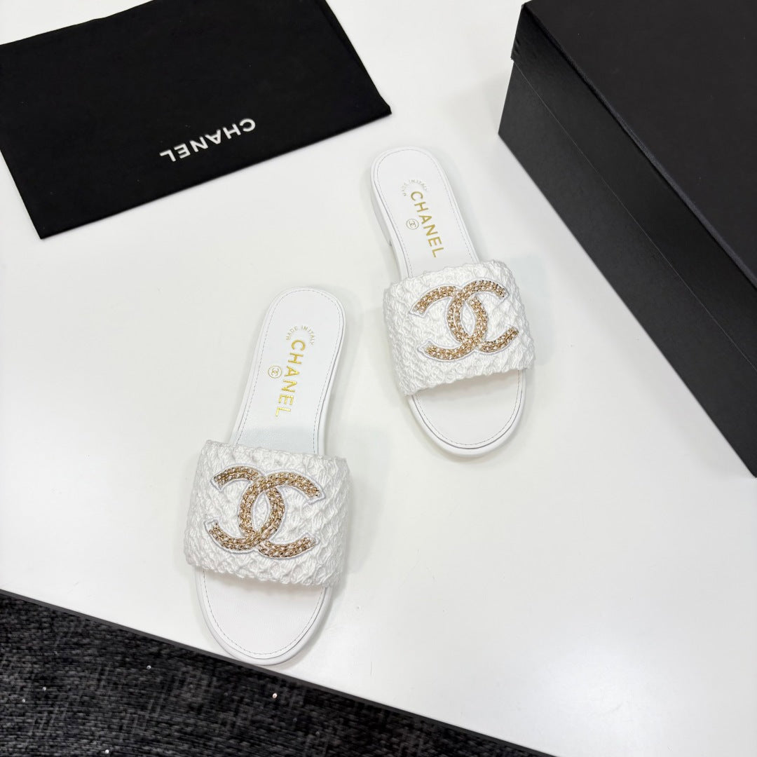 CC 25 Doubble Chain Embroidered Slippers White Fabric And Sheepskin 352492
