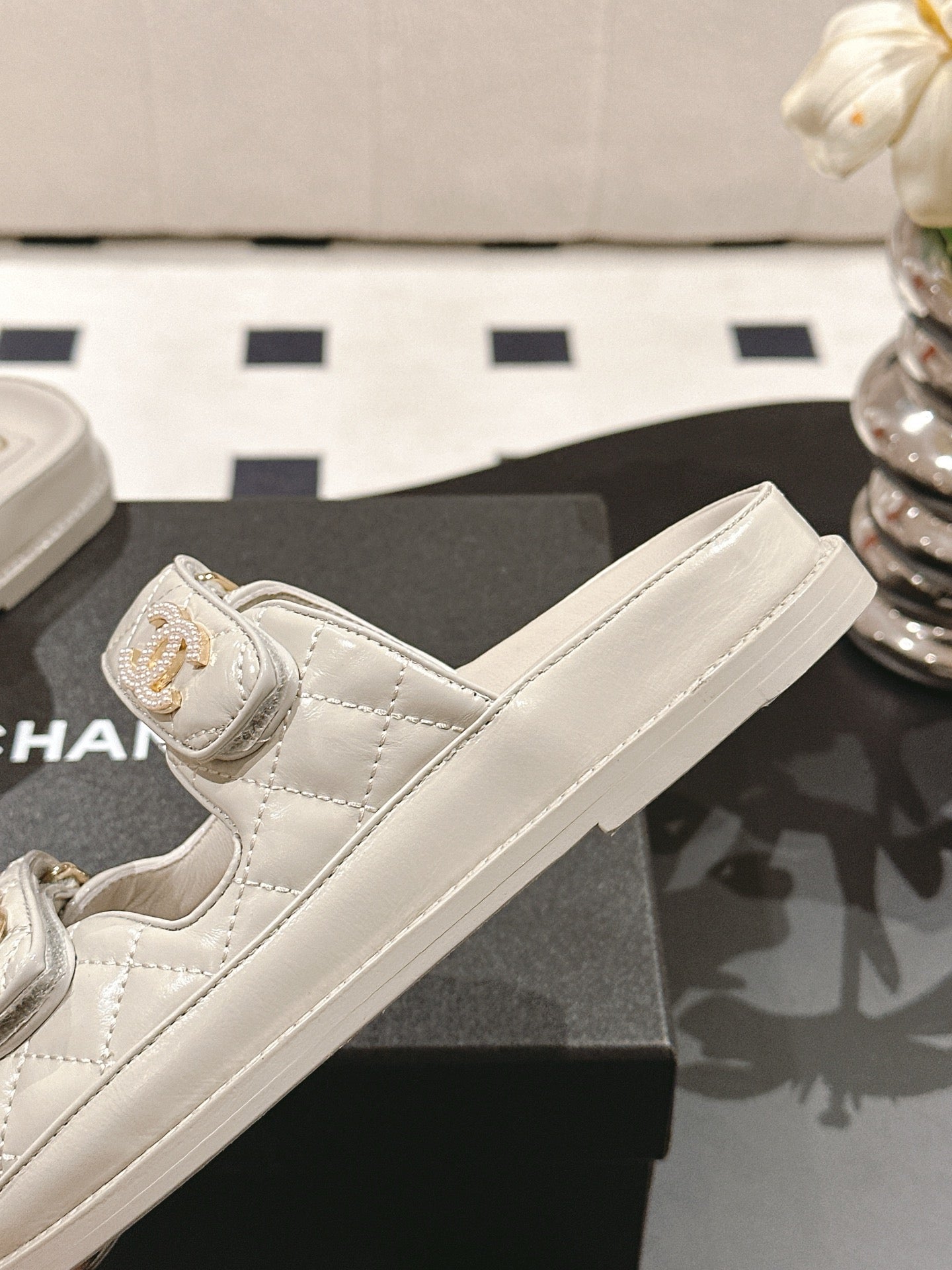 cc 25p logo with pearl mule sandal grey leather 237584