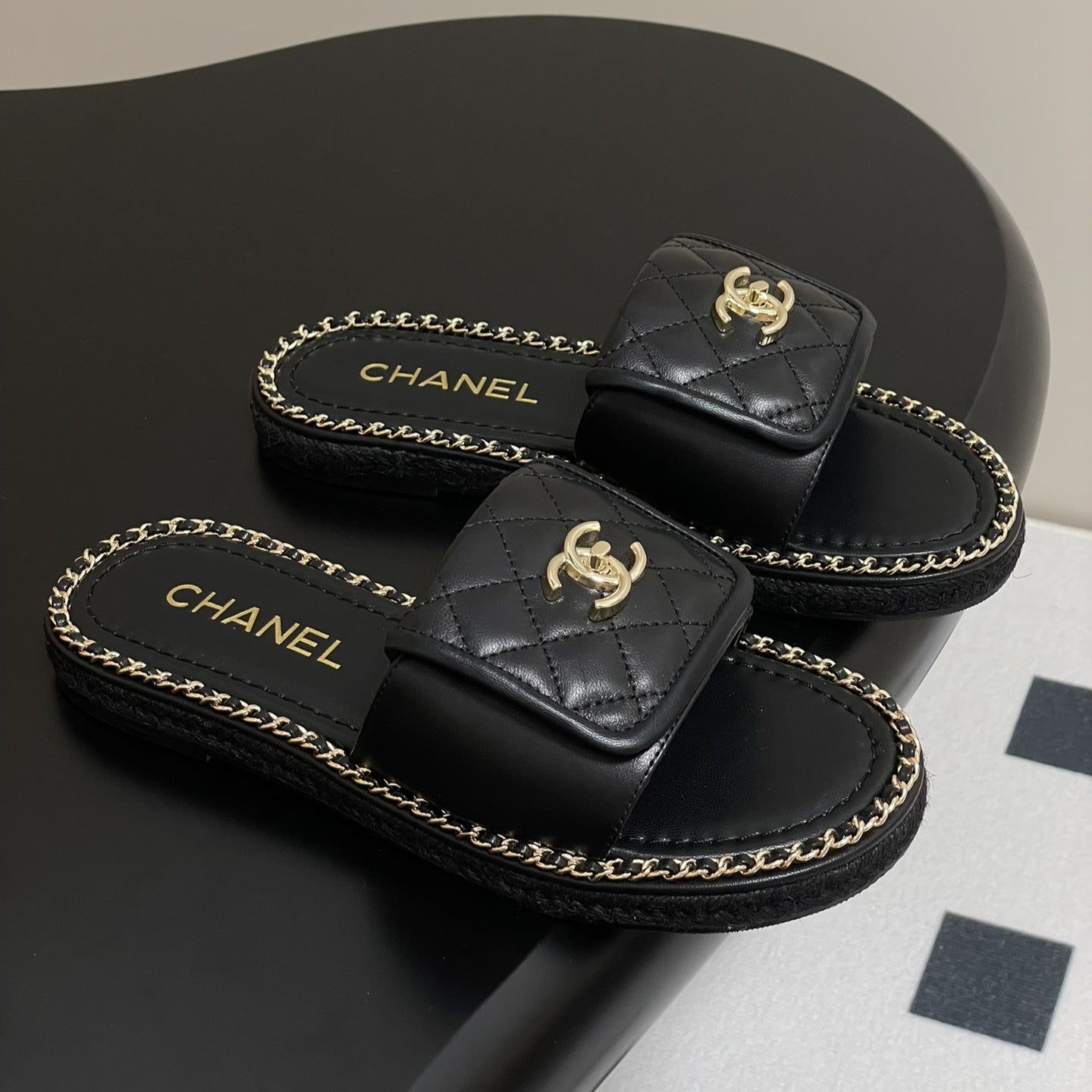CC 25S Chain Ring Edge Buckle Bag Mule Sandal Black Sheepskin 247588