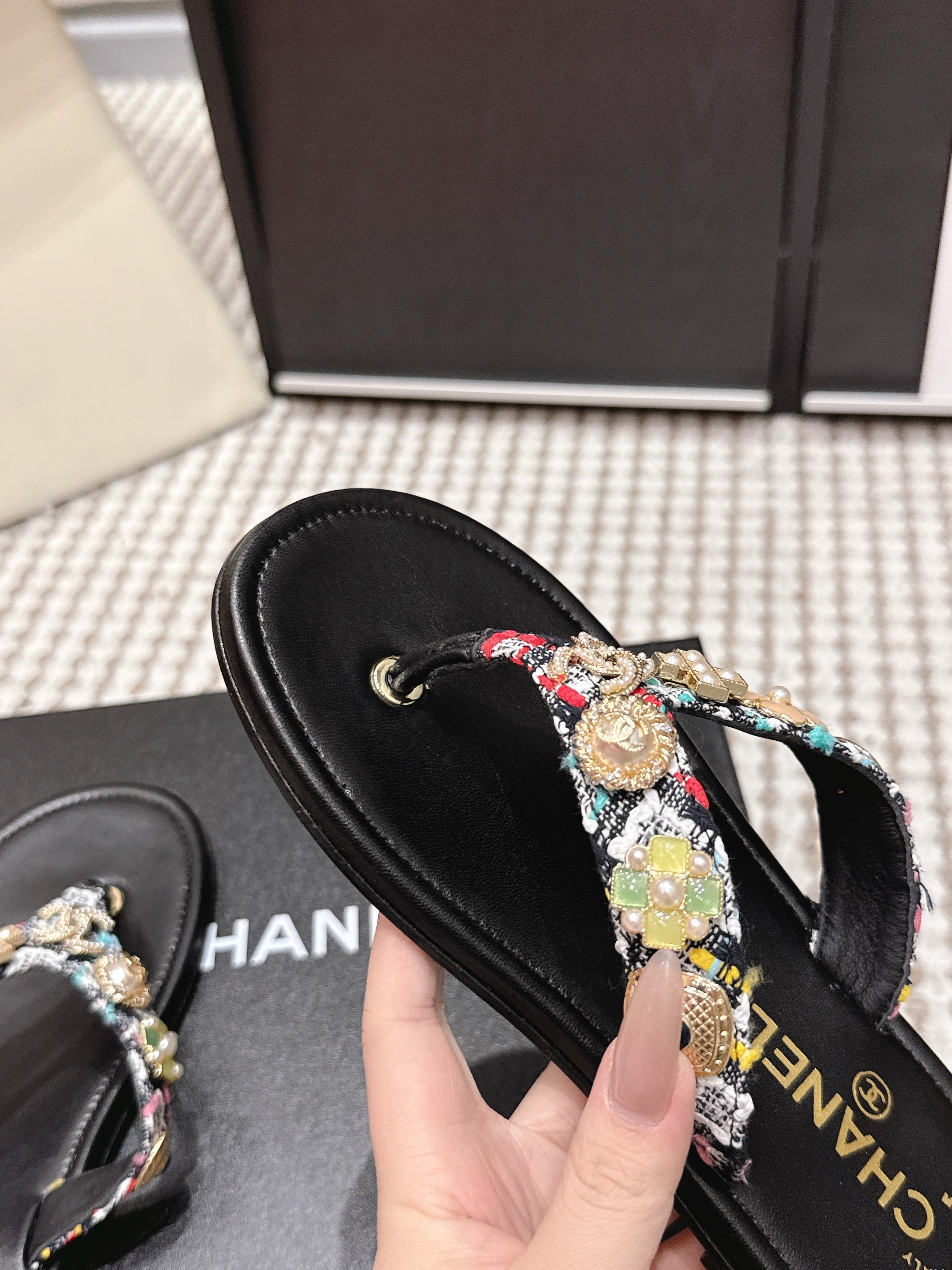 CC 26s Flip-Flop Black With Multicolor Tweed Sheepskin 632366
