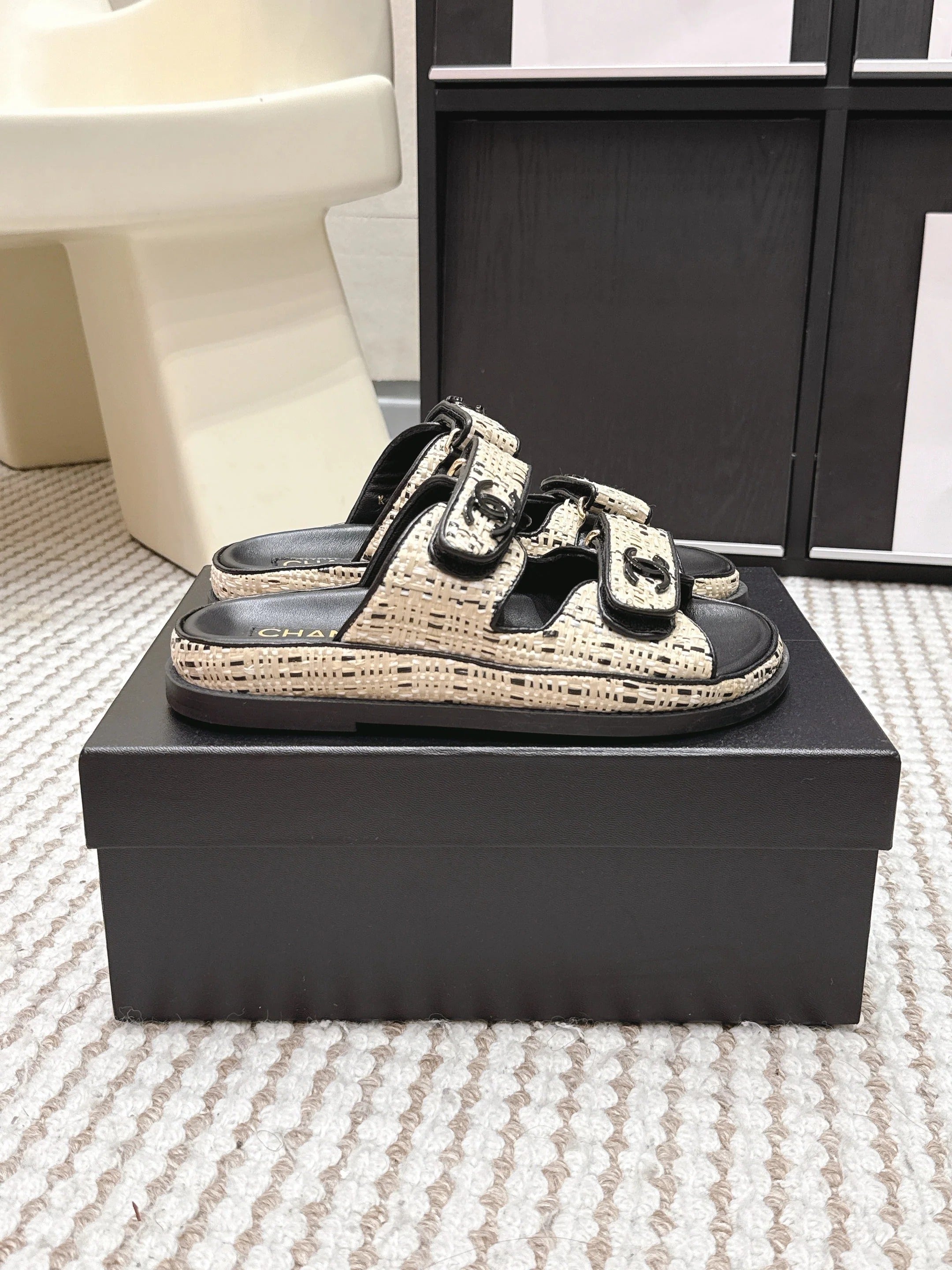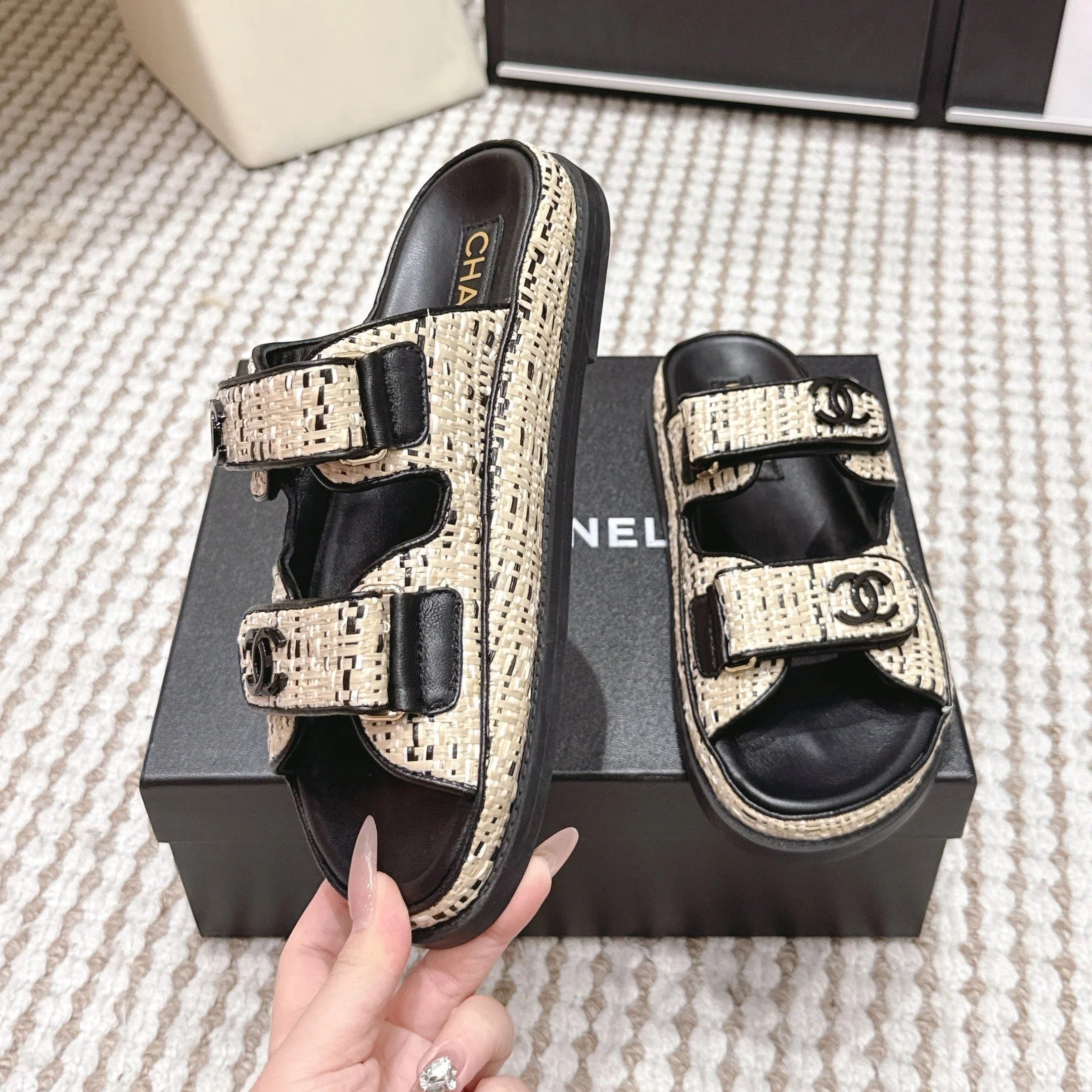 CC 26s Sandals Black Beige Leather Raffia 632396
