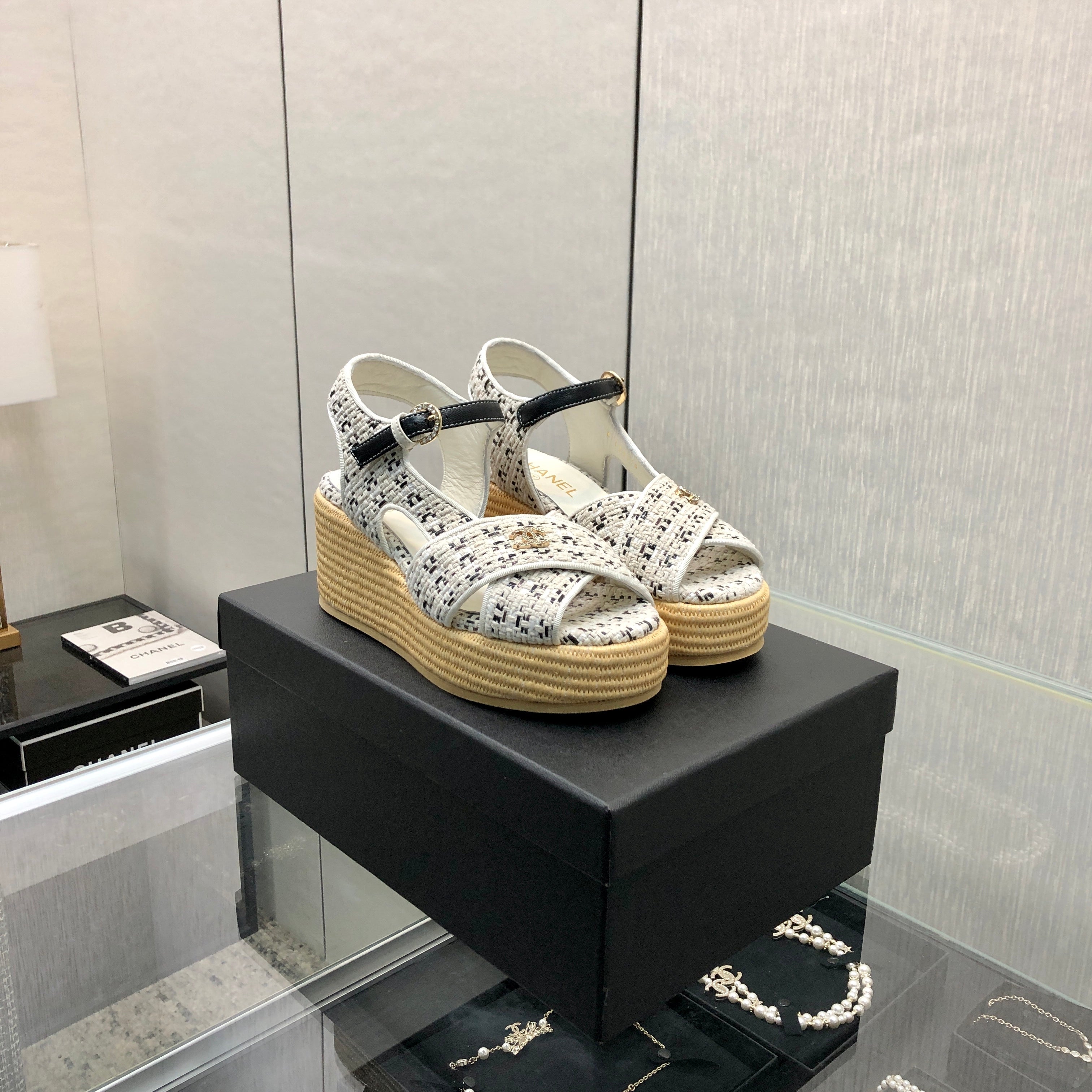PEEP-TOE THICK SOLE SANDALS IN WHITE MIX BLACK WOVEN FABRIC