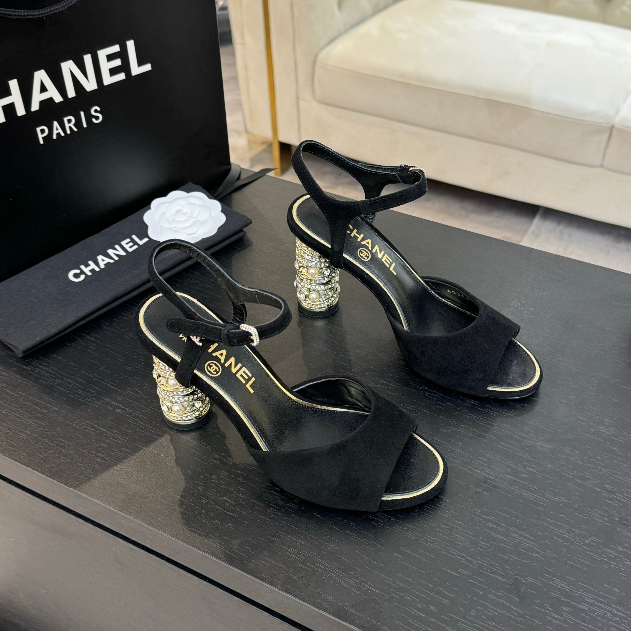 T-STRAP PEARL HEEL 85 MM SANDALS IN BLACK SUEDE