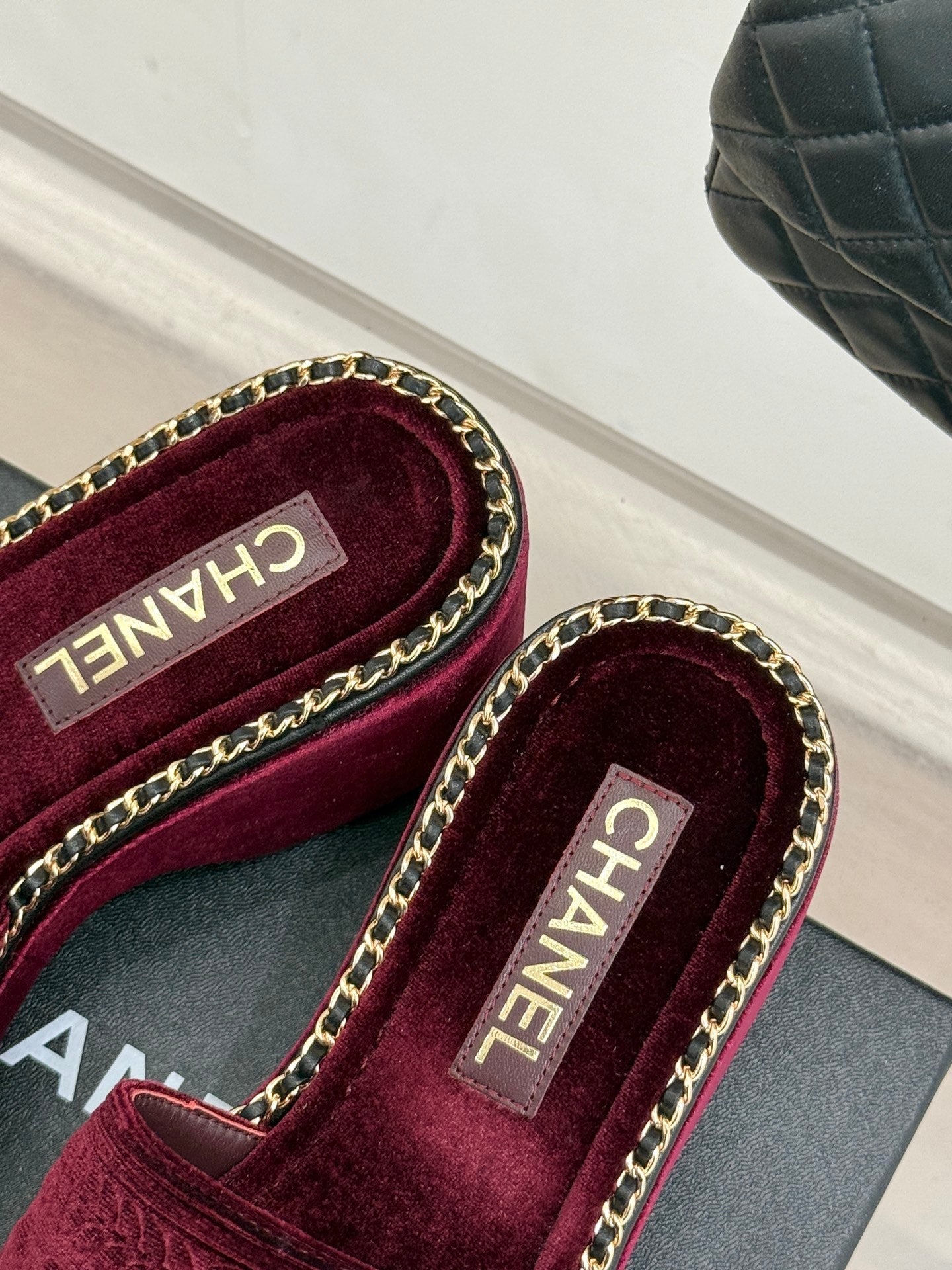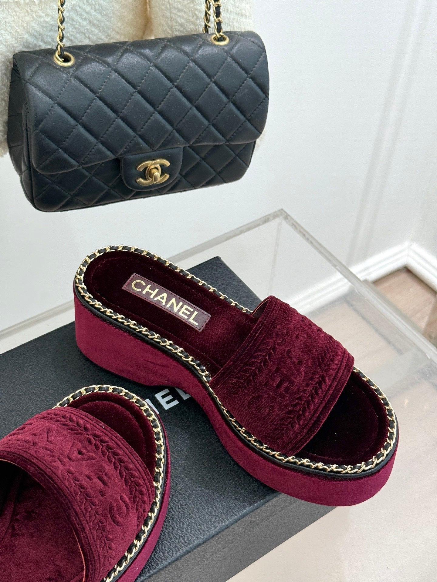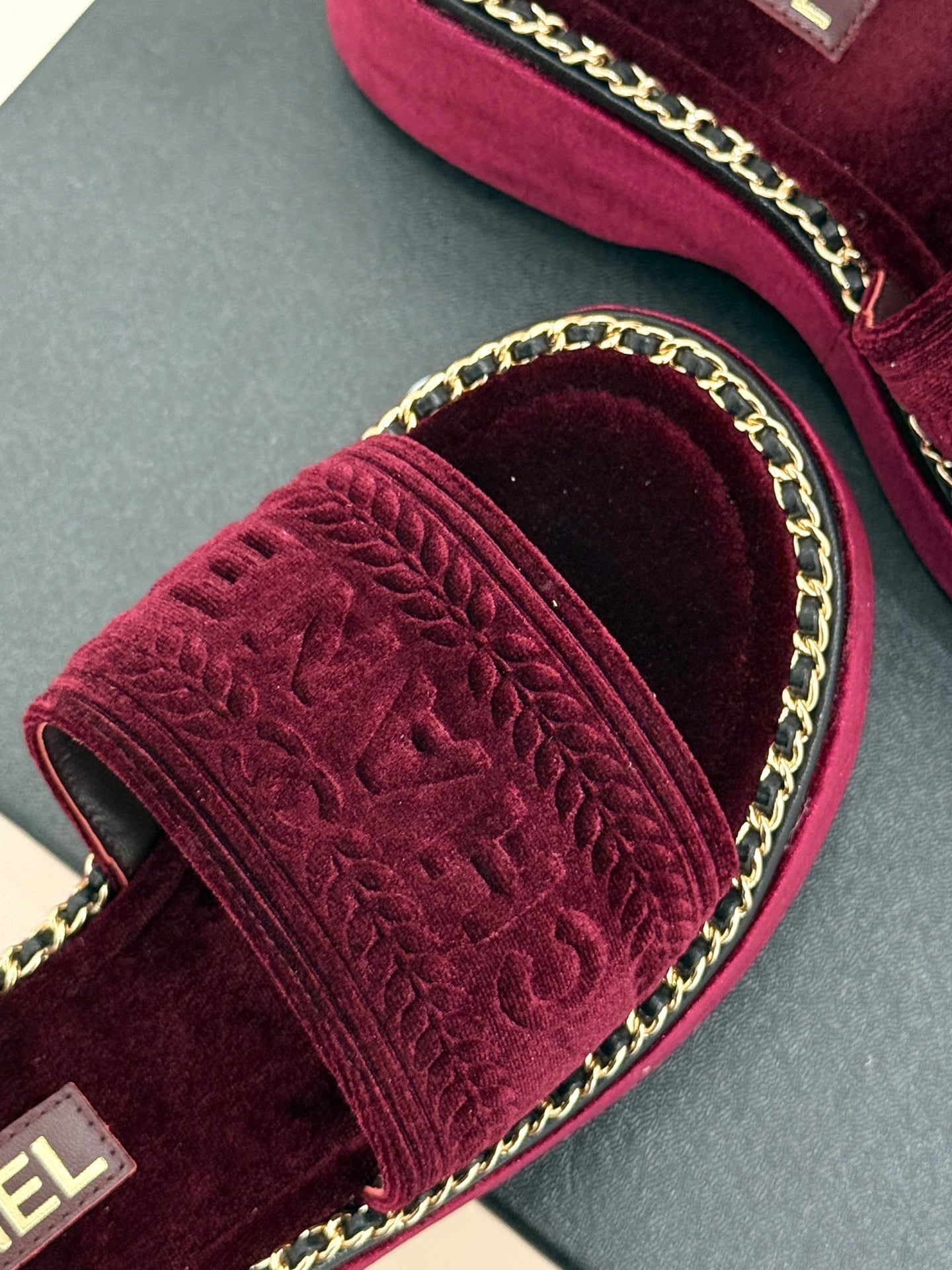 THICK SOLE WEDGE SLIPPERS IN MAROON RED VELVET