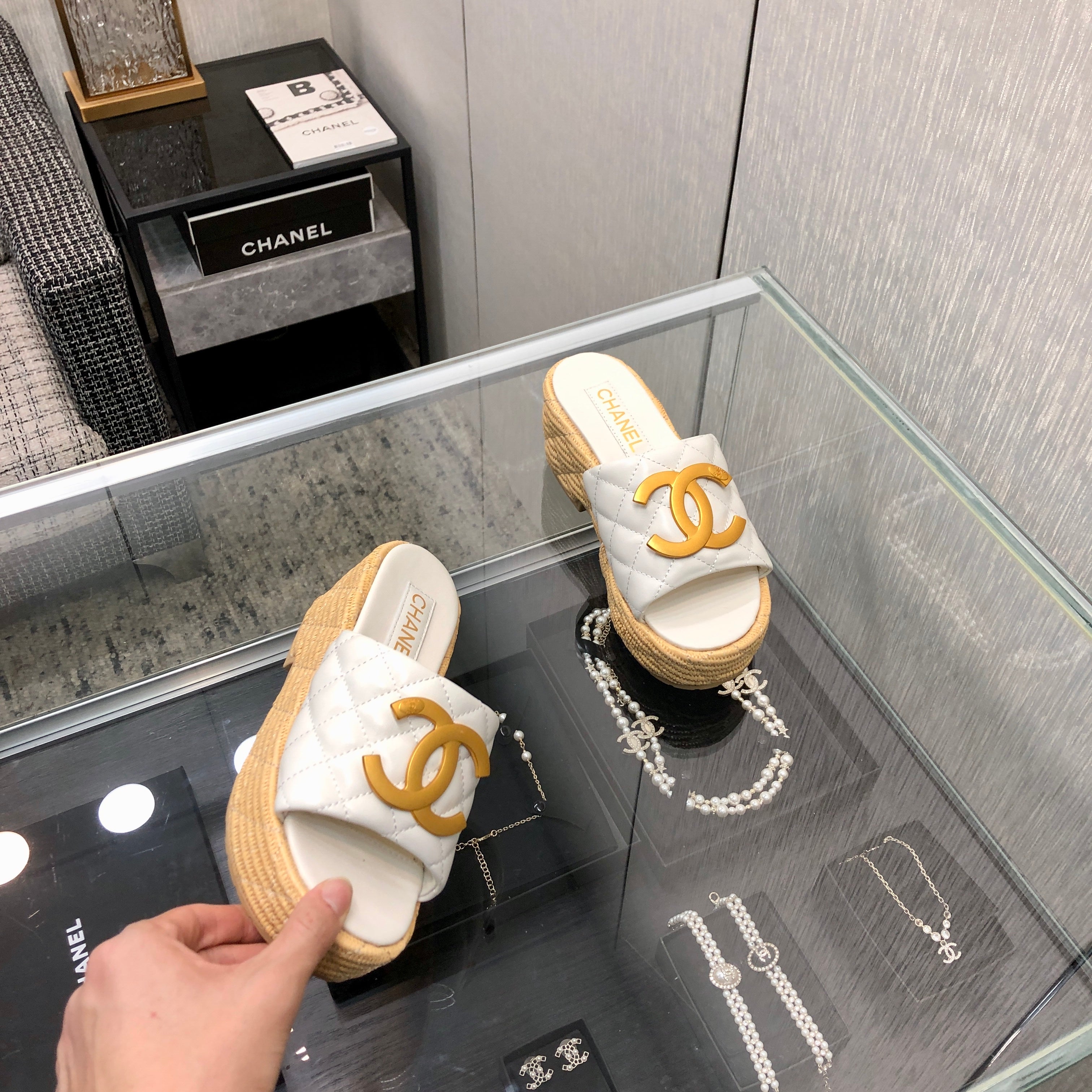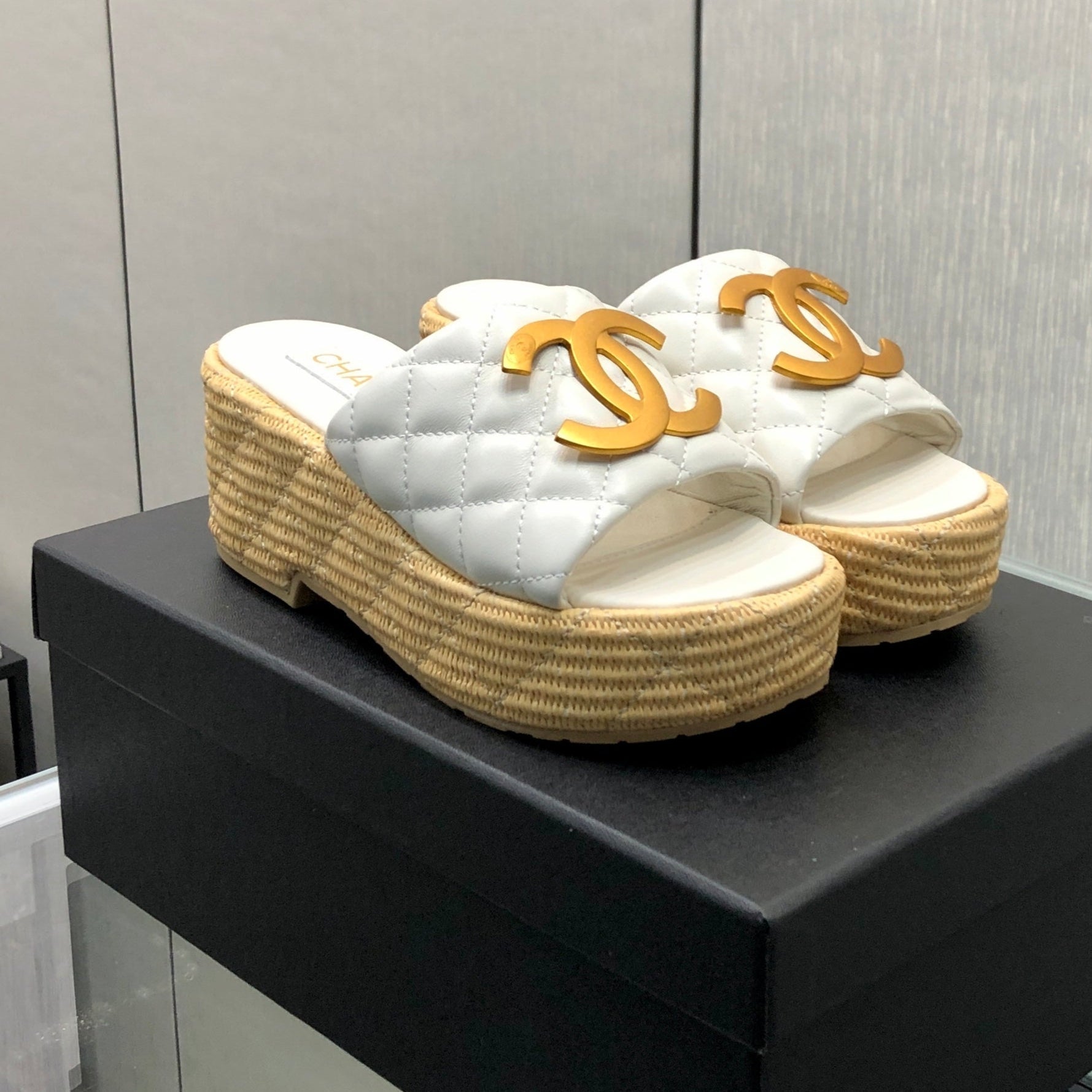 THICK SOLE WEDGE SLIPPERS IN WHITE LAMBSKIN AND BEIGE RUBBER