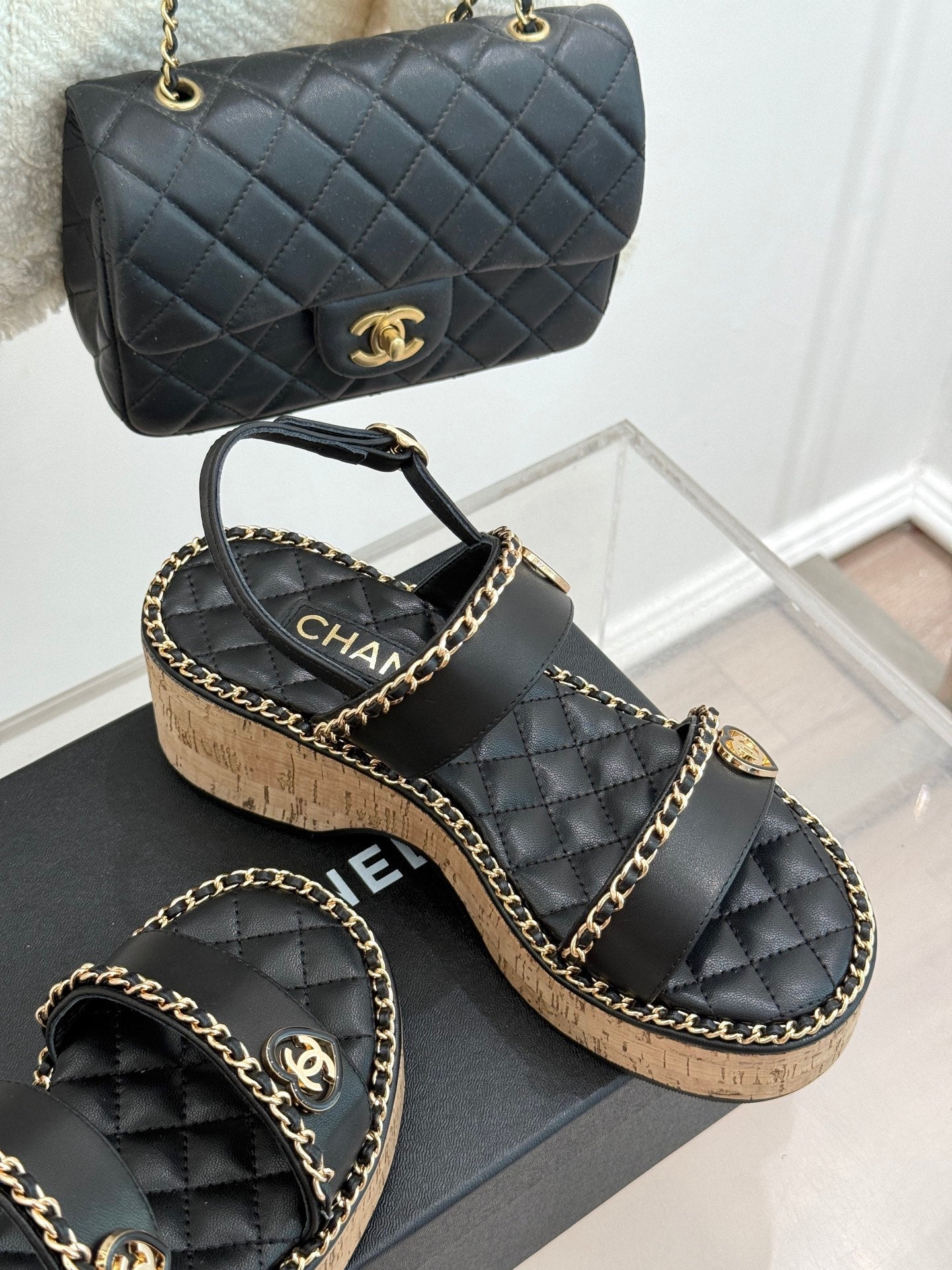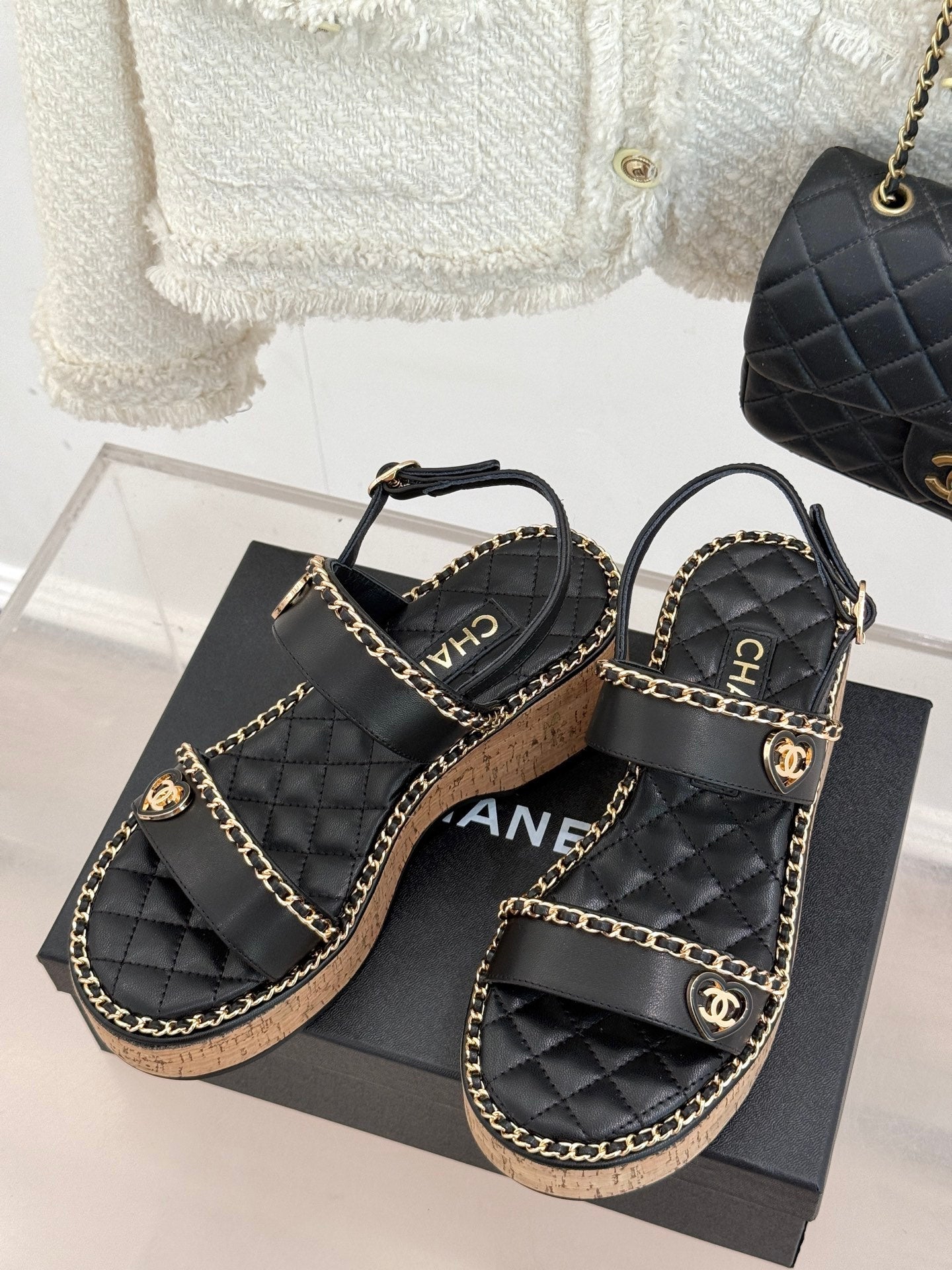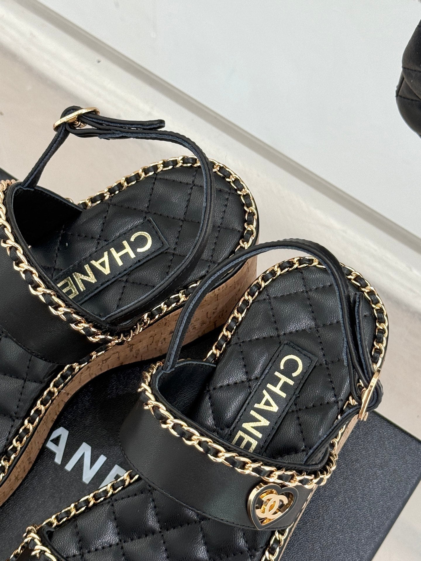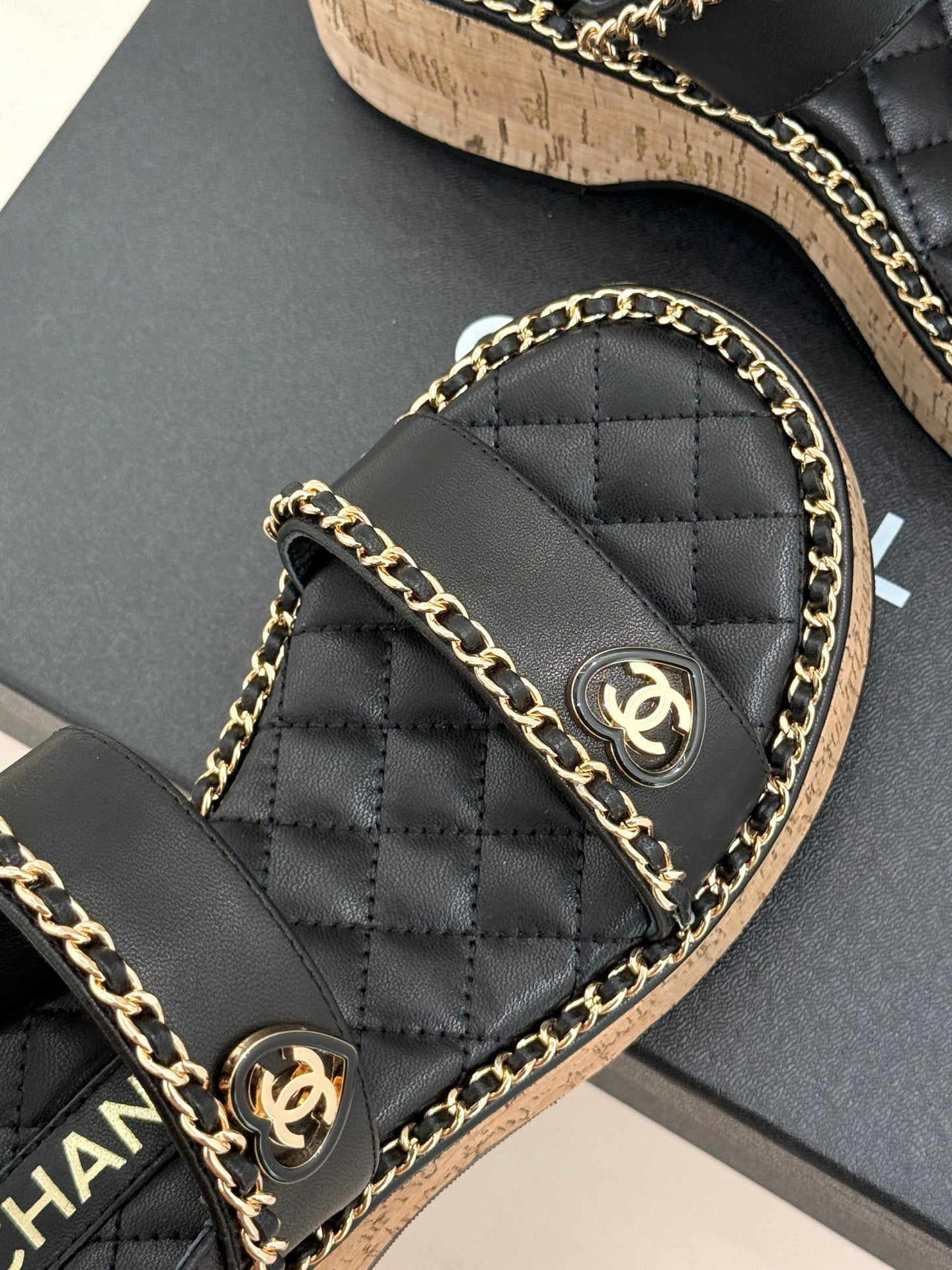 THICK-SOLED CHAIN HEART SANDAL IN BLACK LAMBSKIN