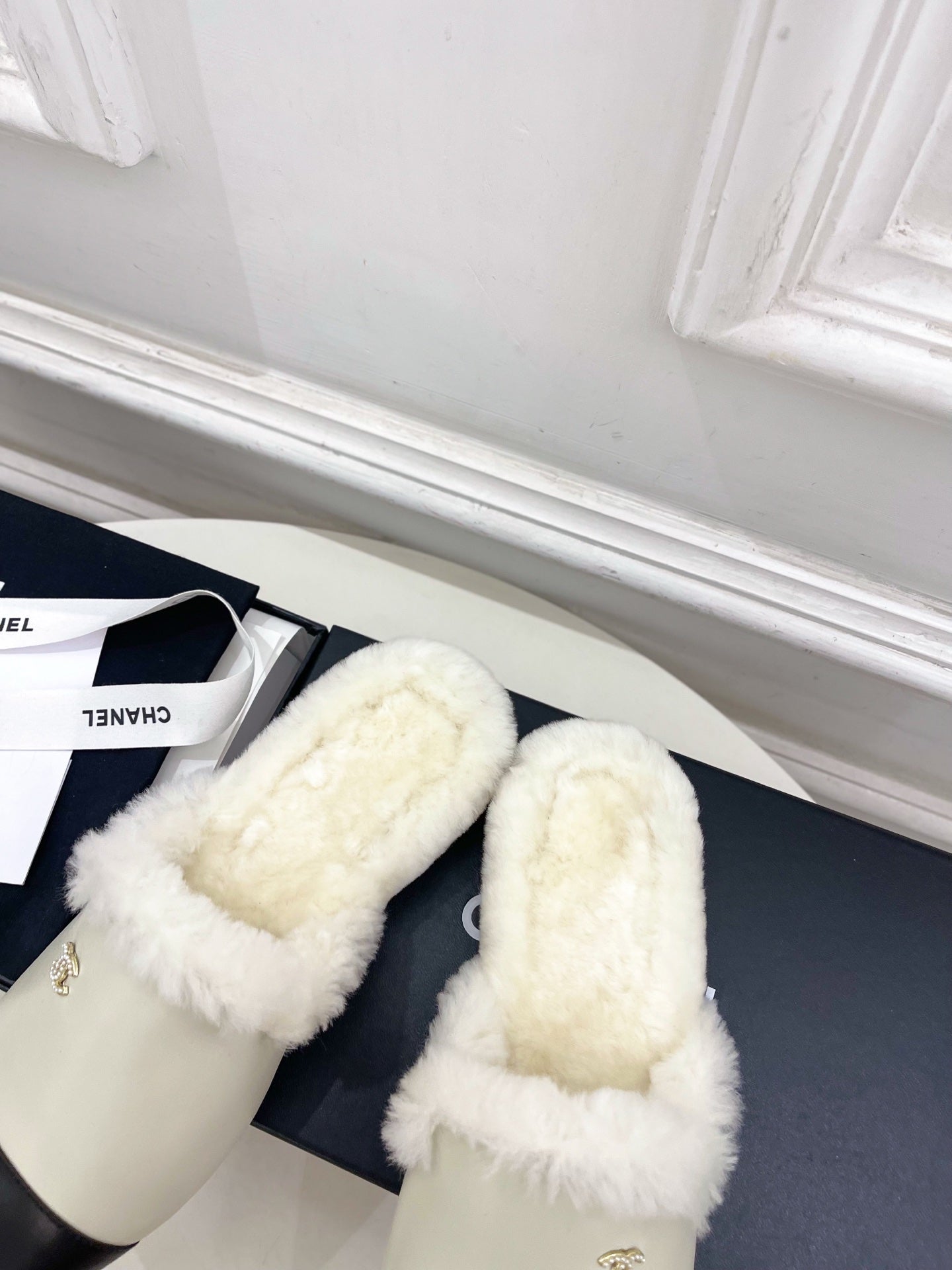 CC 25K Double C Pearl Fur Slippers Black Warm Beige Calfskin Shearing 586998