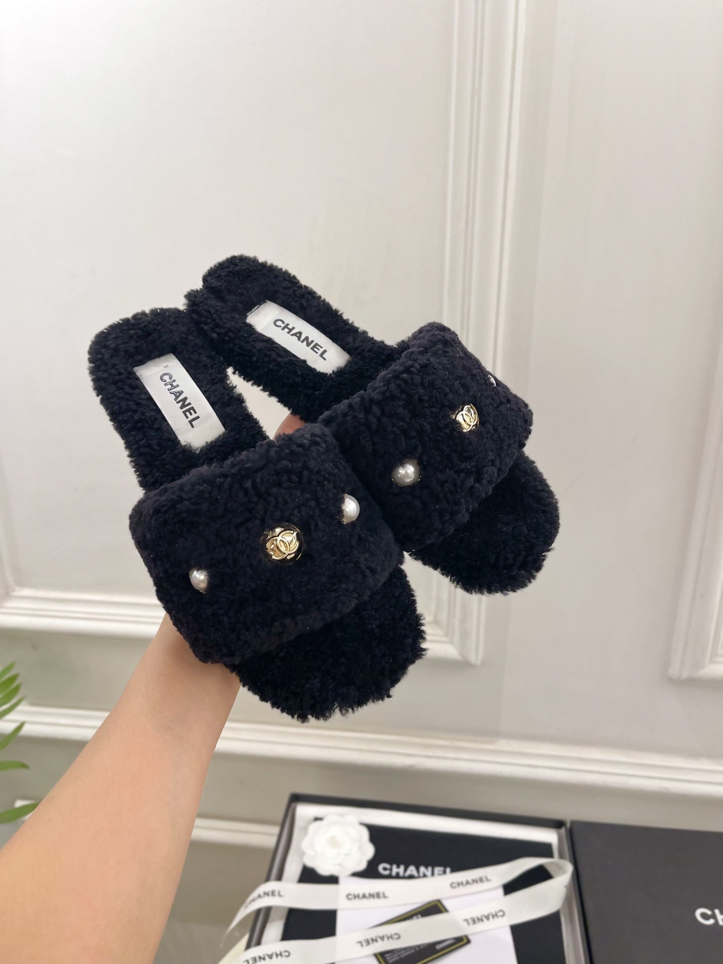 CC 25K Double C Pearl Fur Slippers Black Shearing 587000