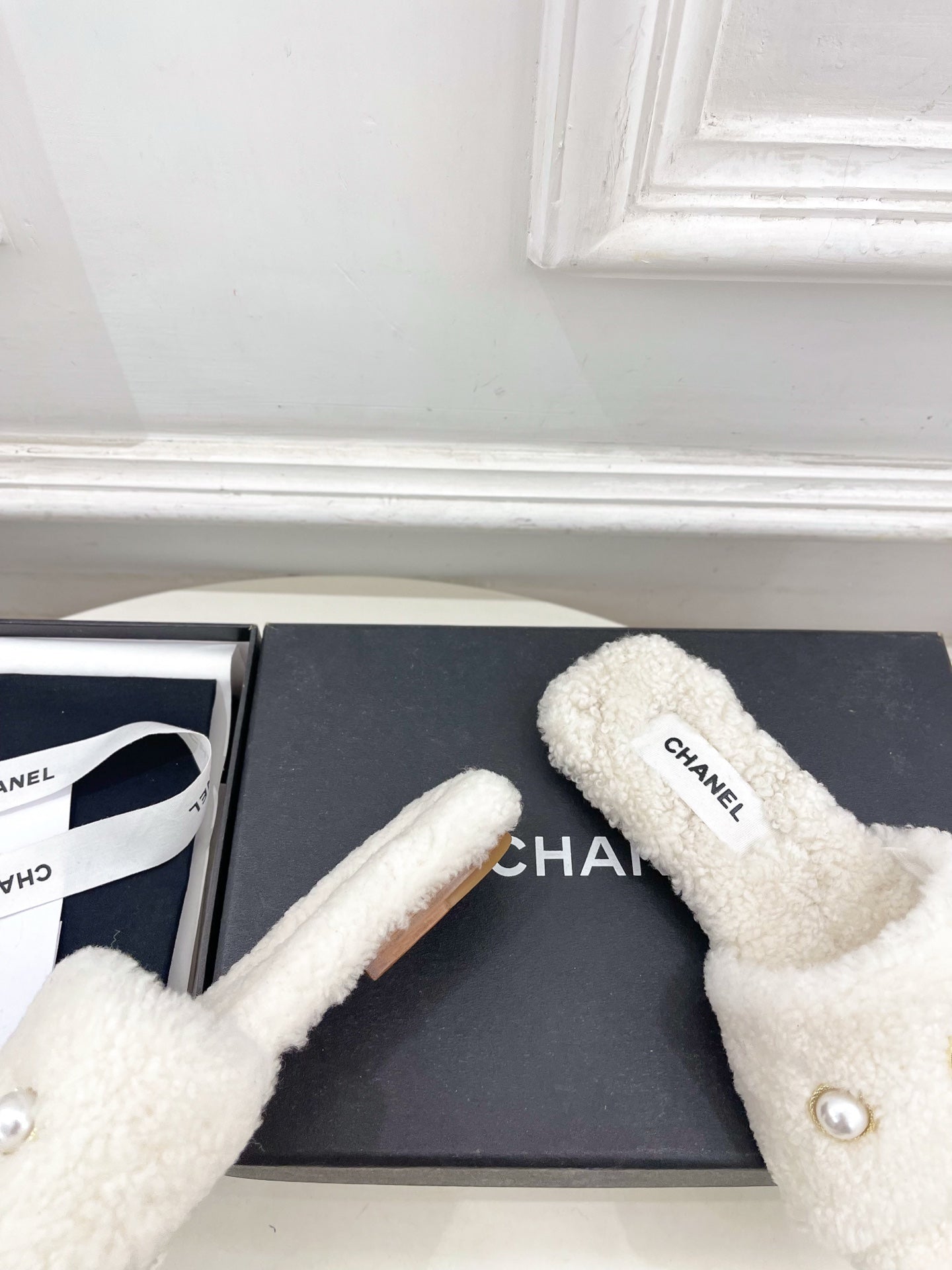 CC 25K Double C Pearl Fur Slippers Black White Calfskin Shearing 586997
