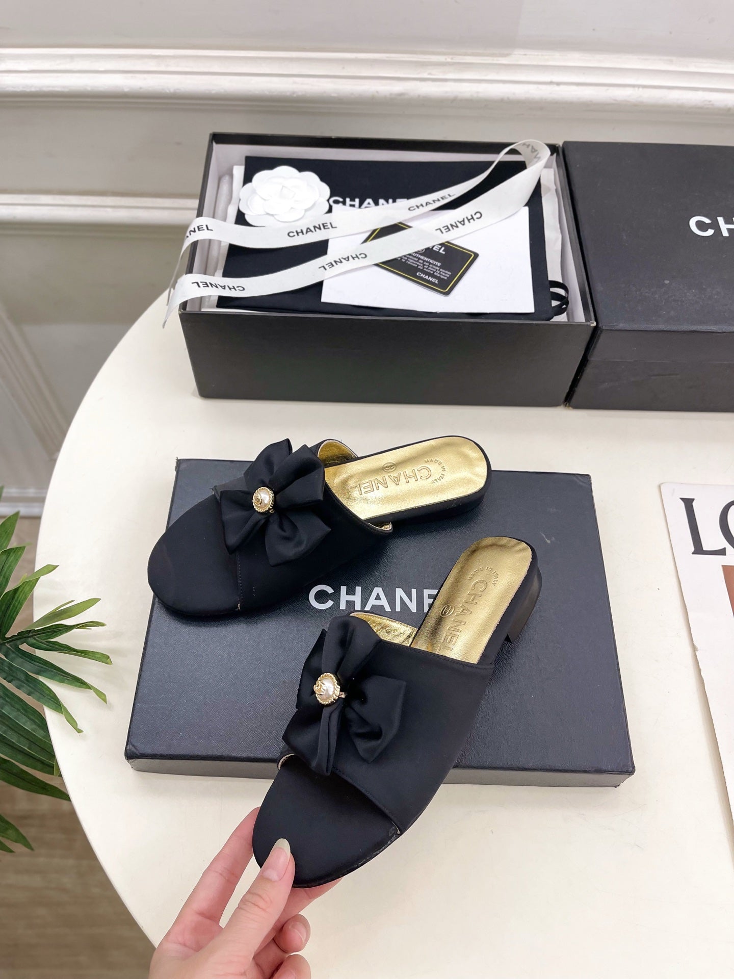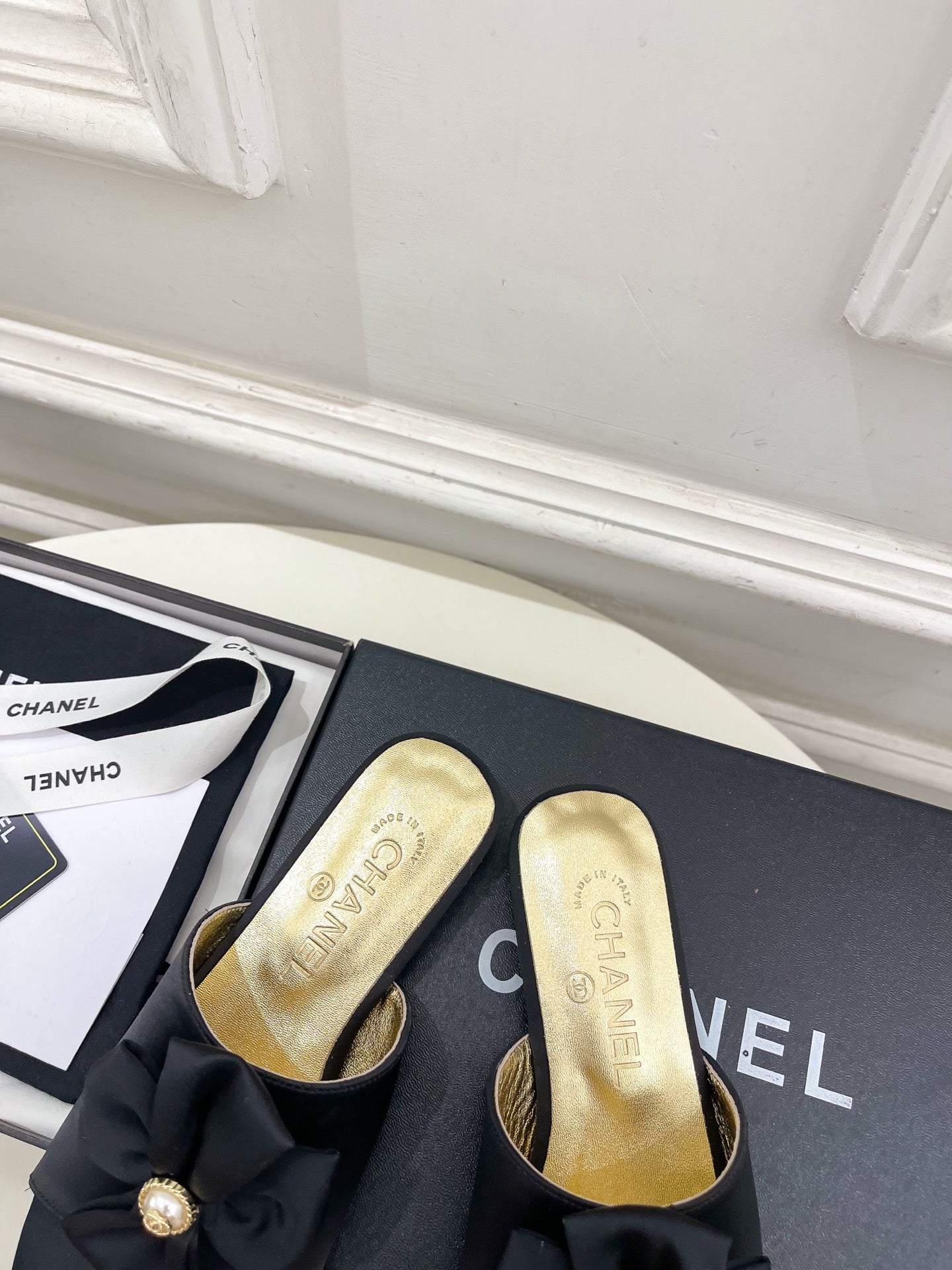 CC 26s Bow Slippers Black Satin Sheepskin 586896