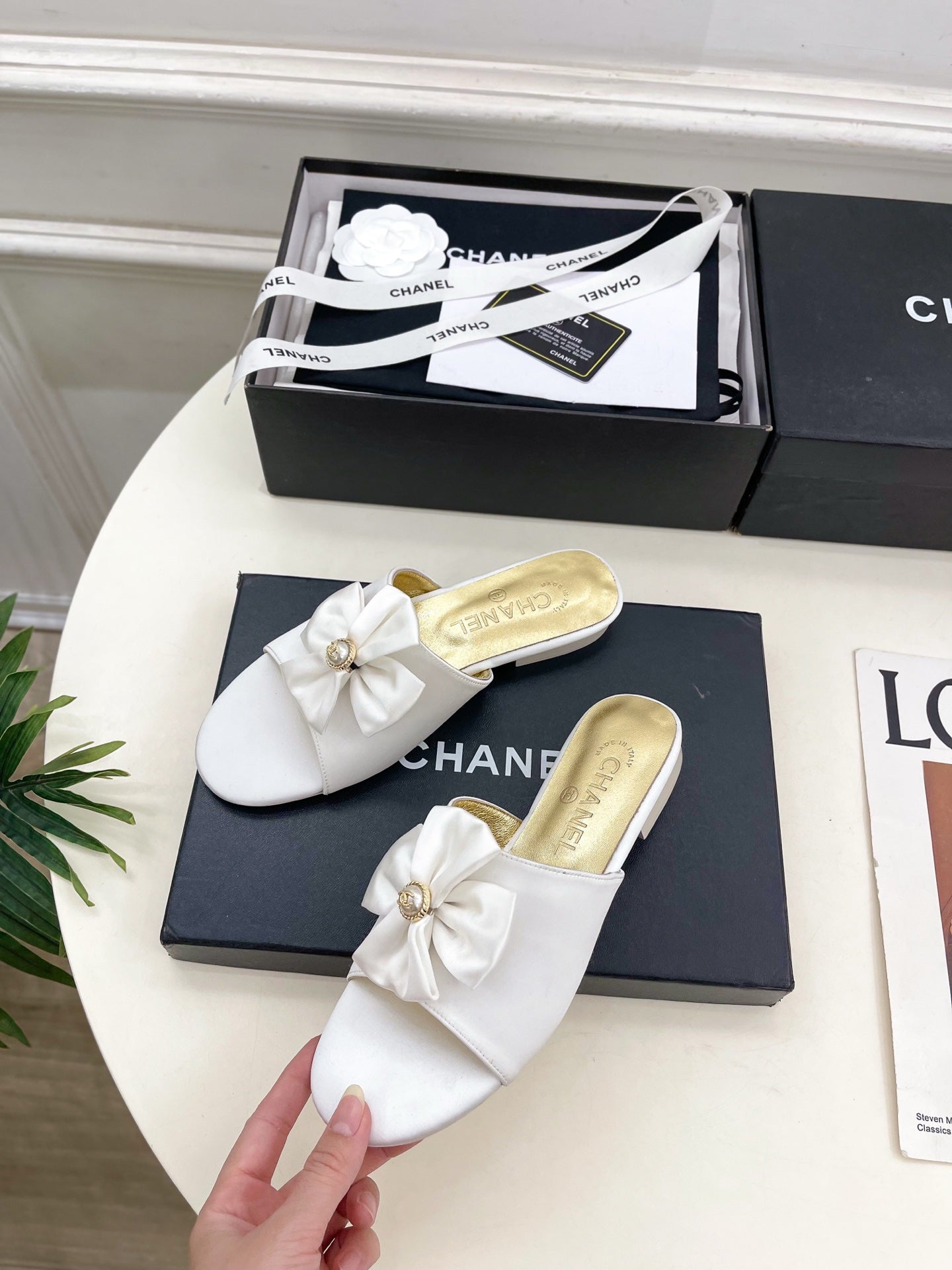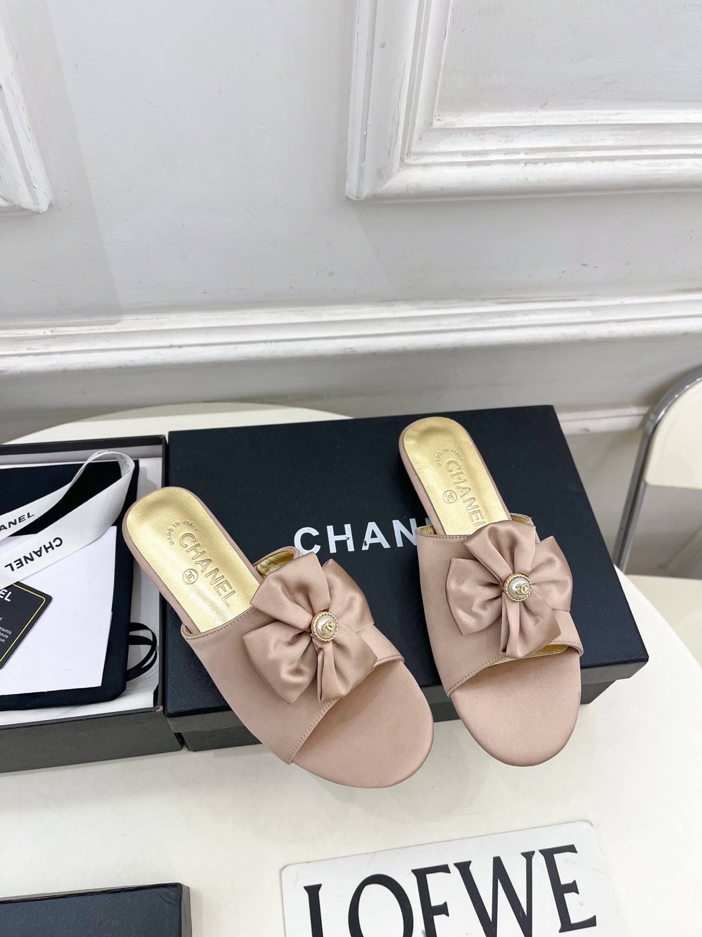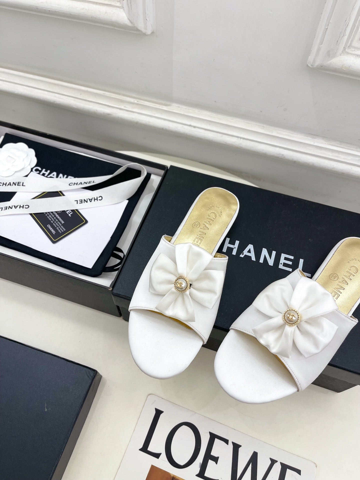 CC 26s Bow Slippers White Satin Sheepskin 586897