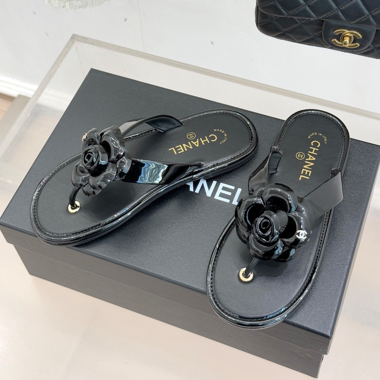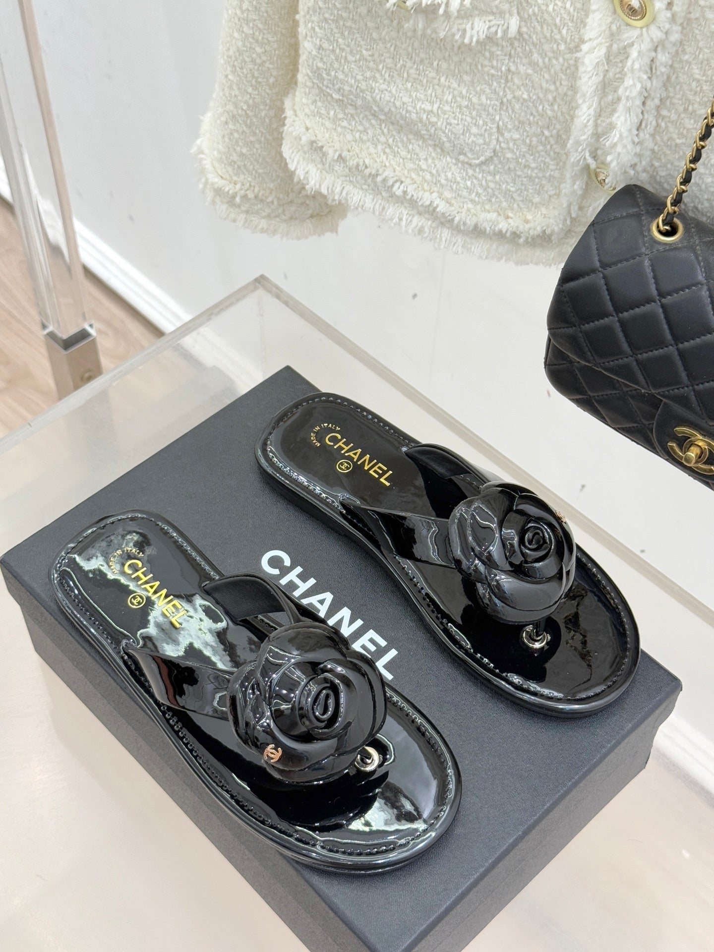 CC 26C Early Spring Camellia Slide Black Patent Leather