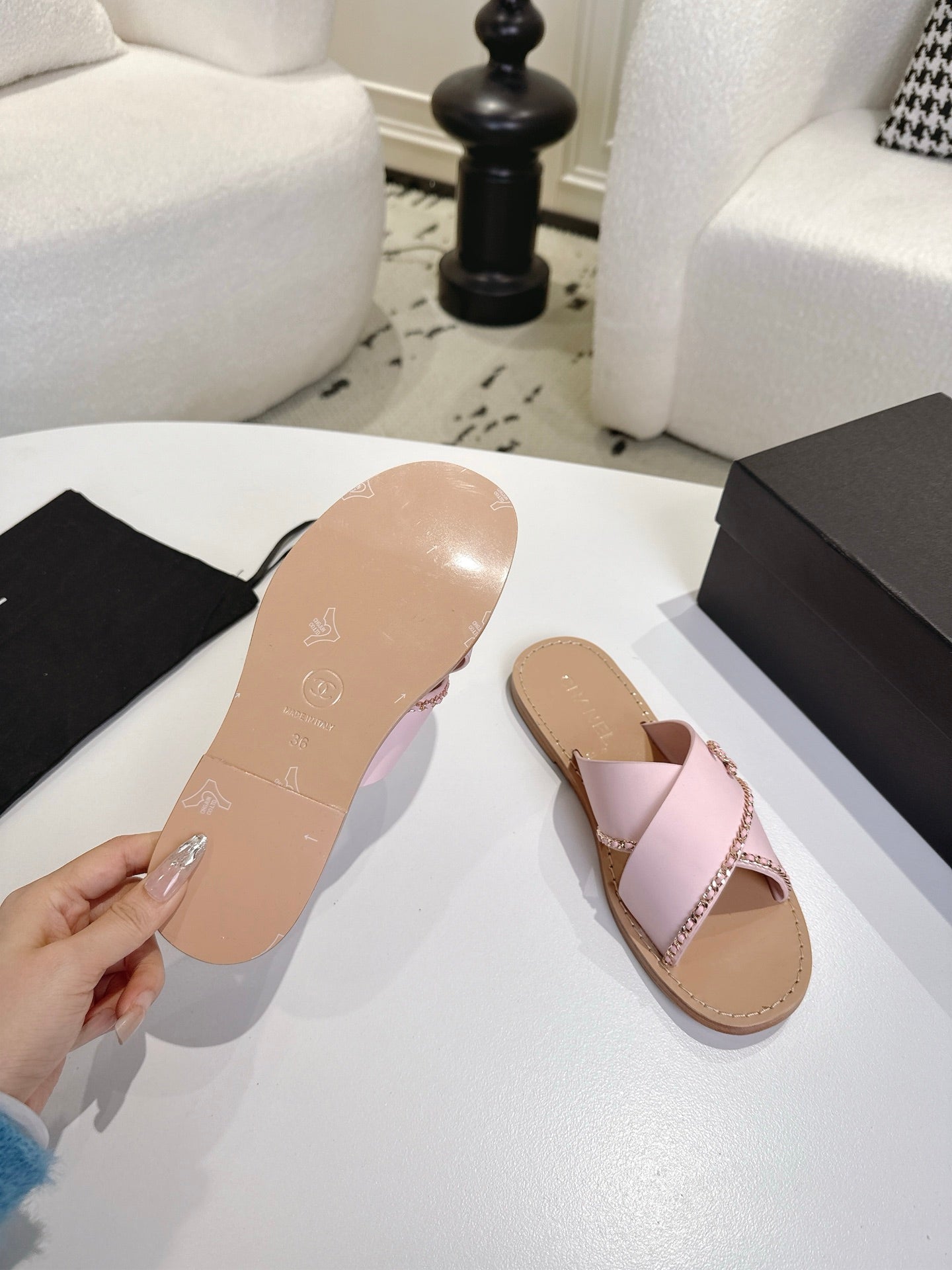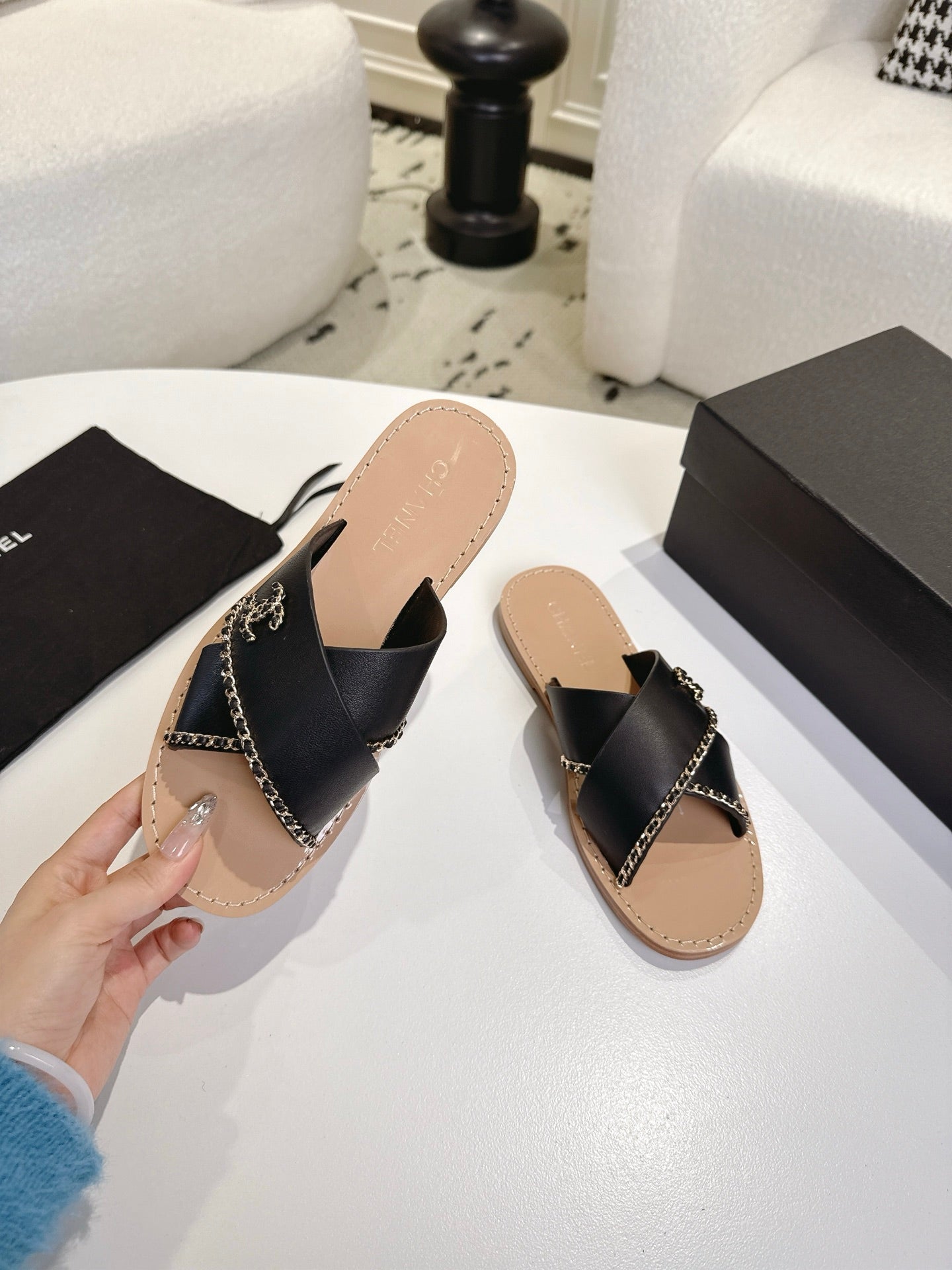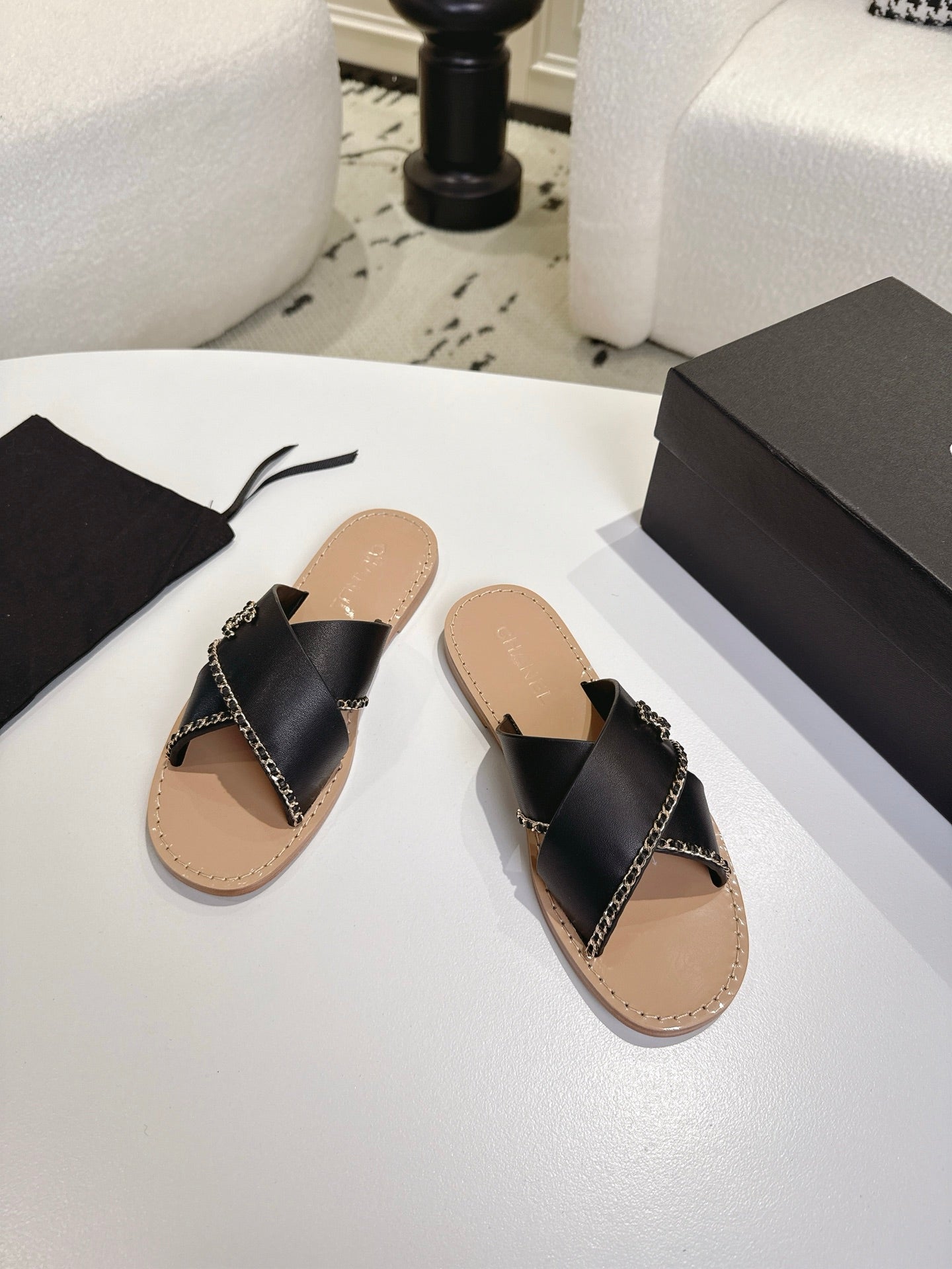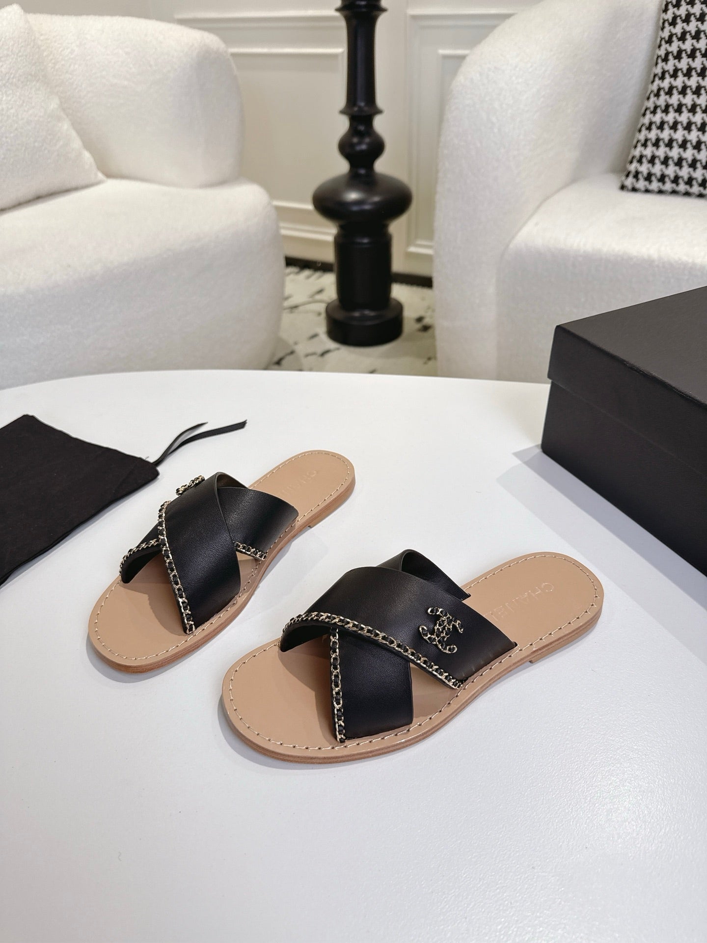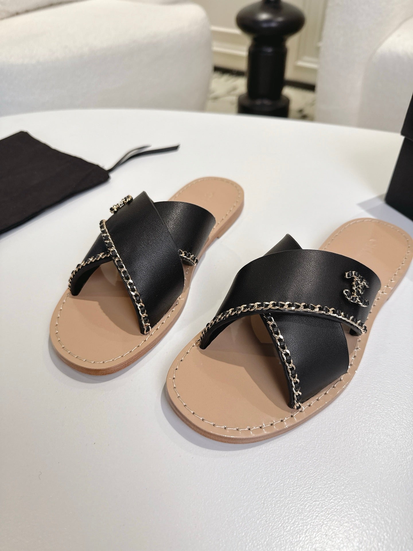 CHANEL 25S MULES WITH CHAIN DETAIL IN BLACK CALFSKIN GOLD HARDWRE