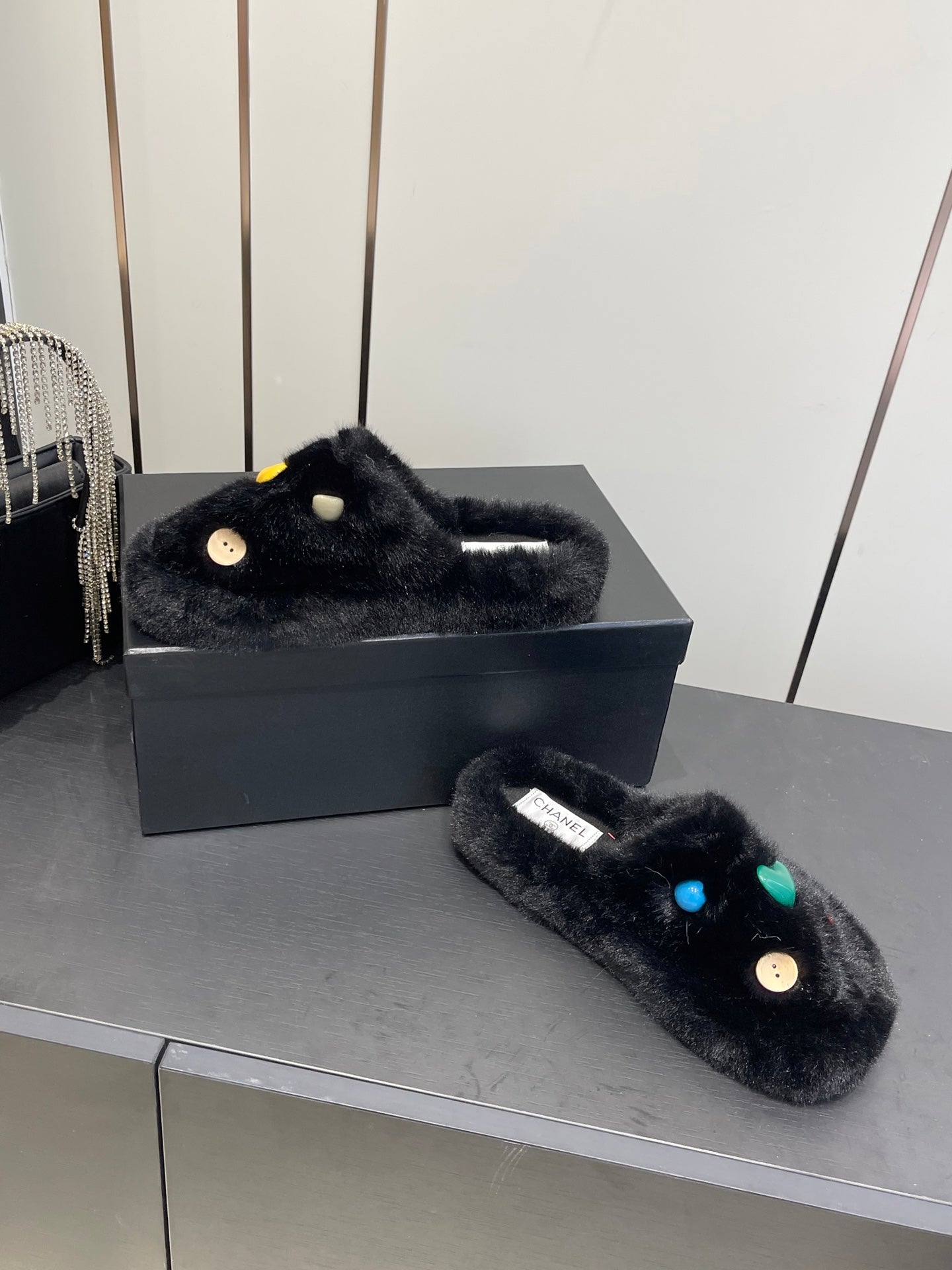 CC Double C Furry Slippers Black Fur 554698