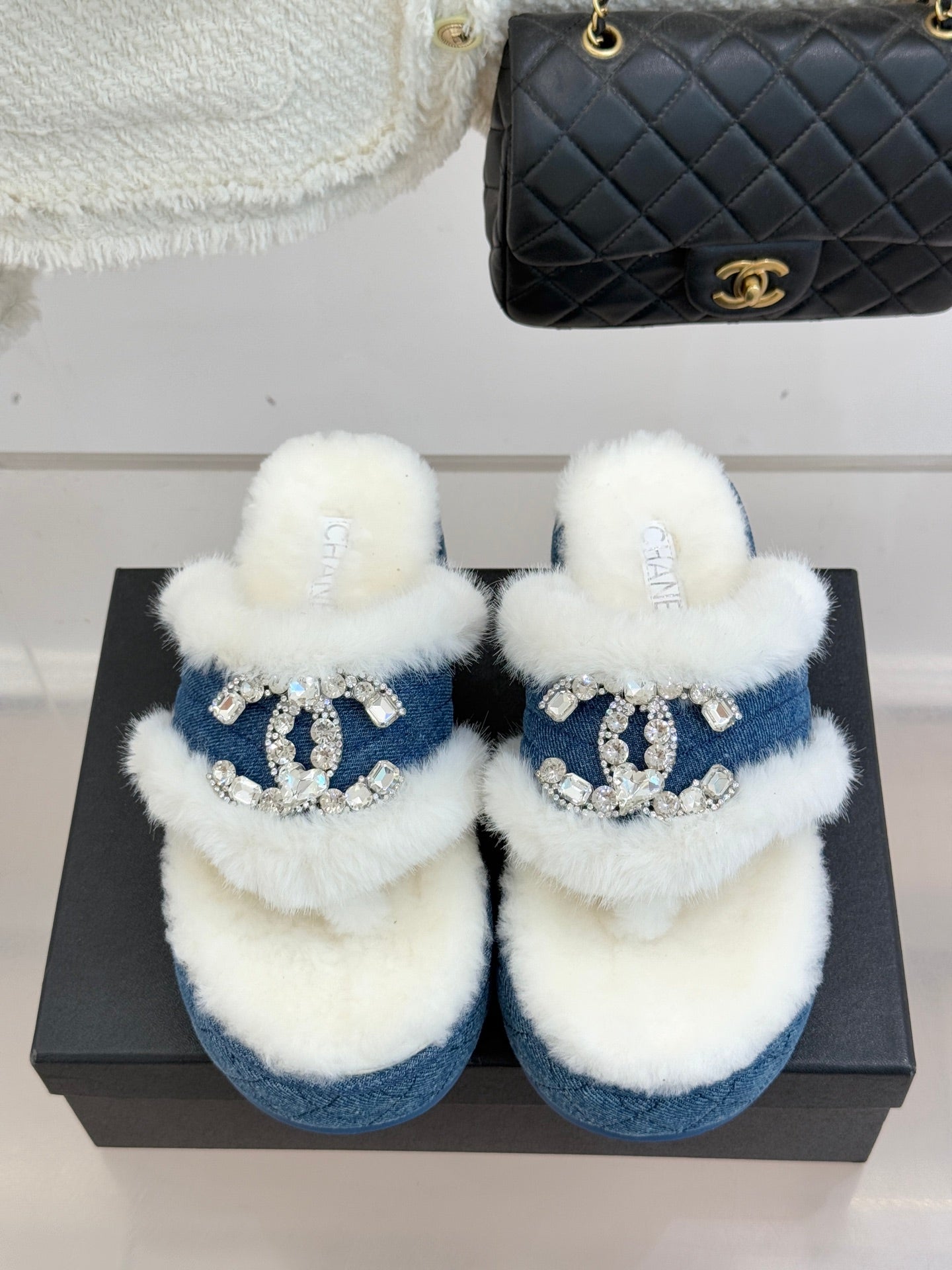 CC slipper double C rhinestone buckle white blue wool 512053