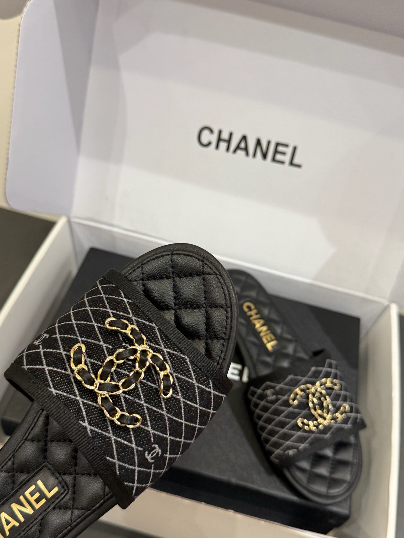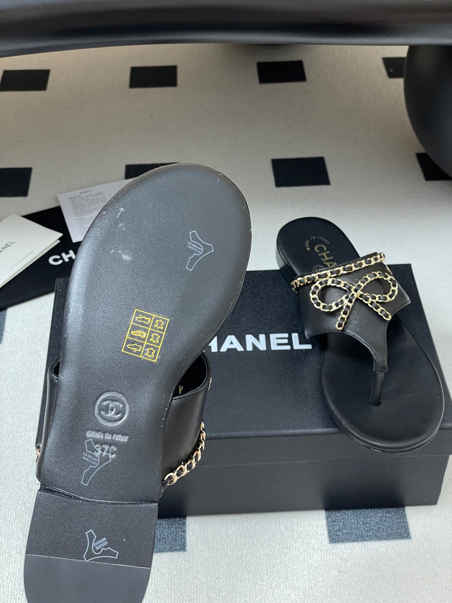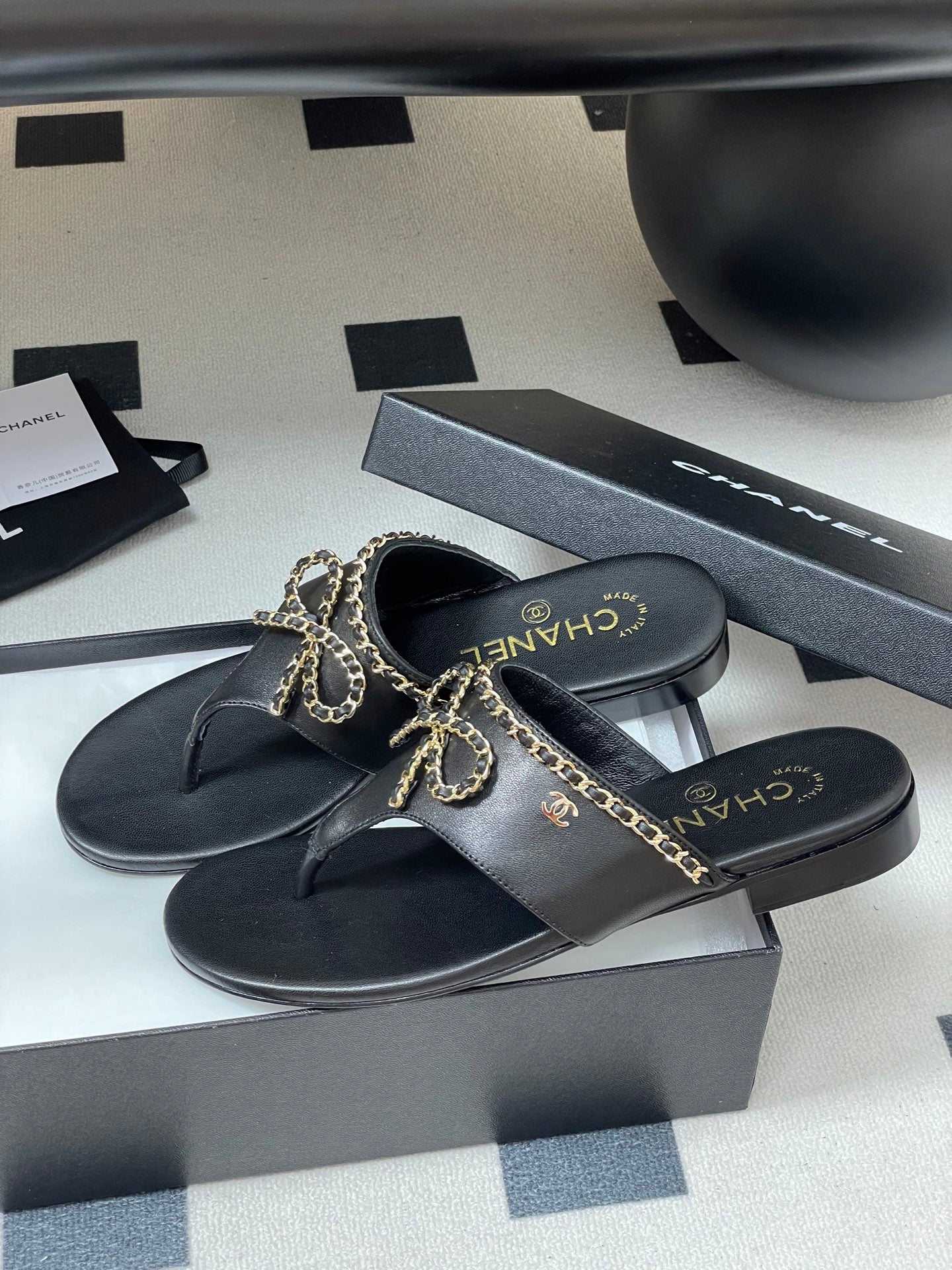 CC 25ss Chain Flat Slippers Black WhiteCowhide & Sheepskin 417563