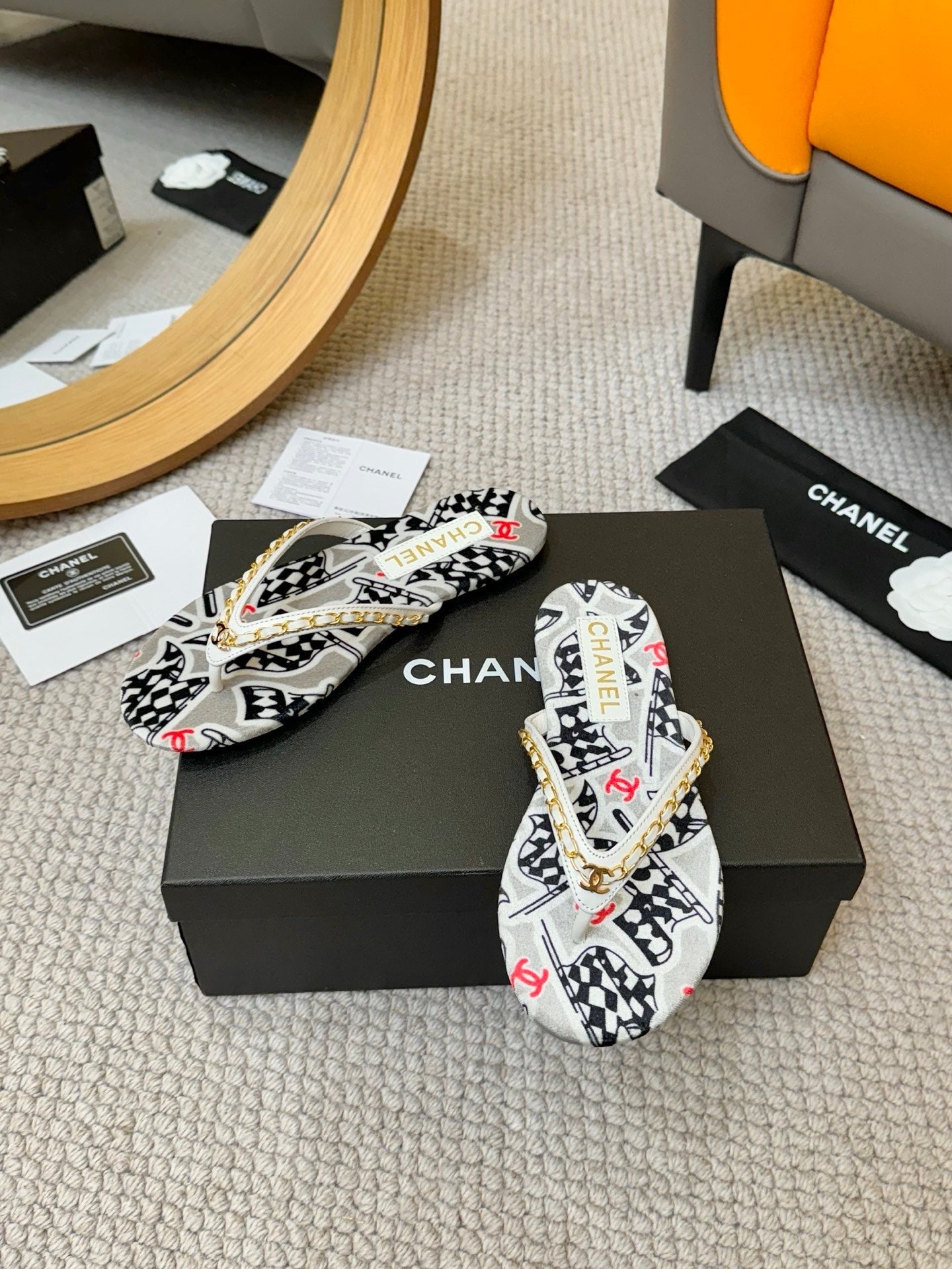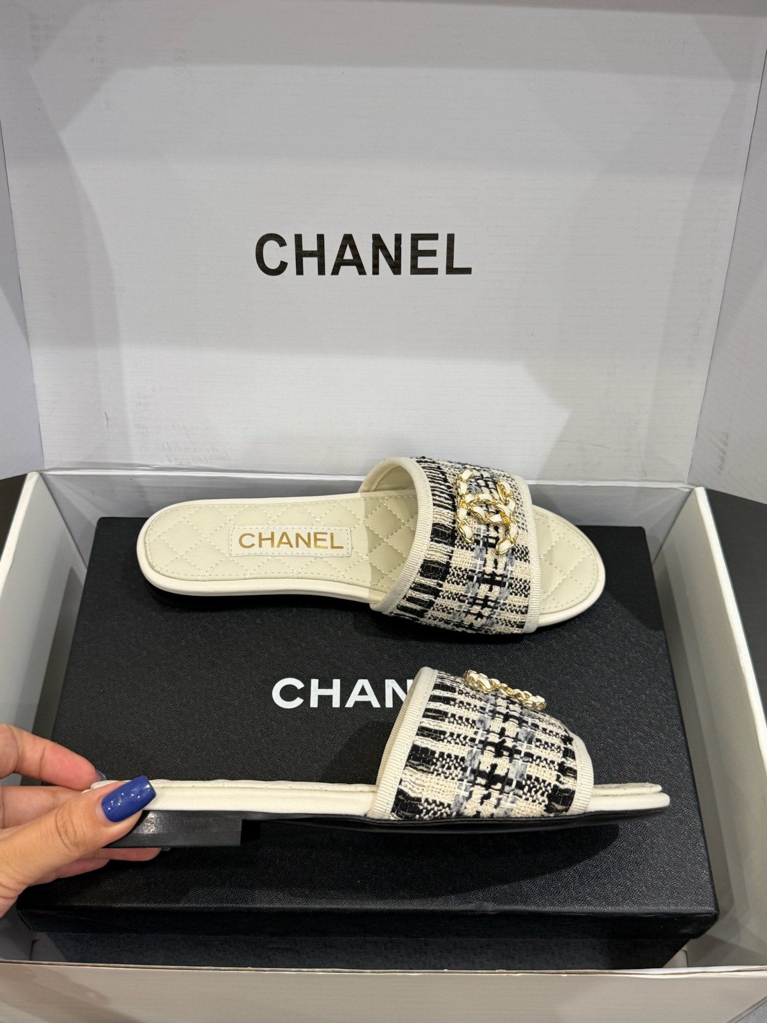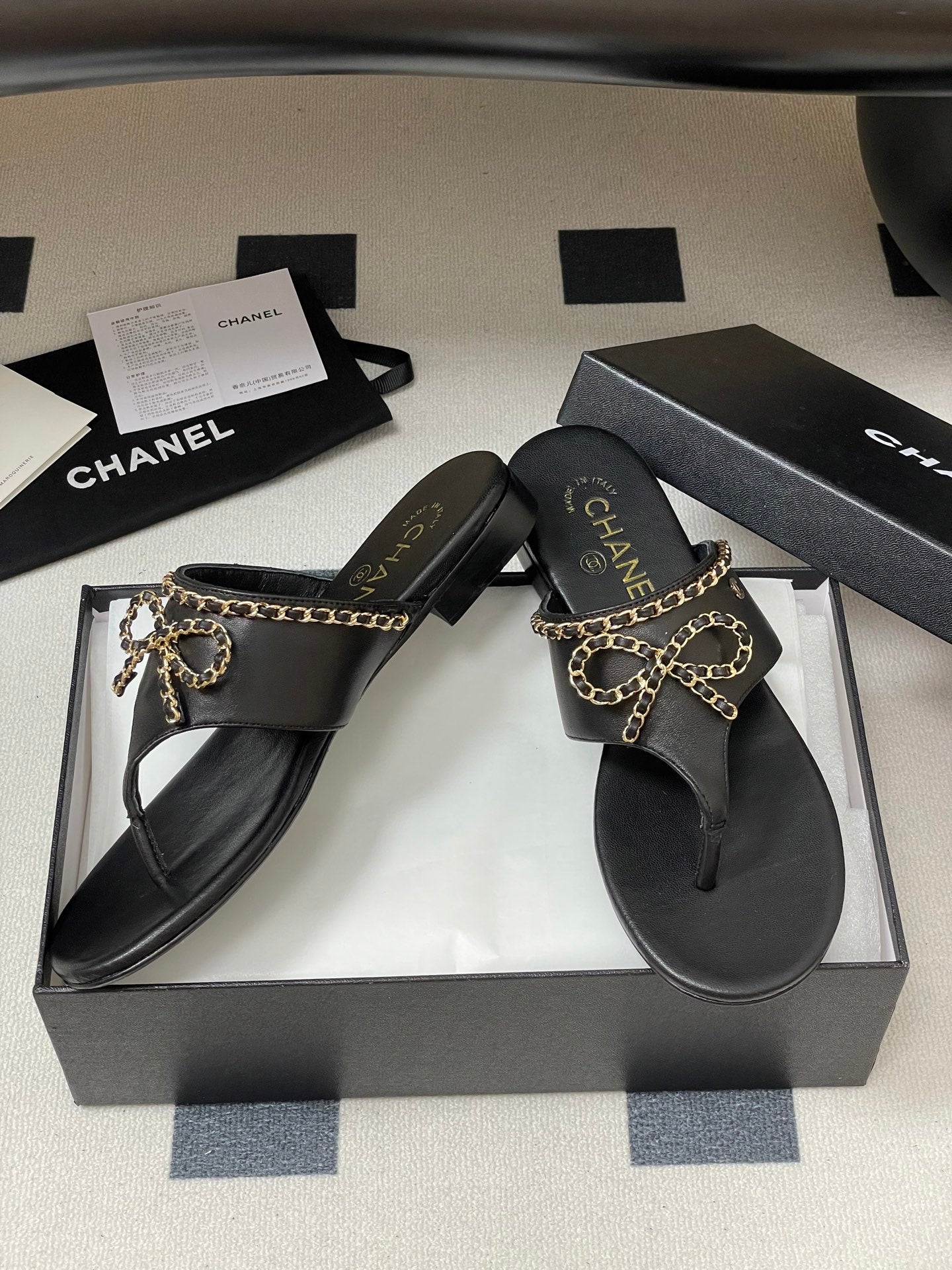 CC 25ss Chain Flat Slippers Black WhiteCowhide & Sheepskin 417563