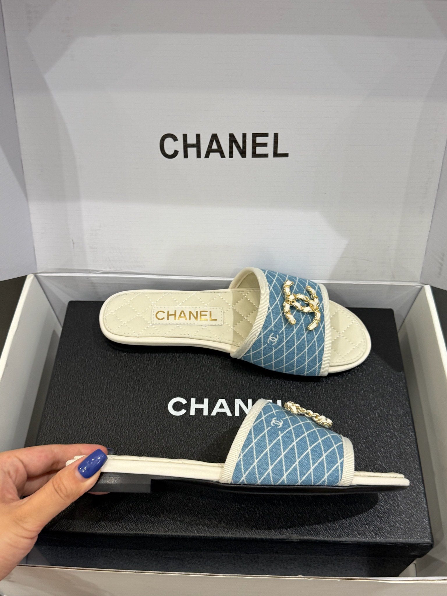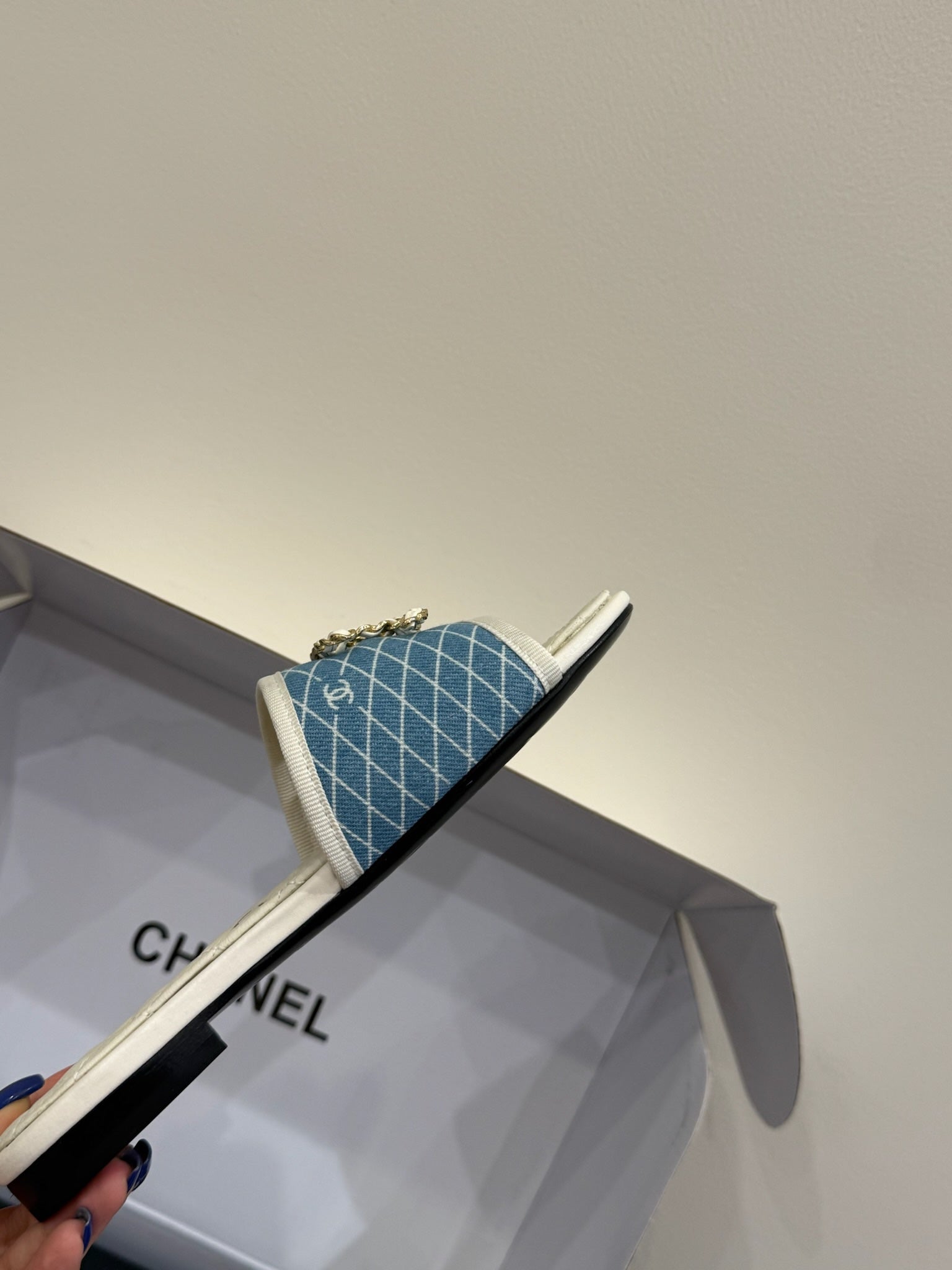 CC 25ss Chain Flat Slippers Blue White Cowhide & Sheepskin 417566