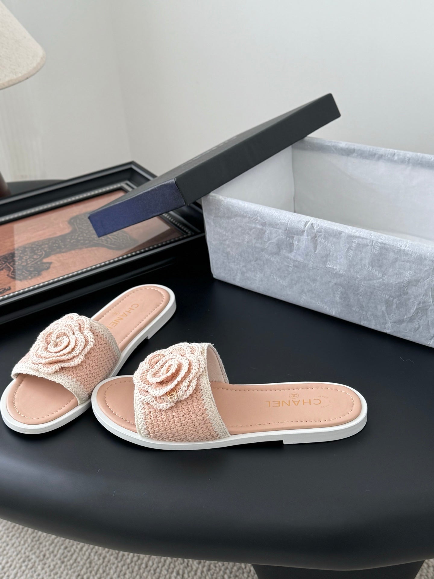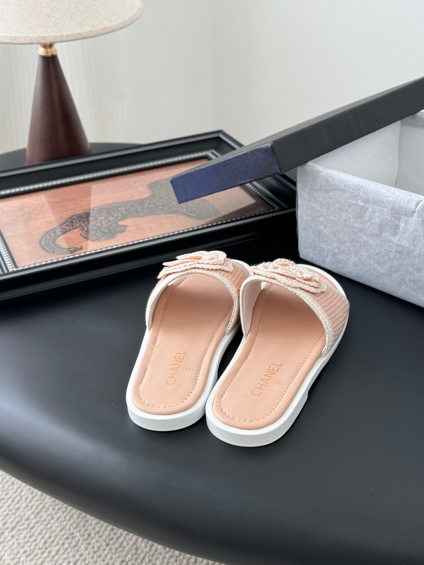 CC 25 Camellia Sandals Beige Black Silk Satin Lambskin 251720